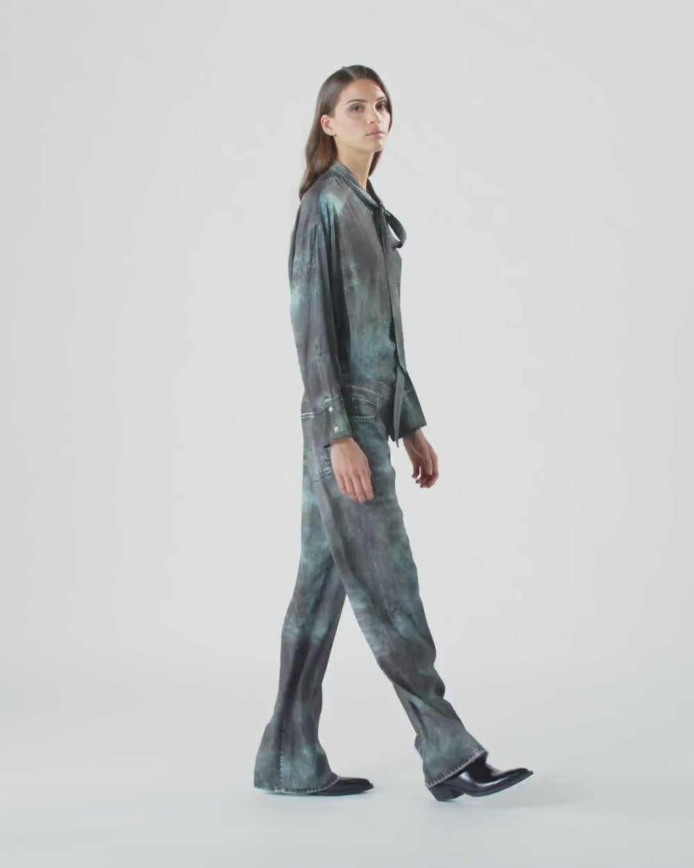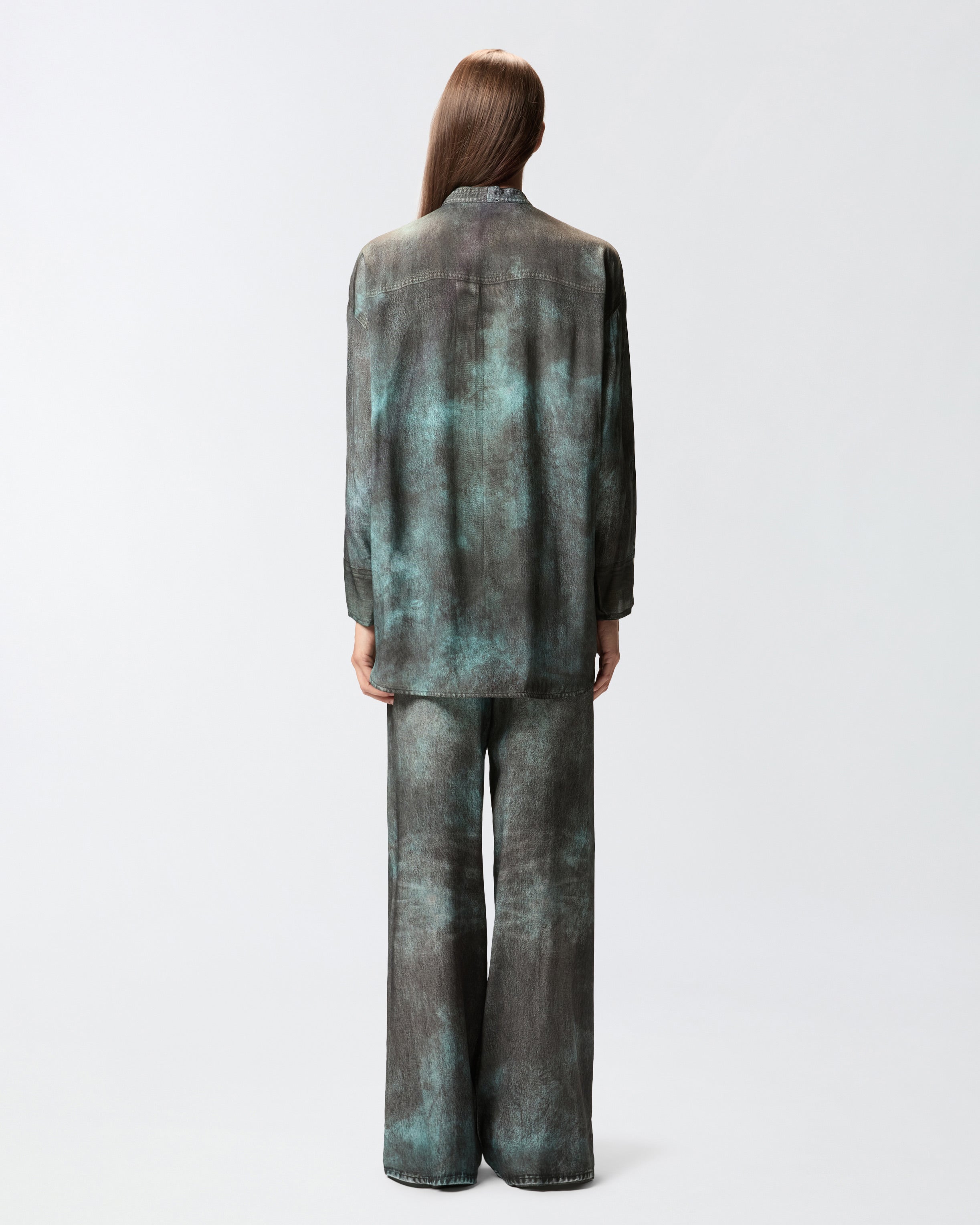 Camicia dalla silhouette rilassata con maniche lunghe, collo lavallière con morbidi nastri da annodare a fiocco e orlo stondato leggermente più lungo sul retro. Il capo è realizzato in twill di viscosa dalla mano fluida e acquisisce tridimensionalità grazie alla ricercata stampa trompe-l'œil che crea l'illusione di un tessuto in denim dall'effetto maltinto e che riproduce gli elementi tipici delle camicie in jeans. Trasforma il tuo outfit in un'opera d'arte e indossa questa camicia con i pantaloni abbinati per un total look originale che non ti farà passare inosservata.
