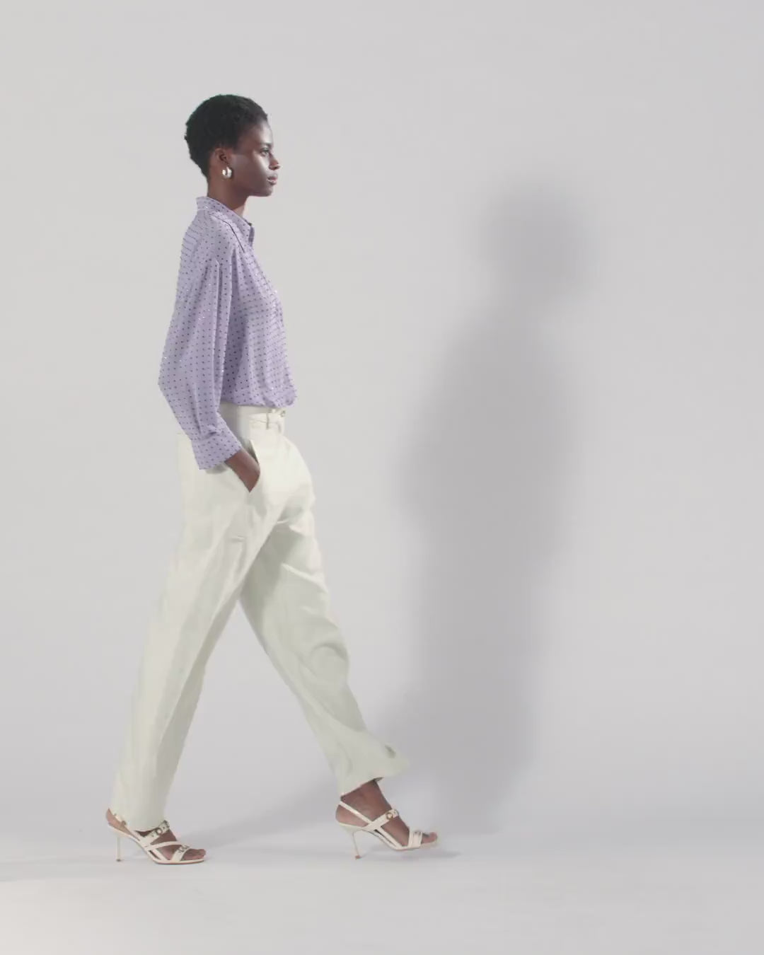Camicia dalla linea dritta con parte superiore leggermente più voluminosa, dotata di colletto classico e maniche lunghe con spalla scesa e polsino. Il modello è realizzato in un tessuto georgette dal raffinato aspetto opaco che accompagna il corpo con delicatezza e permette di ottenere una silhouette fluida e leggera, ed è impreziosito da brillanti strass disposti su tutta la superficie del capo, perfetta espressione del DNA PINKO. La camicia è completata dalla chiusura frontale nascosta con soltanto il primo bottone visibile, per offrire un tocco di funzionalità discreta senza interrompere la continuità della decorazione.