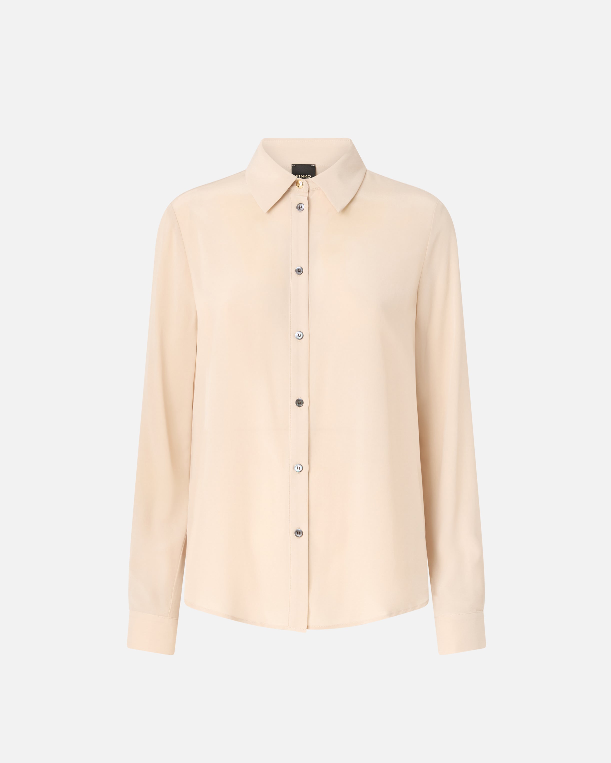 Camicia classica con colletto piccolo, maniche lunghe completate da polsino con bottoni e raffinato carré posteriore con sfondo piega. Il capo è realizzato in crêpe de Chine di pura seta con trattamento sand wash, che attenua la lucentezza del tessuto conferendogli un aspetto leggermente vissuto. Il primo bottone della chiusura è in metallo ed è decorato da stella. Abbina la camicia a un paio di jeans per elevare il tuo look quotidiano con un capo femminile e originale che non passa inosservato.