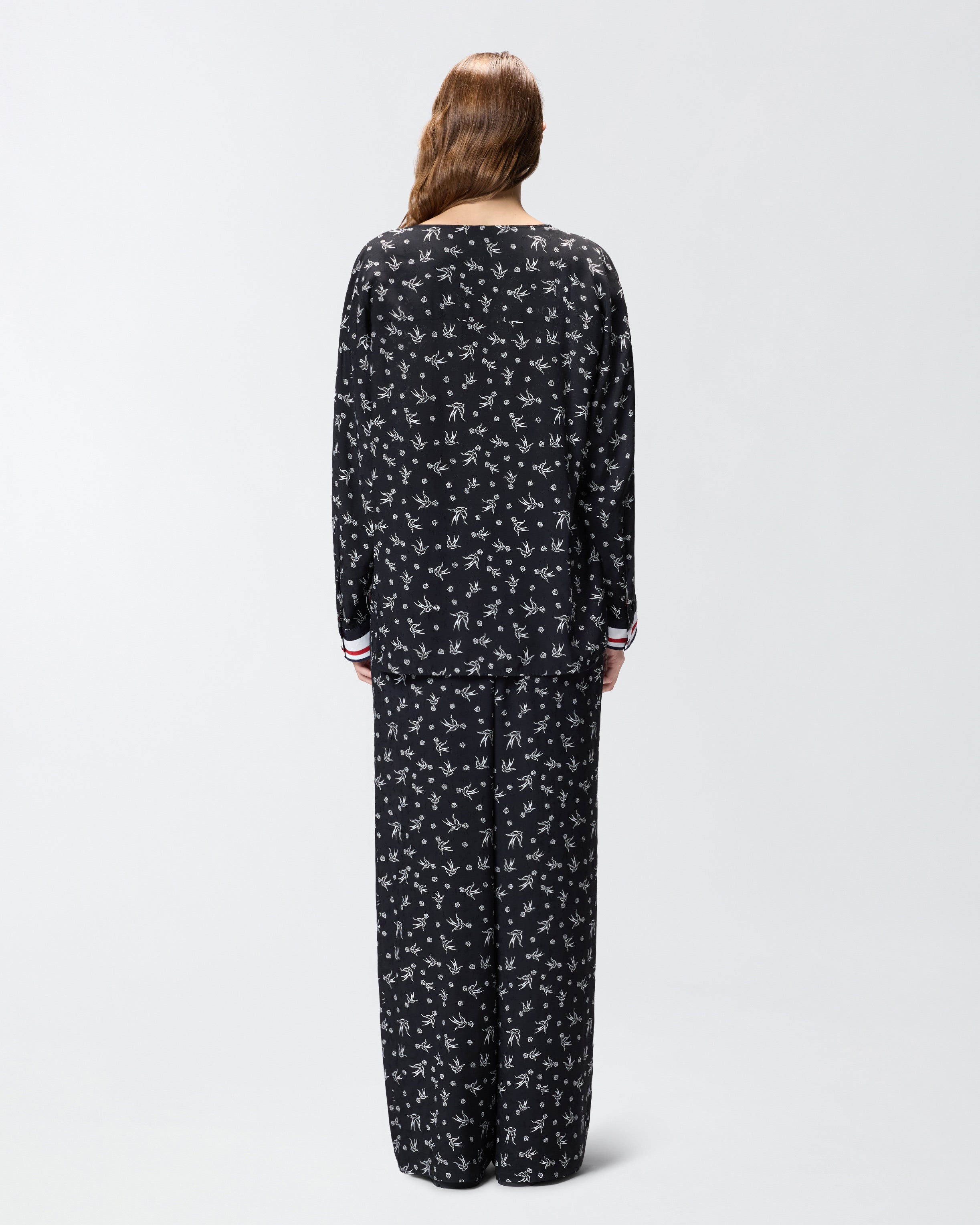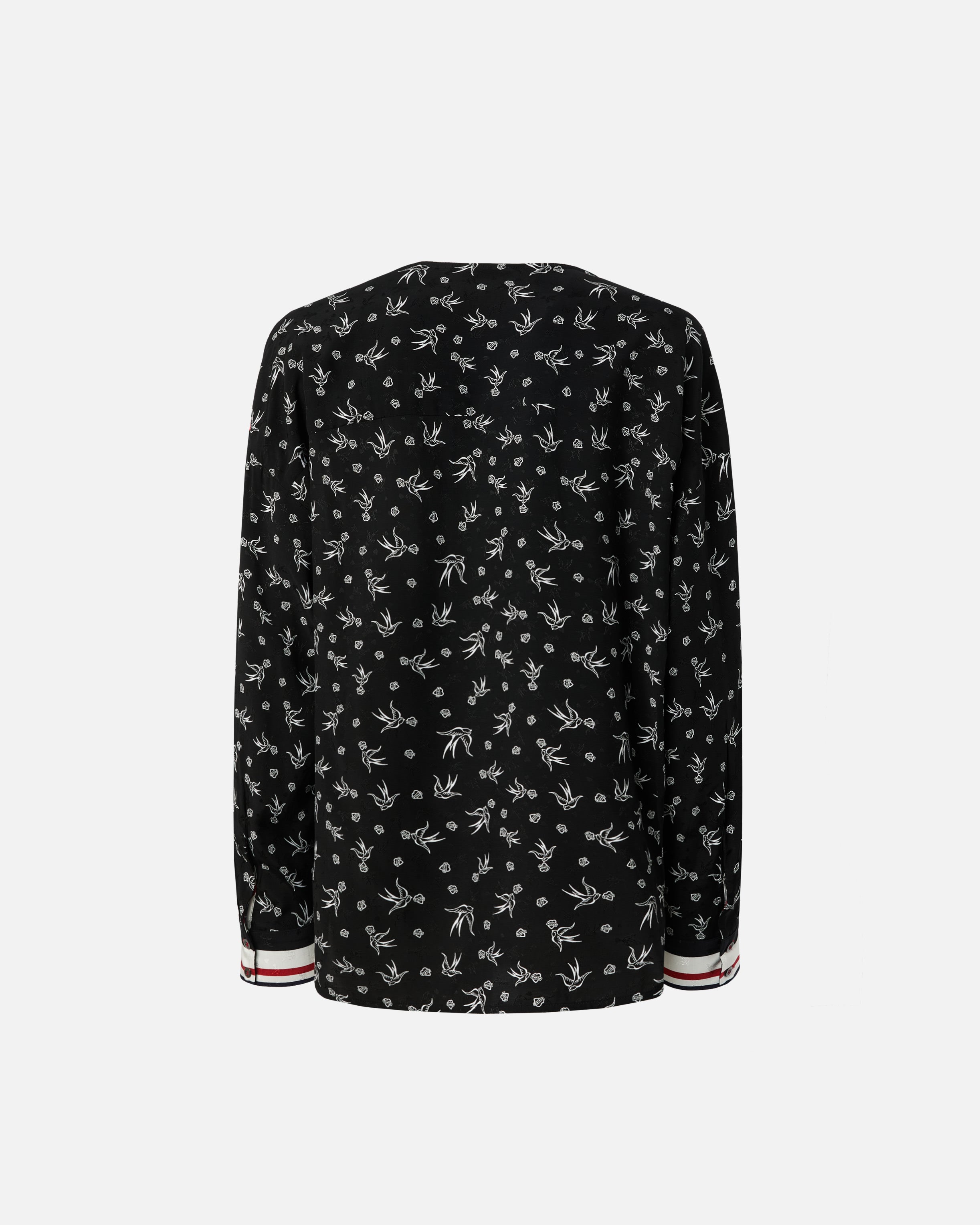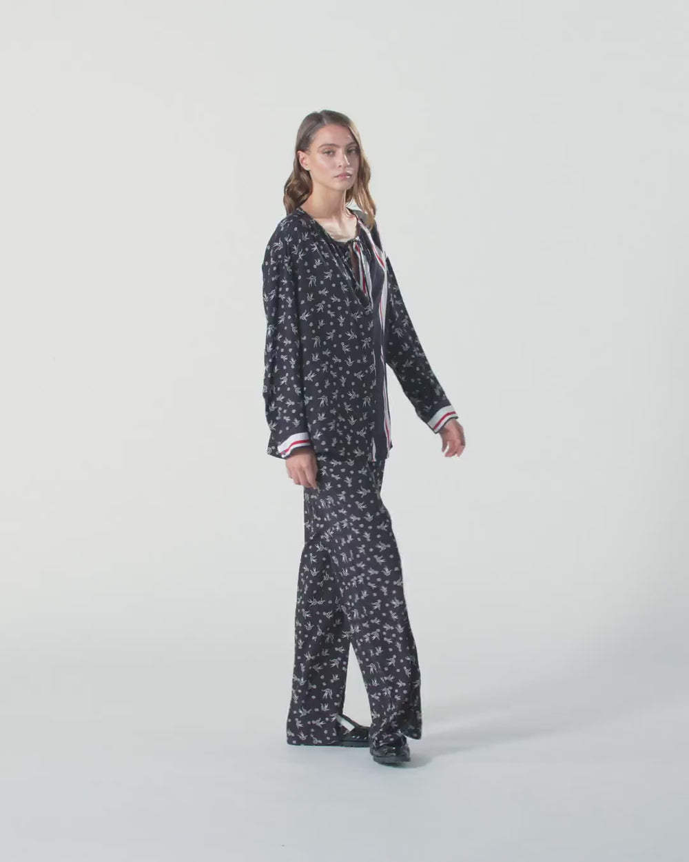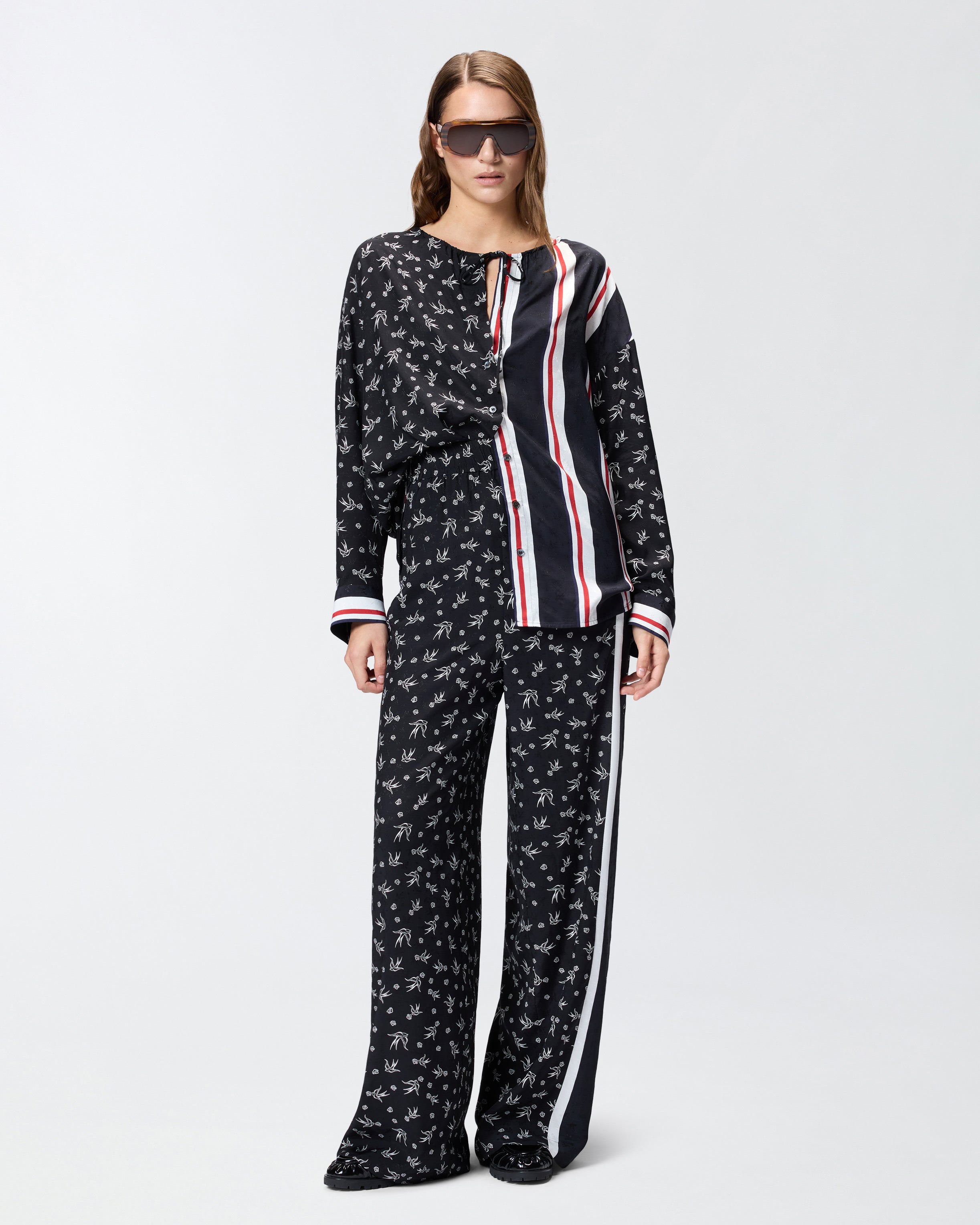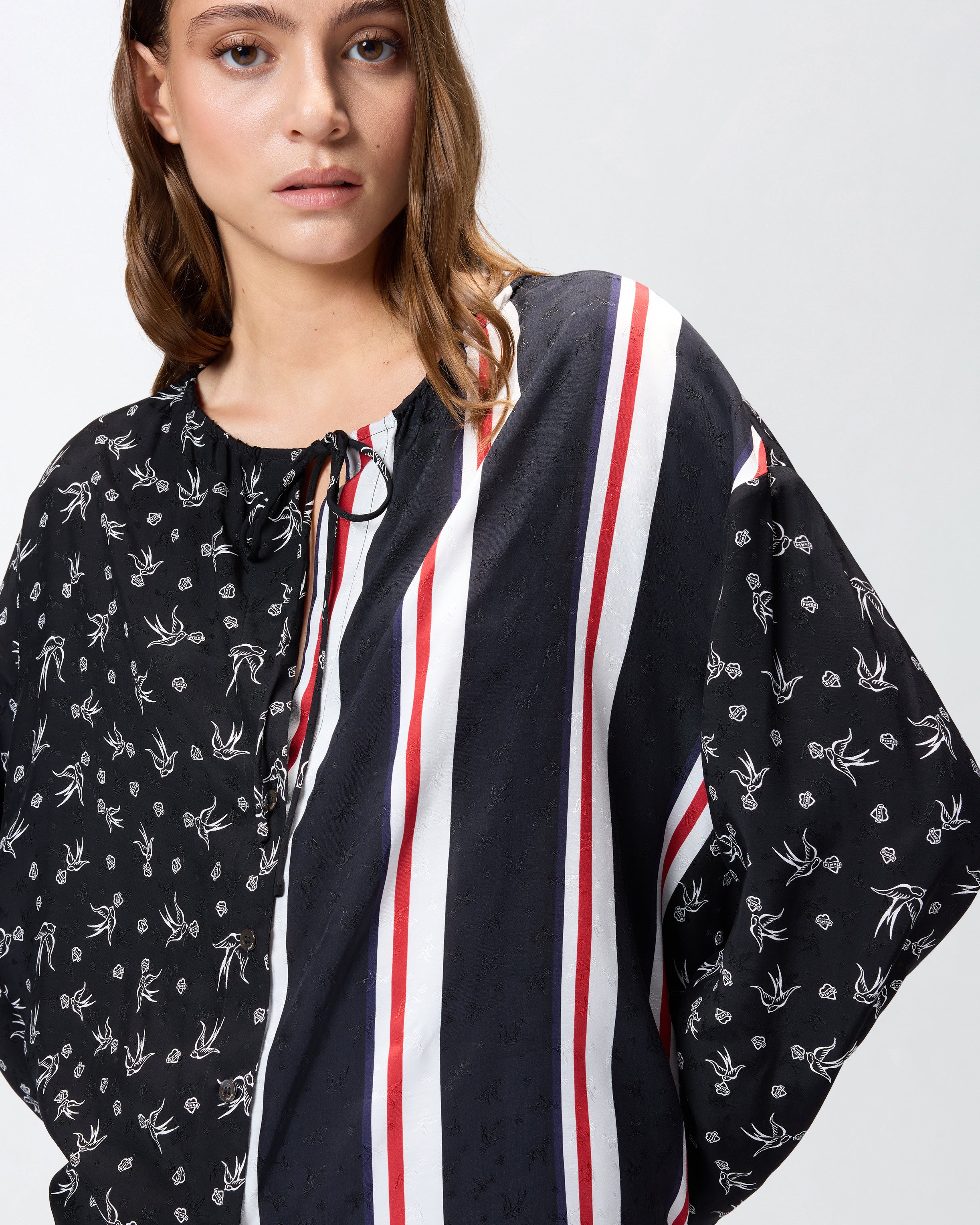 Camicia dalla linea morbida con collo tondo regolabile tramite coulisse. Il capo è realizzato in viscosa jacquard e la texture è personalizzata da un motivo con logo Love Birds all over e da una stampa piazzata con righe a contrasto su una metà della parte frontale e sui polsini. La fluidità di questo capo saprà stupirti per le cerimonie e occasioni speciali, soprattutto in total look con il pantalone abbinato.