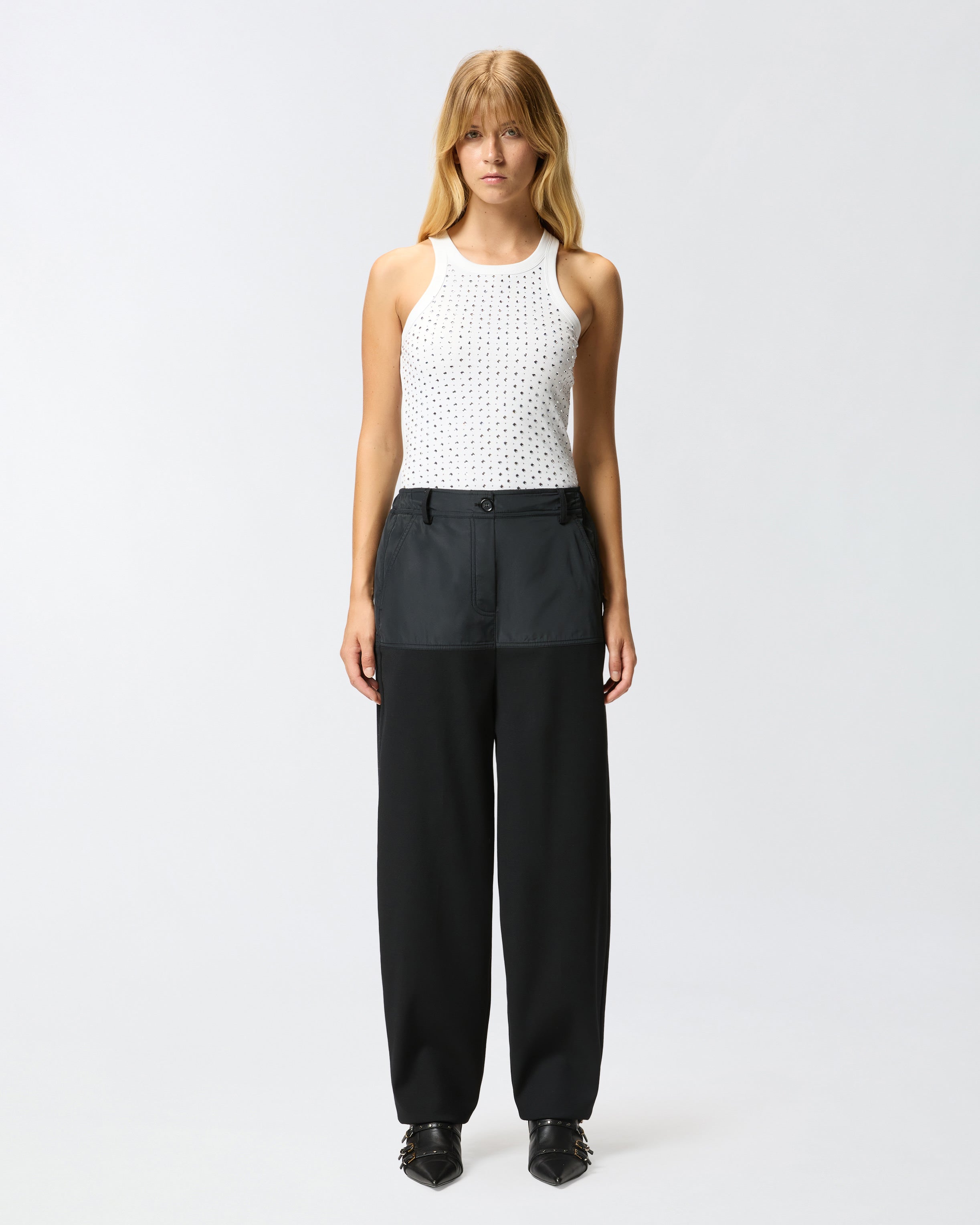 Canotta aderente con scollo a vogatore, realizzata in misto cotone a costine e decorata da un motivo di mini borchie rotonde e strass romboidali sul davanti. La lavorazione dona al capo un effetto luminoso e prezioso che eleva l'essenzialità della silhouette.