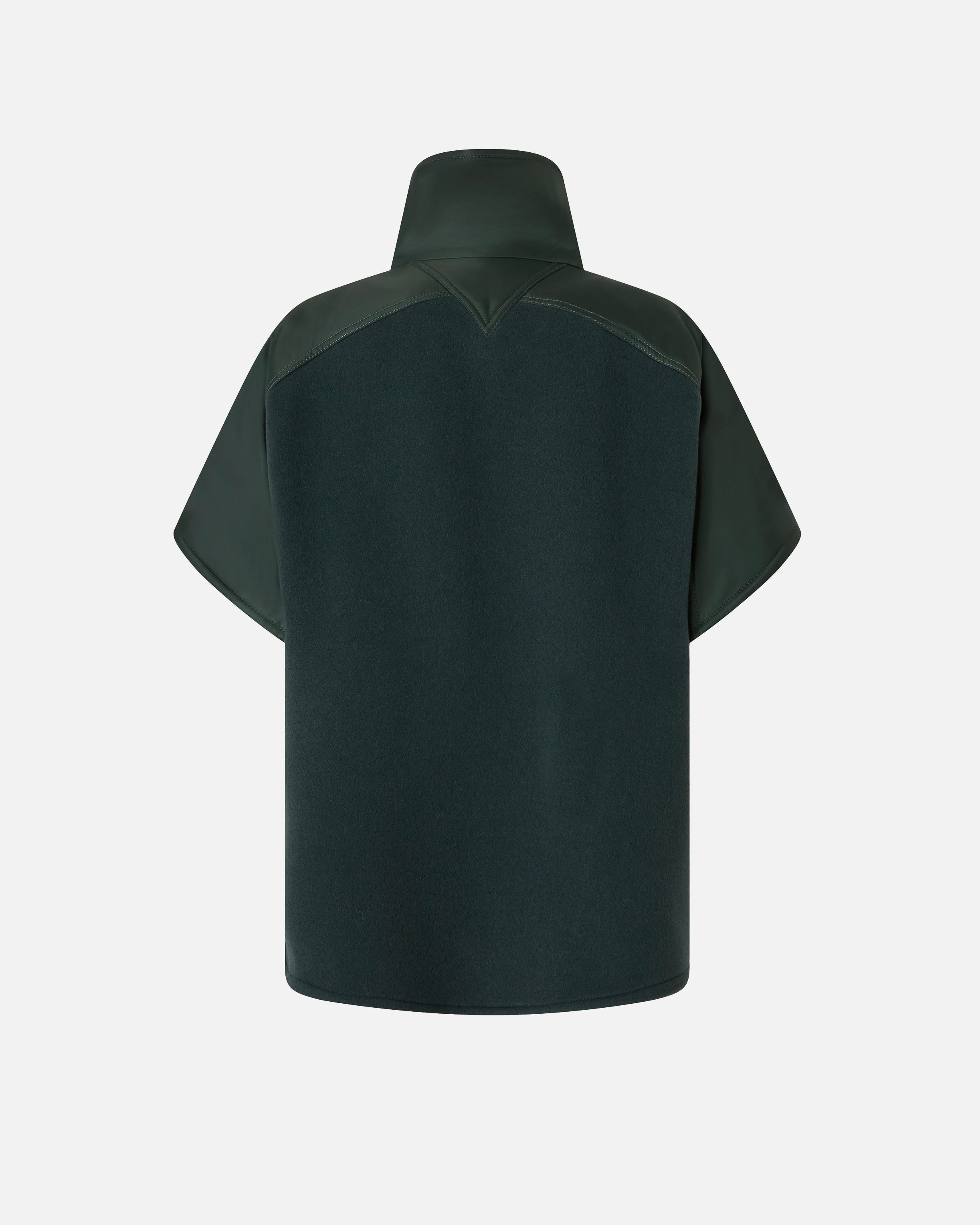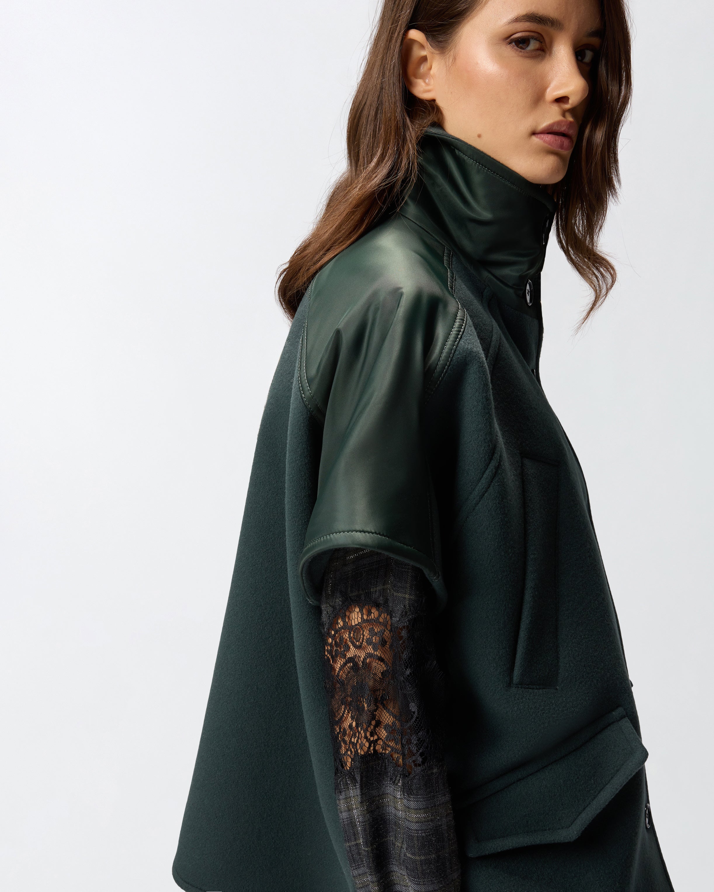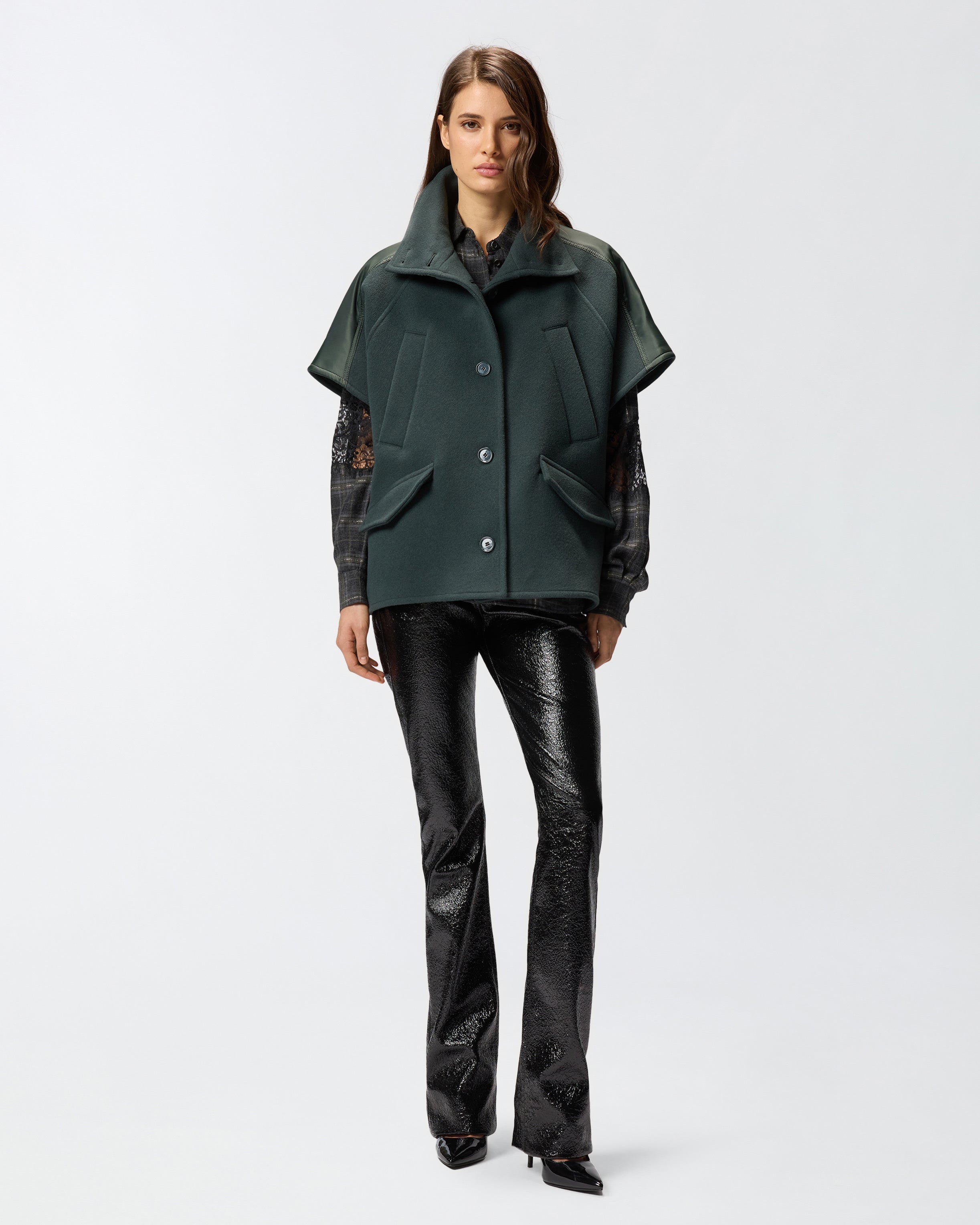 Cappa corta con maniche corte e doppie tasche a pattina e a filetto sul davanti. Il modello è realizzato in caldo e morbido panno di misto lana con collo alto, spalle e carré in satin tecnico a contrasto. Chiusura con bottoni davanti. Grazie al suo design inedito ma funzionale, questa mantella è pronta a diventare il tuo nuovo capospalla preferito in puro stile PINKO.