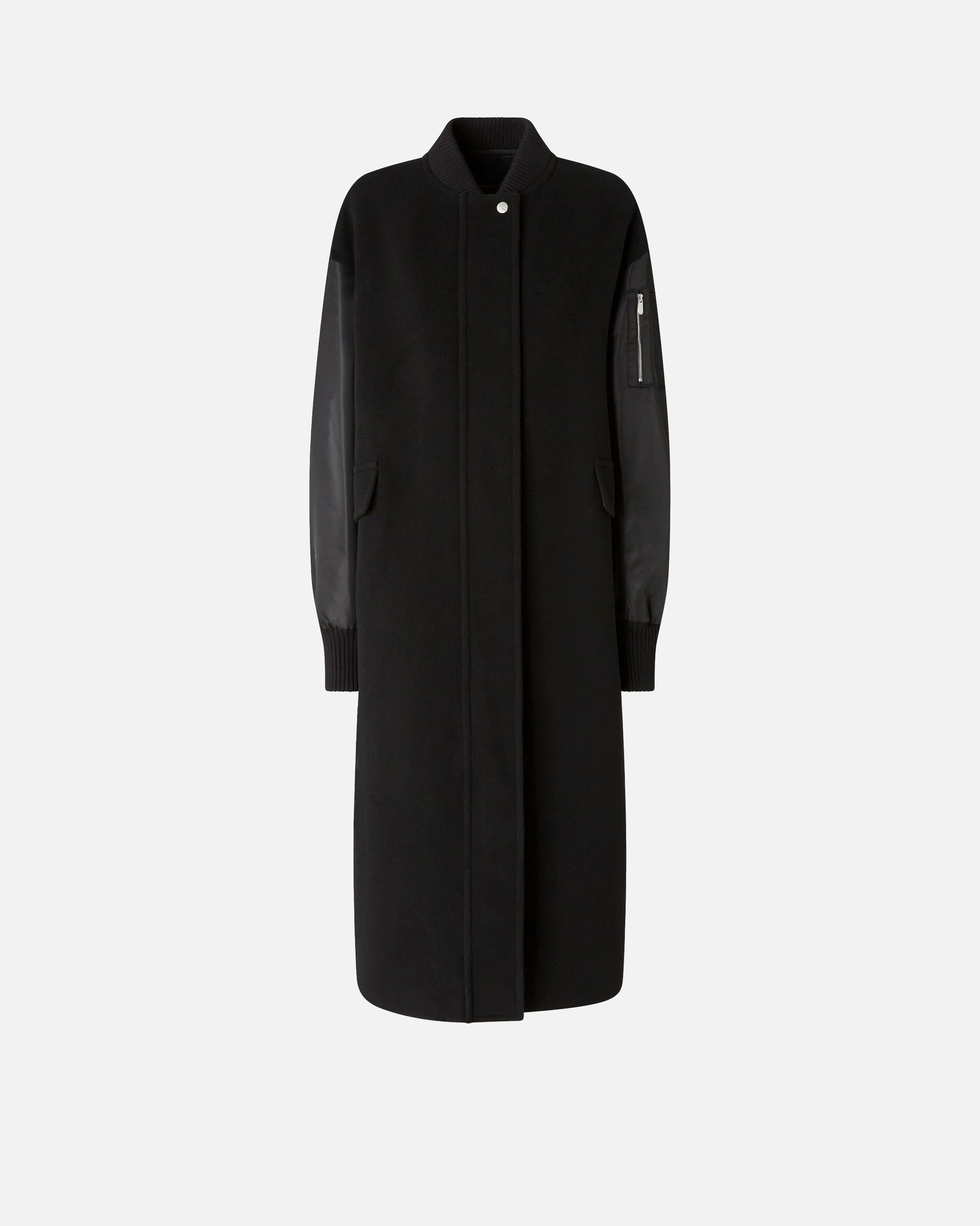 Cappotto lungo foderato con collo bomber, tasche a pattina e tasca con zip su una manica. Il modello è realizzato in caldo e morbido panno di misto lana con maniche lunghe in satin tecnico. Lavorazione a costine su collo e polsini. La chiusura è nascosta, soltanto il primo bottone è visibile. Il capospalla è ideale per accompagnarti nelle giornate più fresche di inizio stagione all'aperto, con il massimo comfort, senza rinunciare a un tocco di stile.