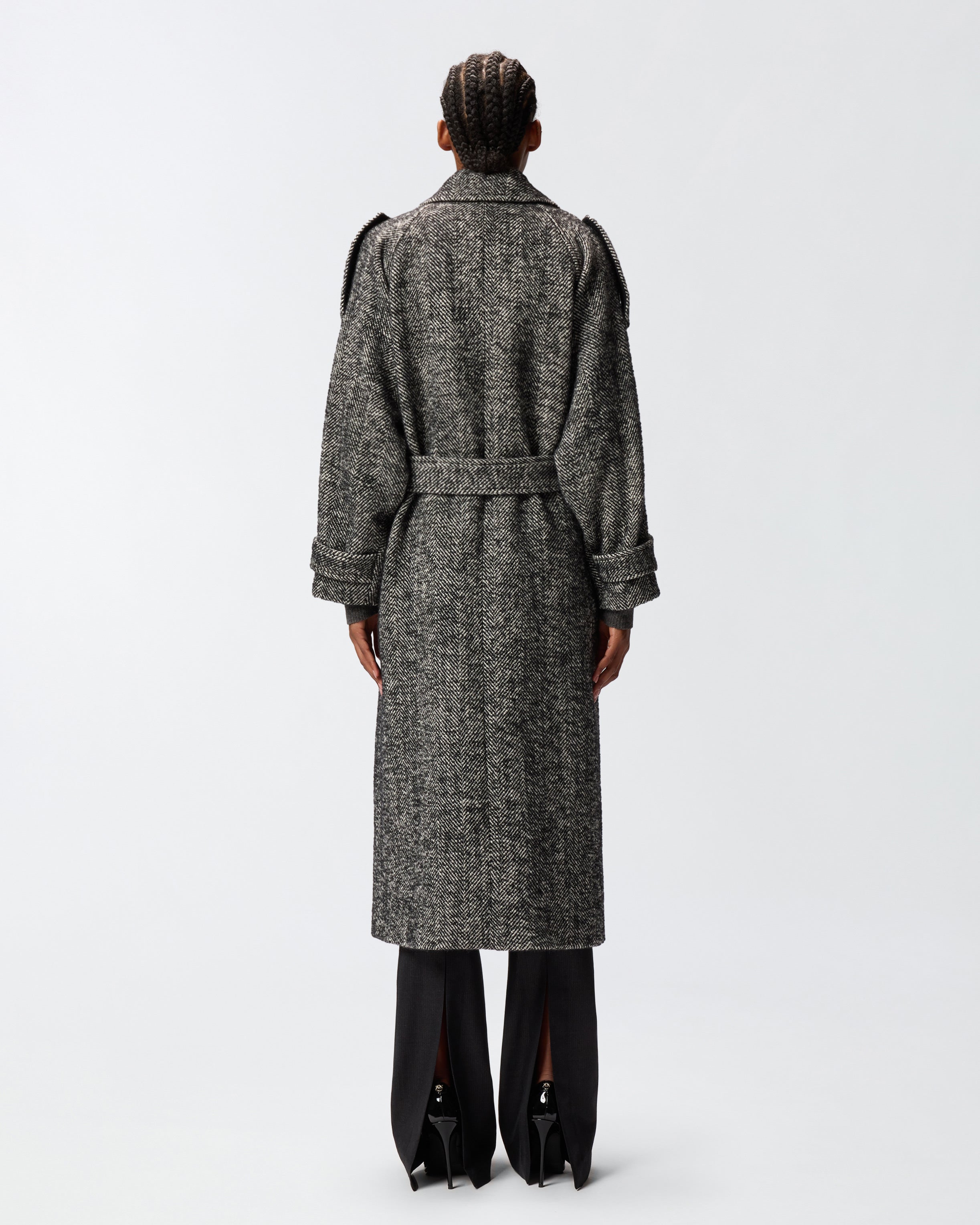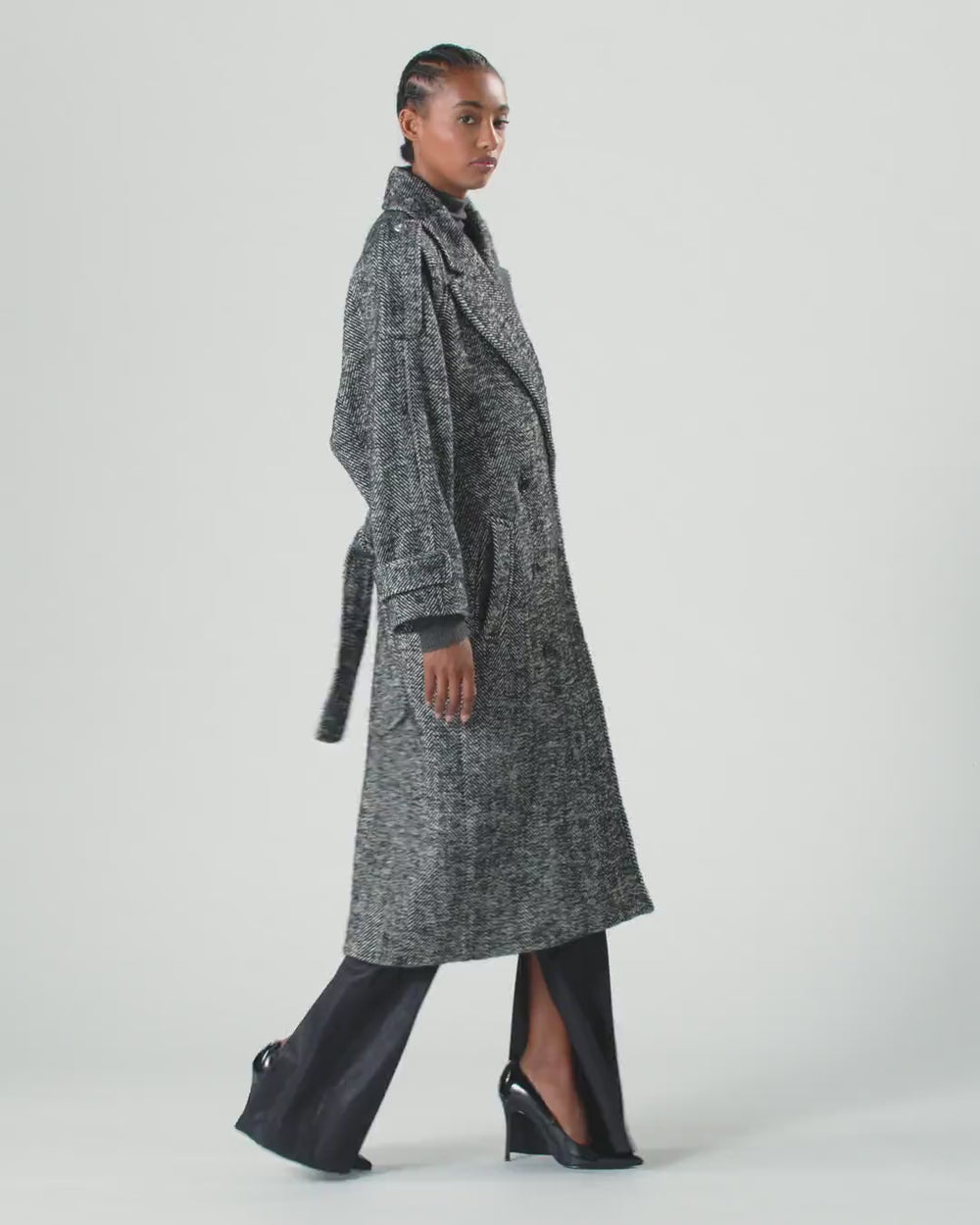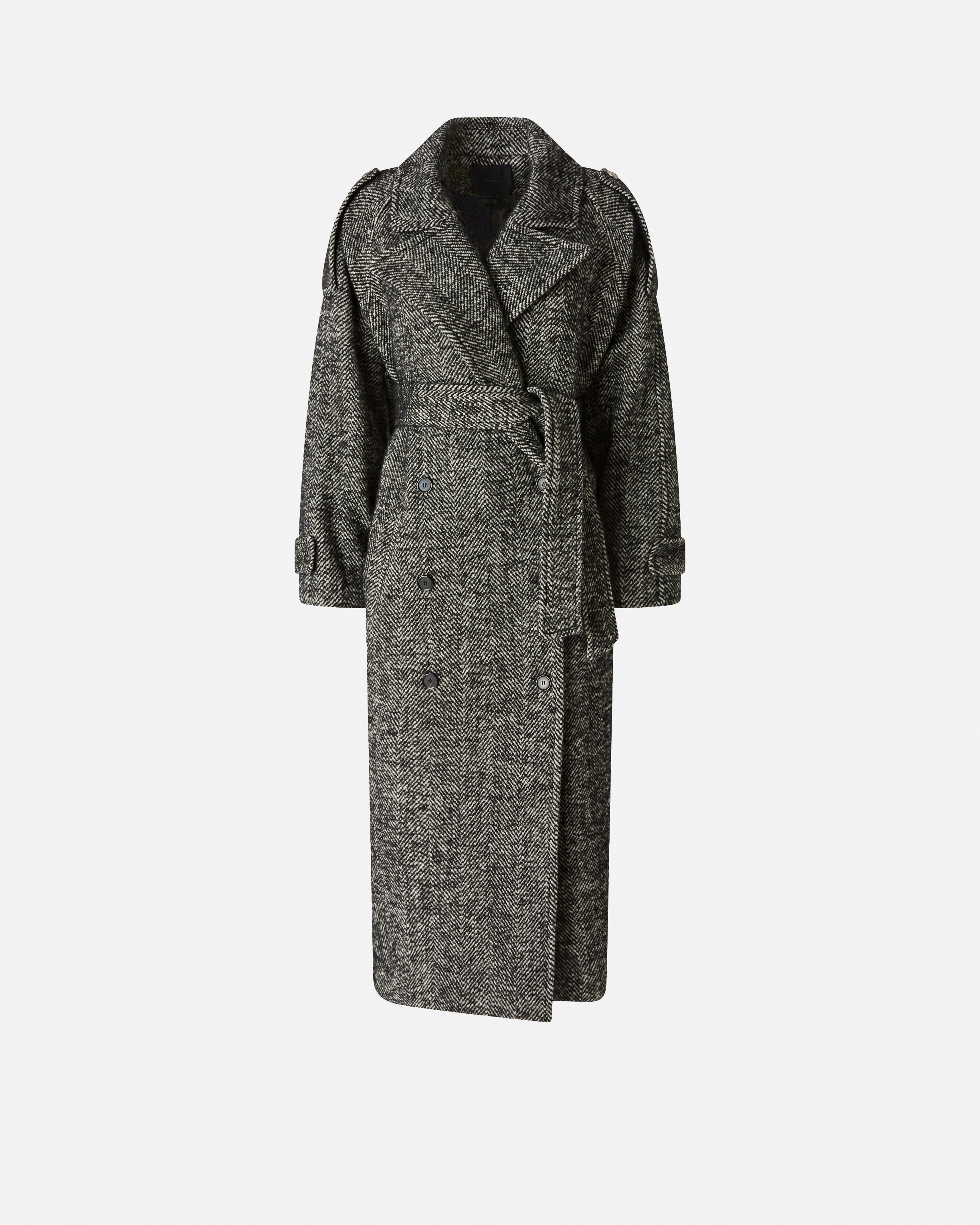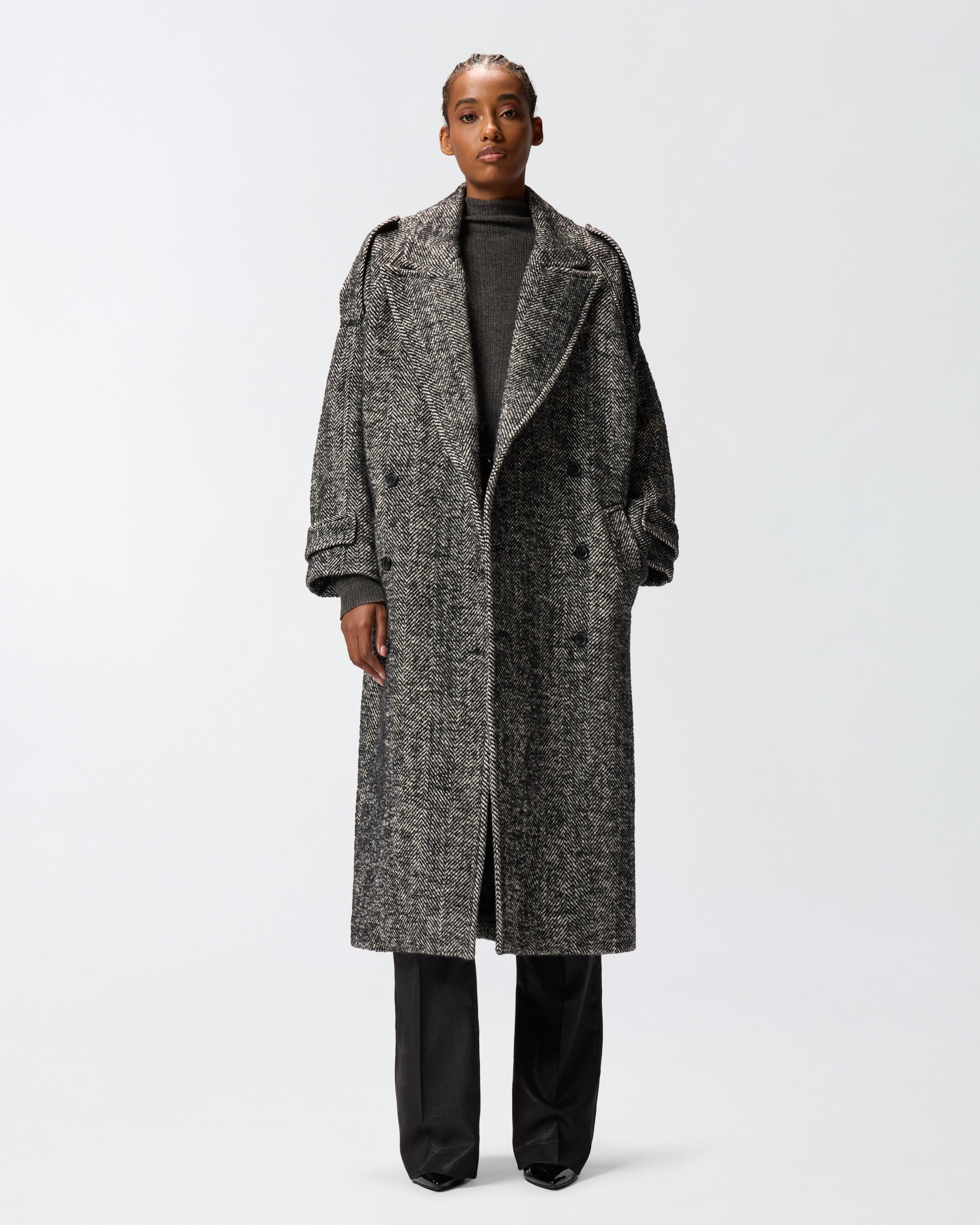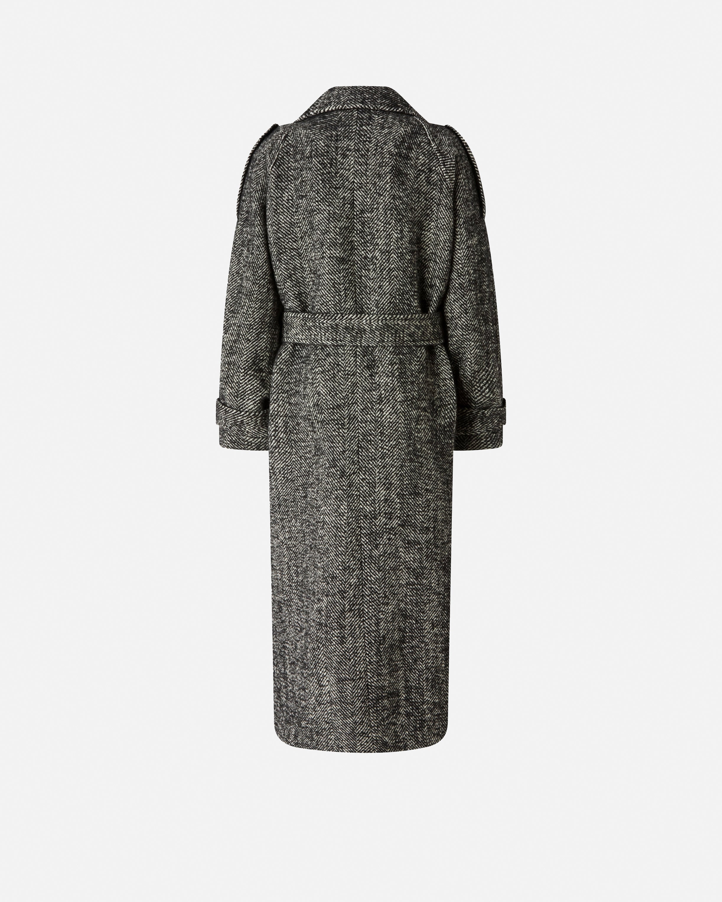 Cappotto da donna lungo alla caviglia con design a vestaglia, chiusura doppiopetto, collo a revers e maniche lunghe completate da cinturino. Il capo è realizzato in caldo panno di misto lana, ottenuto da filati rigenerati che danno alla struttura un aspetto mosso e irregolare, ed è personalizzato con un raffinato motivo spigato. Cintura abbinata nello stesso tessuto da annodare in vita. Modello foderato.