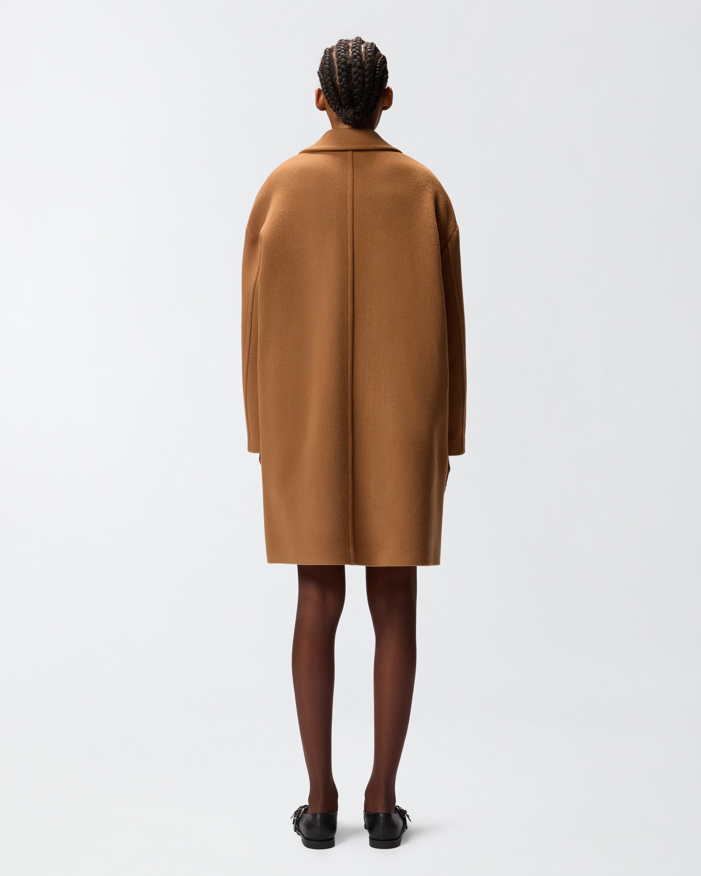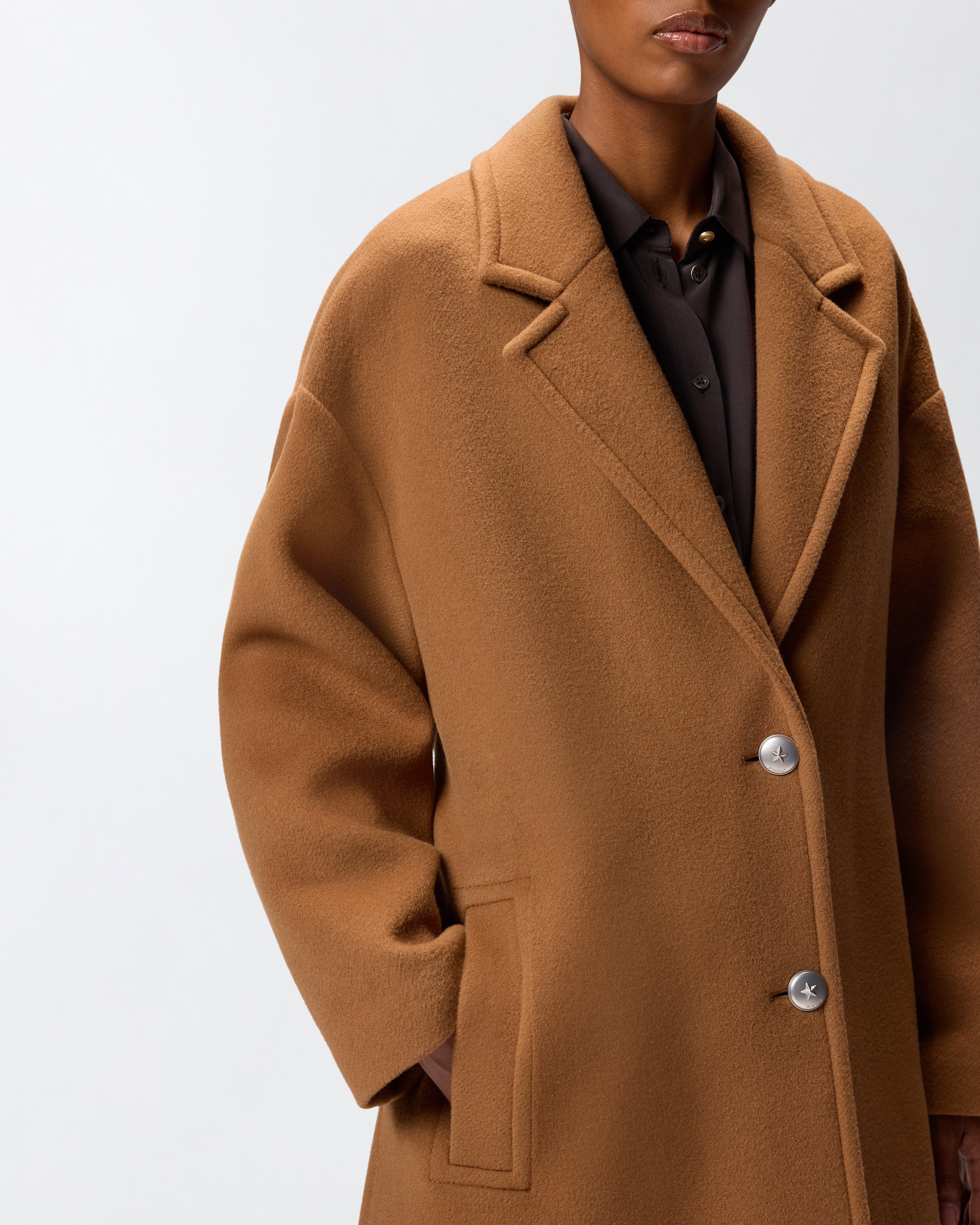 Cappotto corto in panno di misto lana foderato, contraddistinto da un collo a revers e da tasche a filetto frontali. Il design minimalista dona al capo un'eleganza senza tempo. Chiusura monopetto con bottoni in metallo decorati da stella.