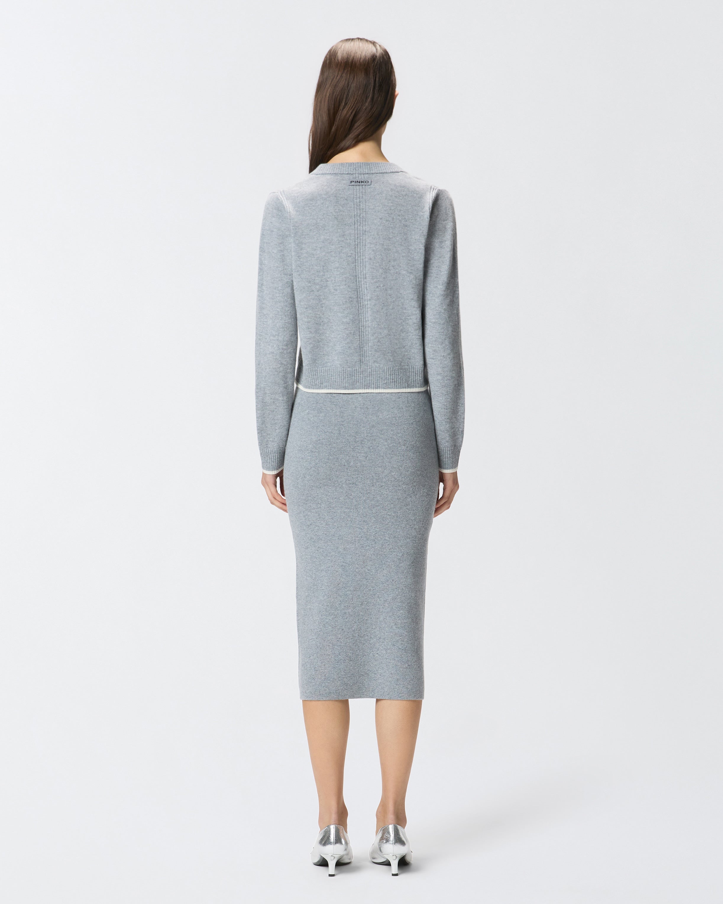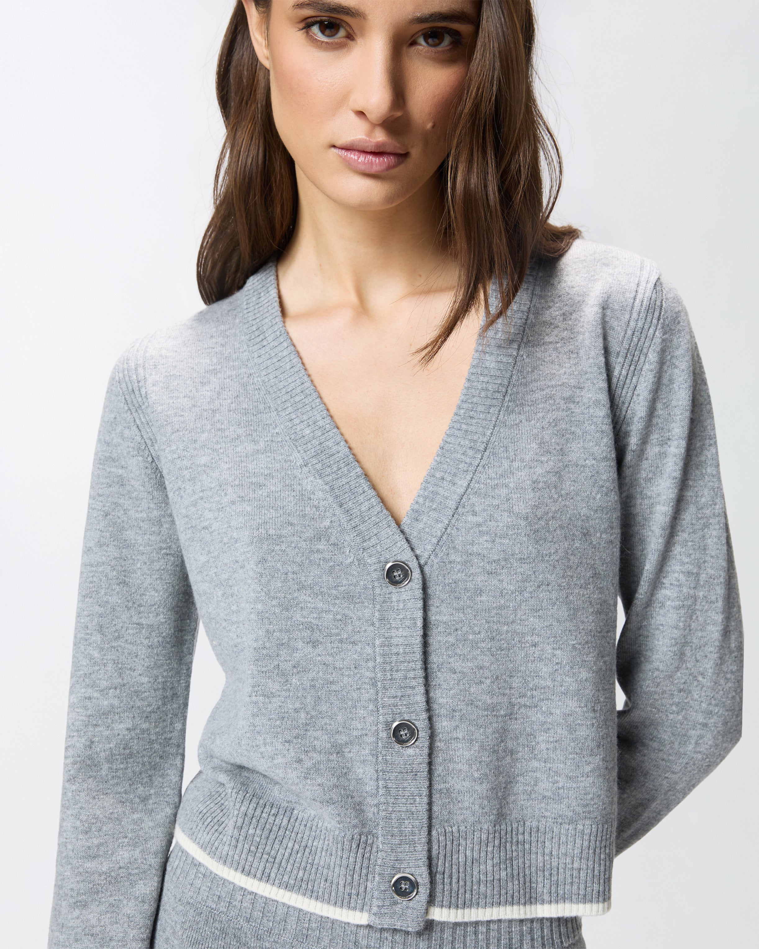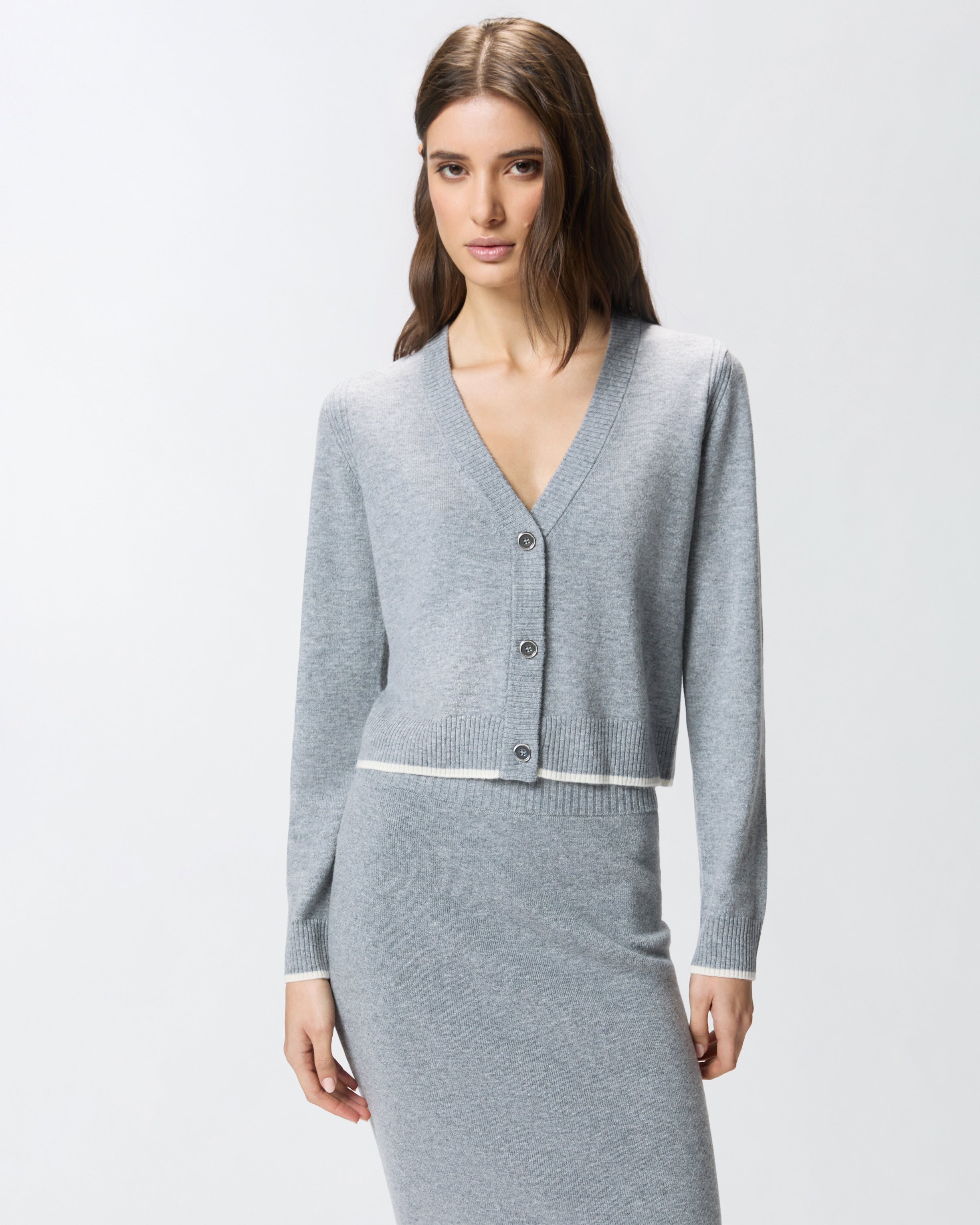 Cardigan realizzato in soffice misto di lana merino e cashmere con scollo a V, orlo e polsini lavorati a coste. Il filato a contrasto mette in risalto i polsini e l'orlo, mentre la caratteristica etichetta con logo lettering PINKO completa il design. Il capo è stato sottoposto a prove di finissaggio per ridurre al minimo la possibile formazione di pilling, garantendo una maggiore morbidezza e durabilità del tessuto. Essenziale e contemporaneo, questo design diventerà un vero e proprio passe-partout.