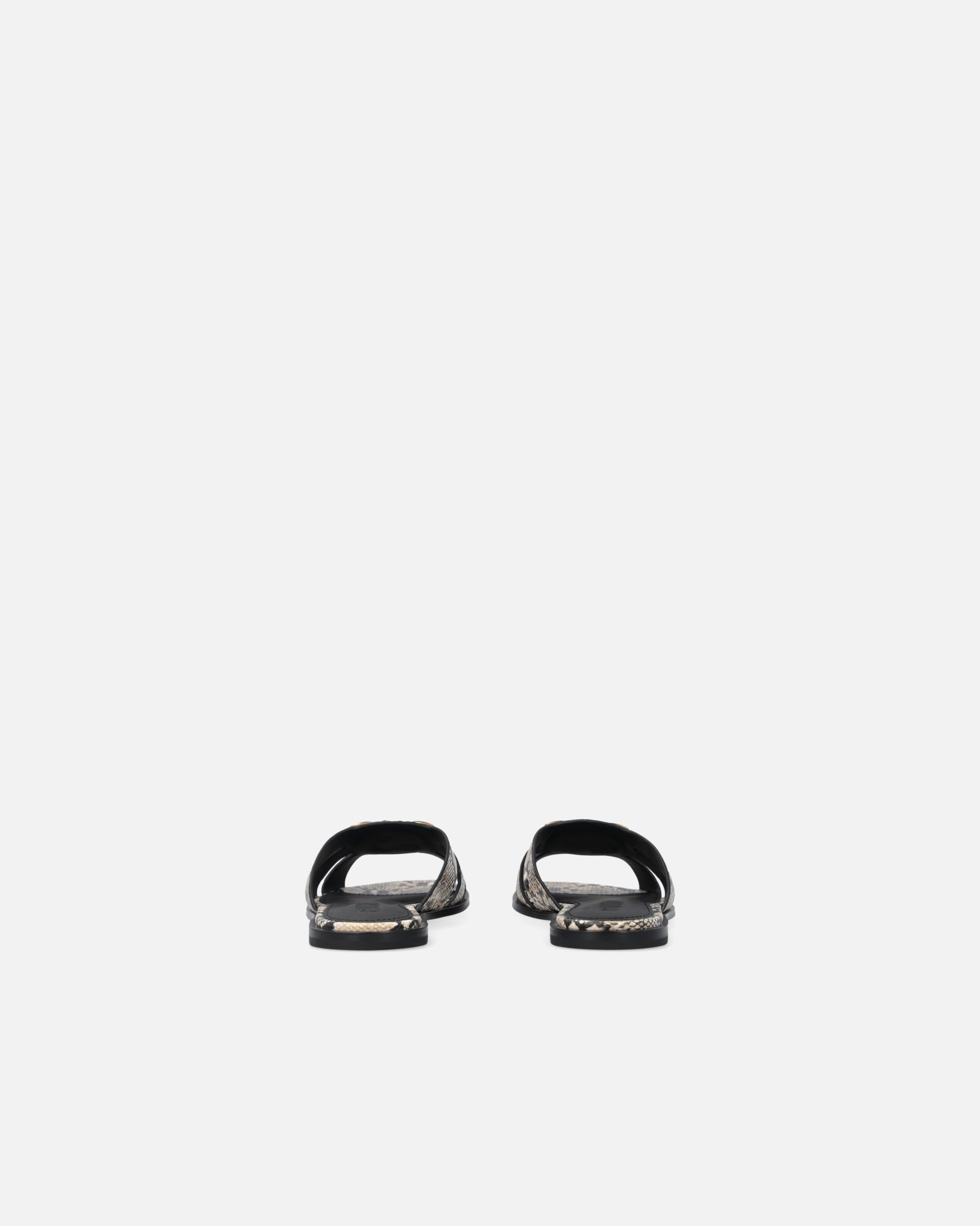 Ciabattine in pelle con un'audace stampa pitone che decora tutta la tomaia, caratterizzata da cut-out laterali e personalizzata dall'iconico logo Love Birds con profilo in metallo e interno in rilievo. Dotate di soletta in pelle per un indosso ancora più confortevole e di una suola extrapiatta in gomma che rende sicuro ogni passo, queste slipper dall'estetica urban e contemporanea ti accompagneranno con grinta durante le giornate in città e non solo.