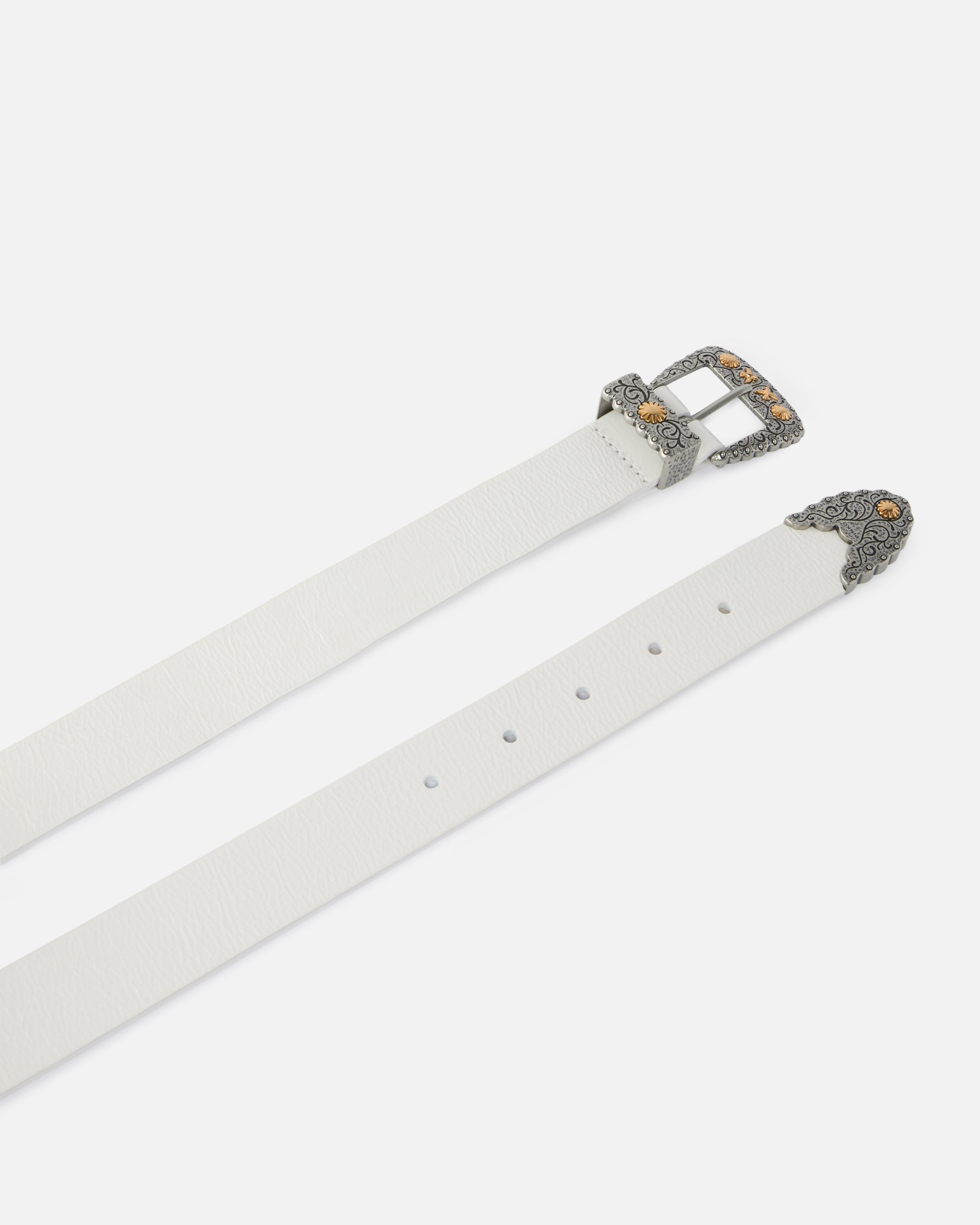 Cintura alta 3 cm realizzata in morbida pelle shiny effetto vintage. L'estremità a punta, la fibbia e il passante metallico sono realizzati in stile texano, con una finitura argentata opaca rifinita da motivi floreali incisi e da dettagli dorati incastonati tra cui due uccellini Love Birds. Un accessorio dallo spirito country che non rinuncia al tocco di stile tipico di PINKO.
