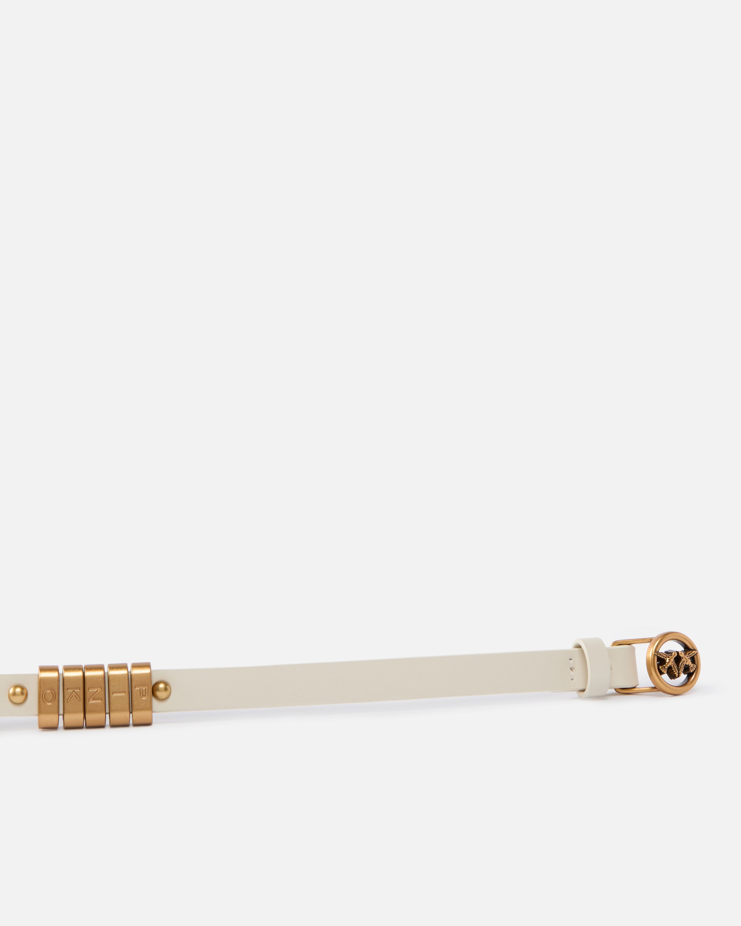 Cintura sottile da donna, alta 1,2 cm, realizzata in morbida pelle mano seta. Il modello è personalizzato da anellini metallici con lettere incise a formare il logo PINKO e da piccole borchie, ed è completato da una fibbia circolare con gli iconici uccellini Love Birds. Grazie al design versatile ma riconoscibile, la cinturina si presta a essere indossata sia con i tuoi look quotidiani, sia con gli outfit da sera.