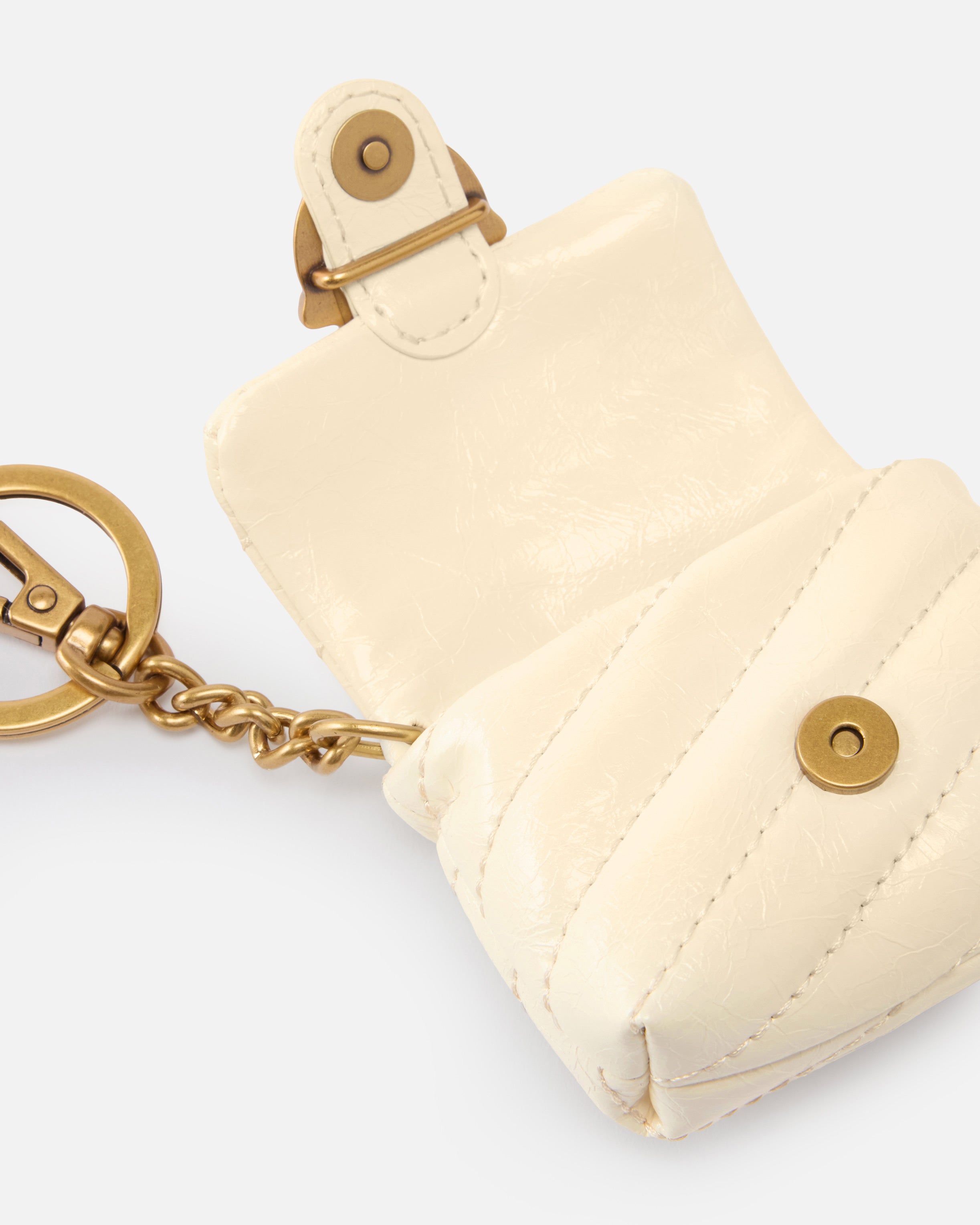 Custodia per auricolari AirPods in morbida pelle lucida con trapuntatura obliqua, personalizzata con l'iconica placca Love Birds Diamond Cut in corrispondenza della chiusura magnetica. L'accessorio è inoltre completo di catenina metallica con piccolo moschettone, per poterlo aggiungere alla tua borsa e tenerlo sempre con te. - AIRPODS LOVE PUFF