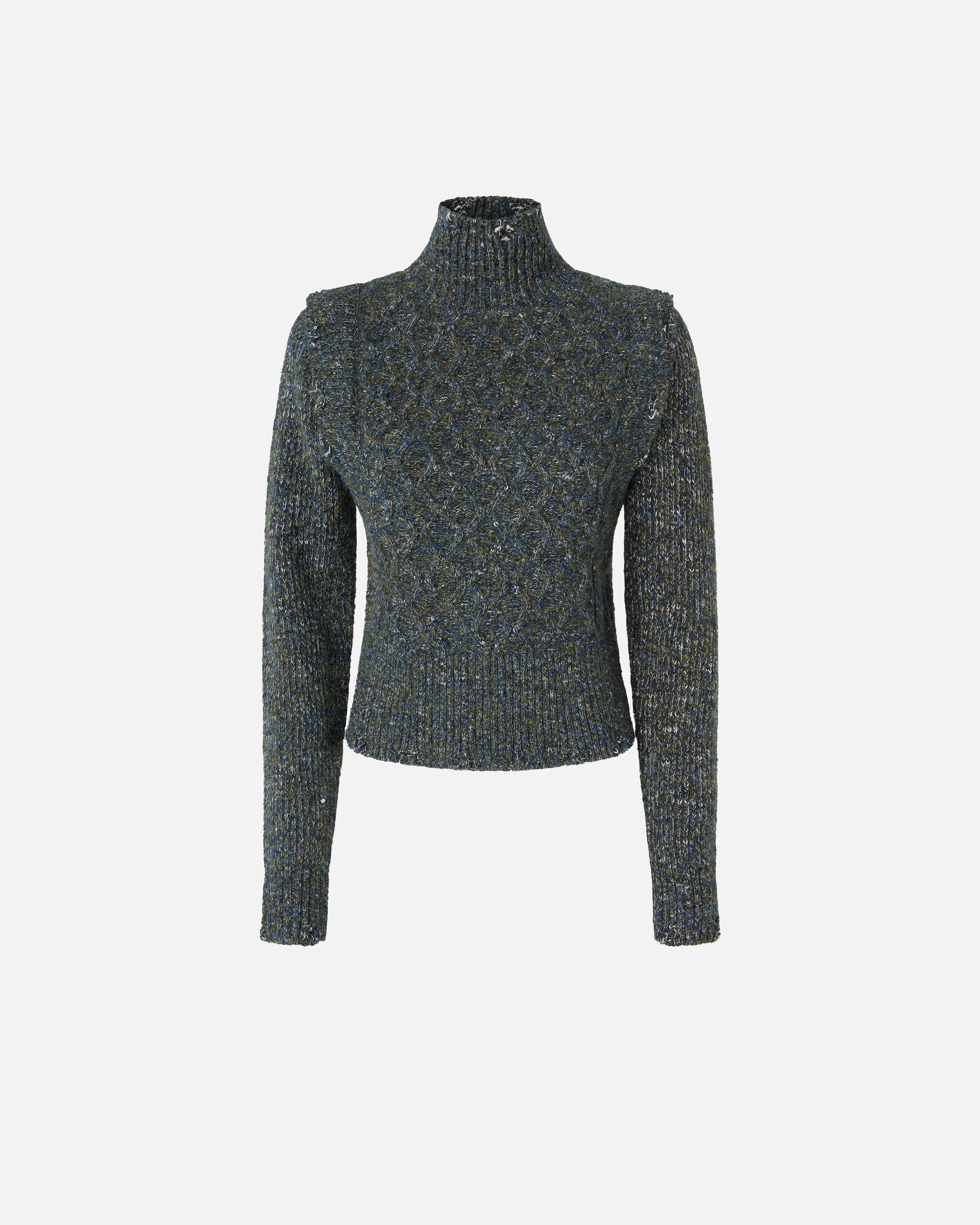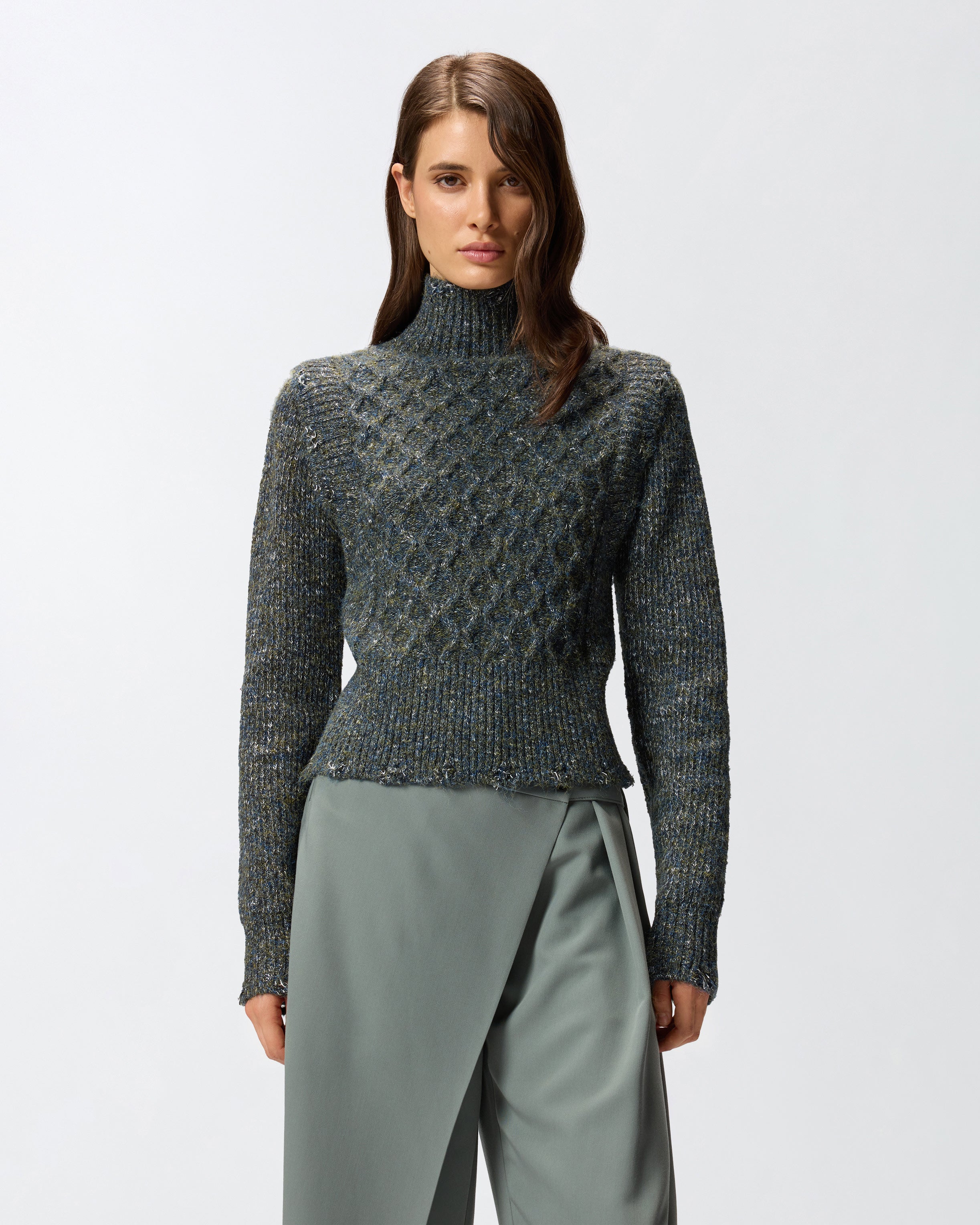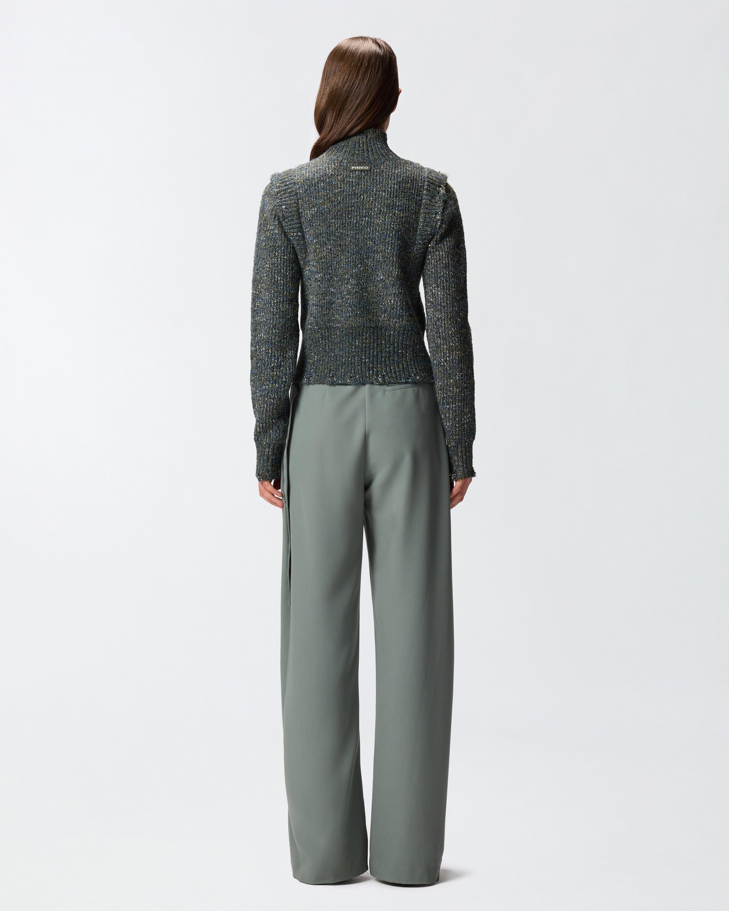 Dolcevita in maglia con filati di colori diversi, caratterizzato da una lavorazione a coste sul retro e sulle maniche e dal punto treccia sul davanti che dona movimento e tridimensionalità al design. Il modello, rifinito sul retro dall'etichetta con logo lettering PINKO, è perfetto da indossare con la gonna coordinata per creare un total look invernale dal gusto contemporaneo e innovativo. Il capo è stato sottoposto a prove di finissaggio per ridurre al minimo la possibile formazione di pilling, garantendo una maggiore morbidezza e durabilità del tessuto.