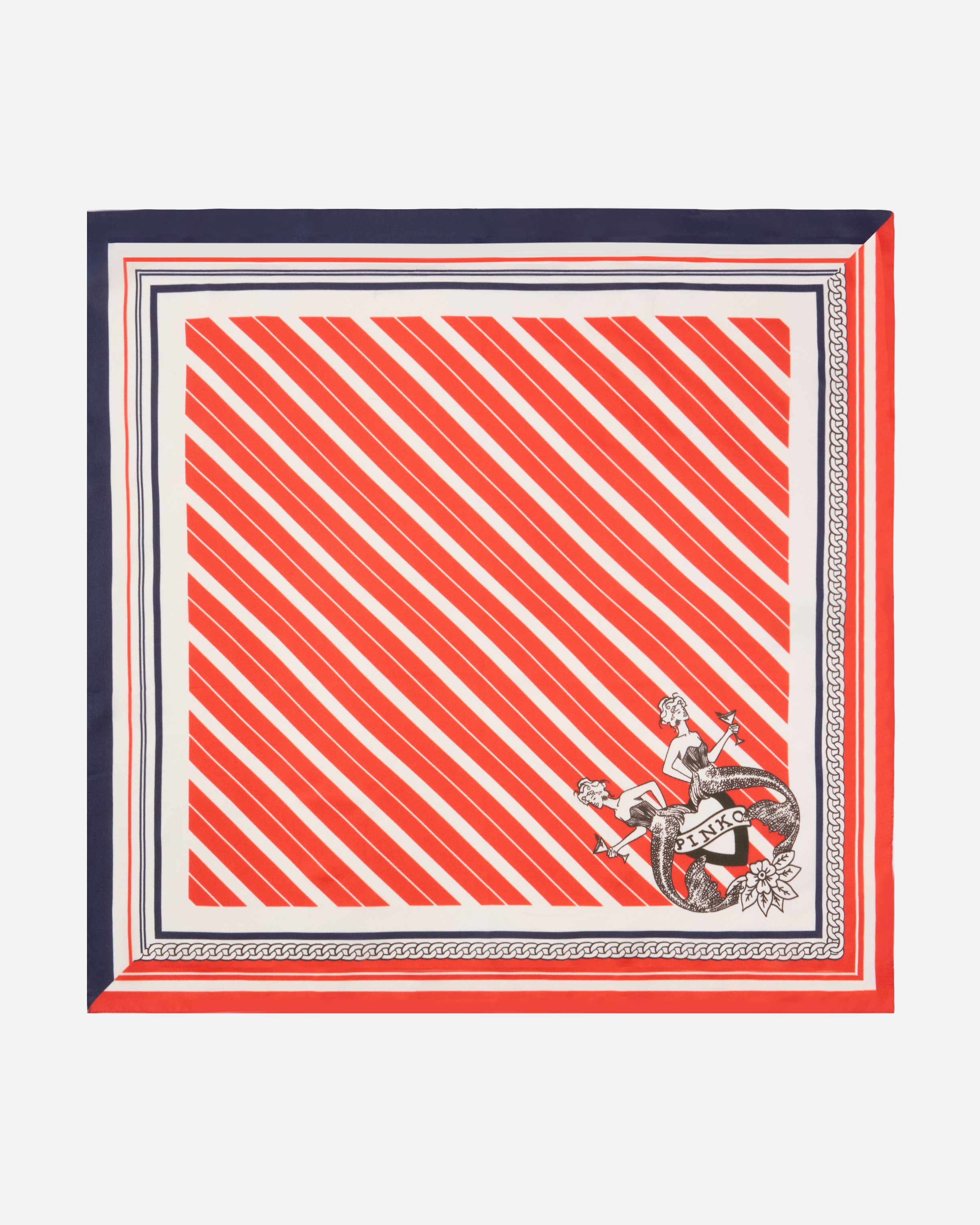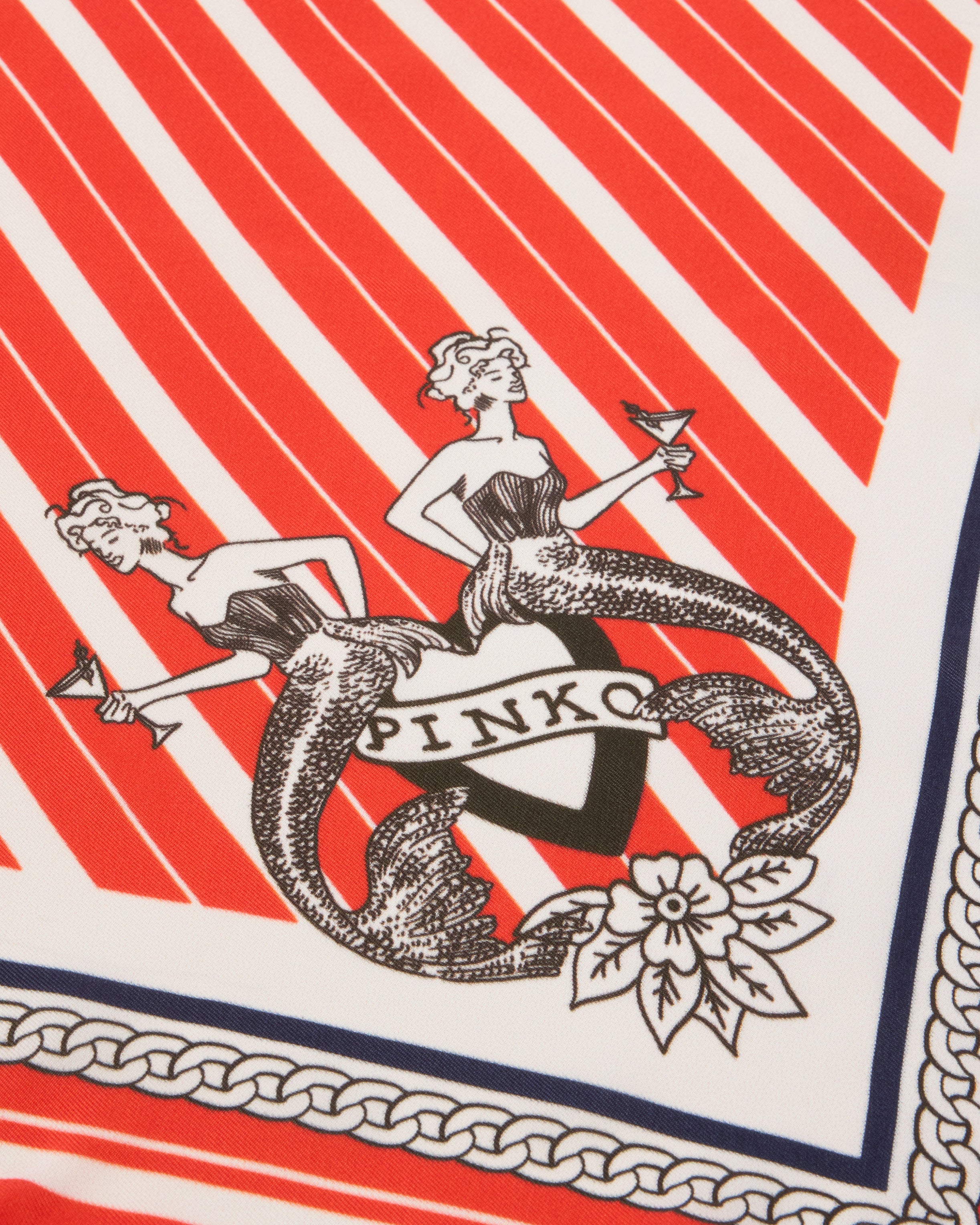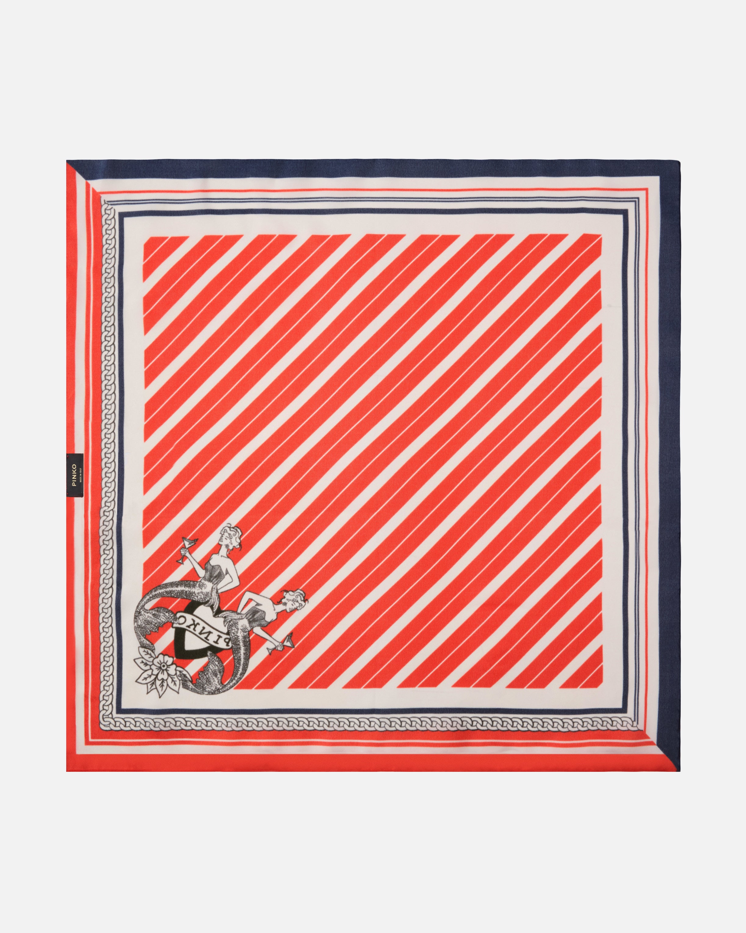 Foulard quadrato in twill dalla texture liscia e raffinata. Il modello si distingue per l'estetica marinara, ben visibile sia nella stampa principale a righe distanziate, sia nel dettaglio in corrispondenza di un angolo, ispirato ai classici tattoo dei marinai e raffigurante il logo lettering PINKO con due sirene. Non fermarti all'apparenza e scopri le diverse opzioni di styling di questo accessorio: indossalo al collo o al polso per un uso più convenzionale, oppure annodalo sul retro della schiena come top per un look audace.
