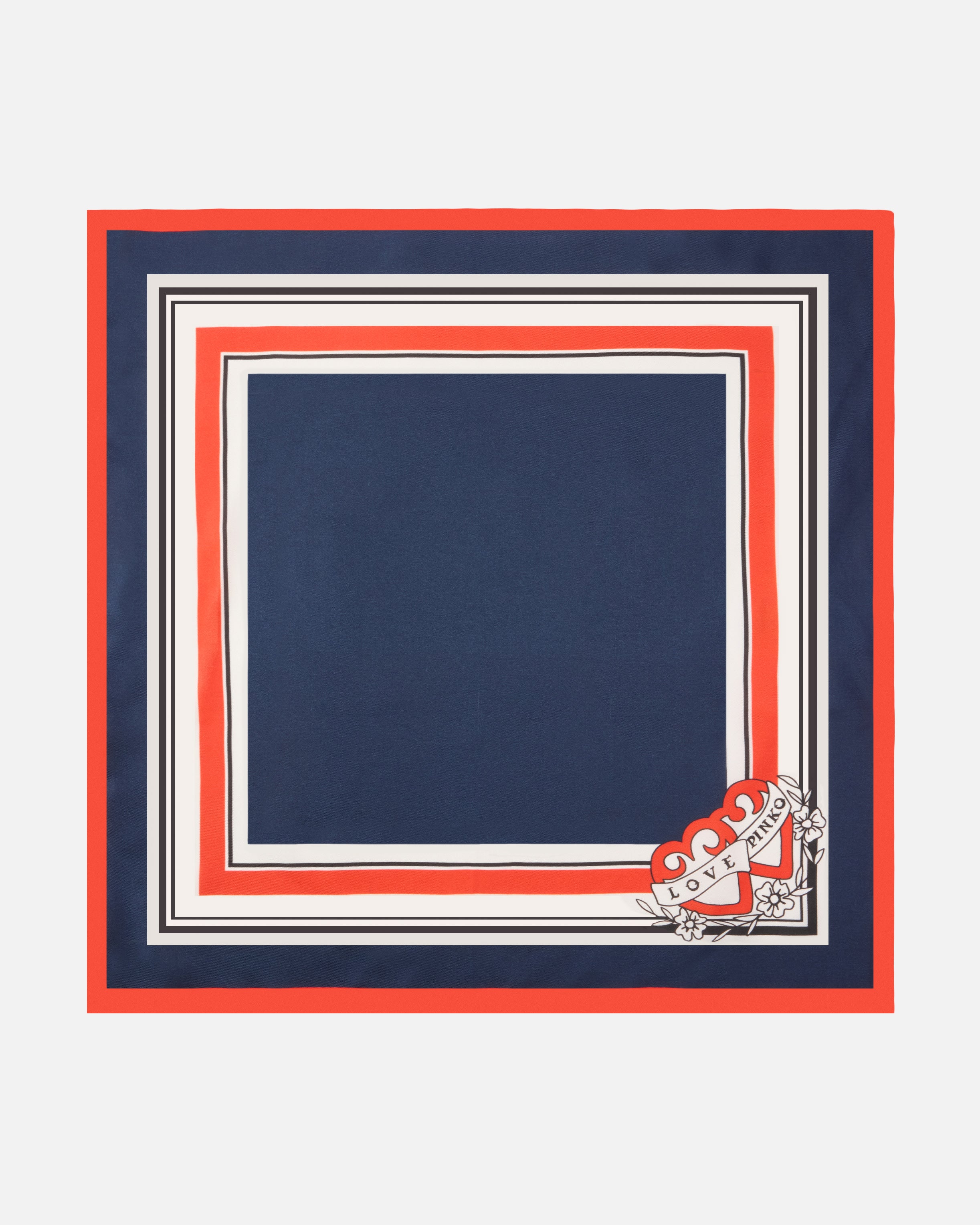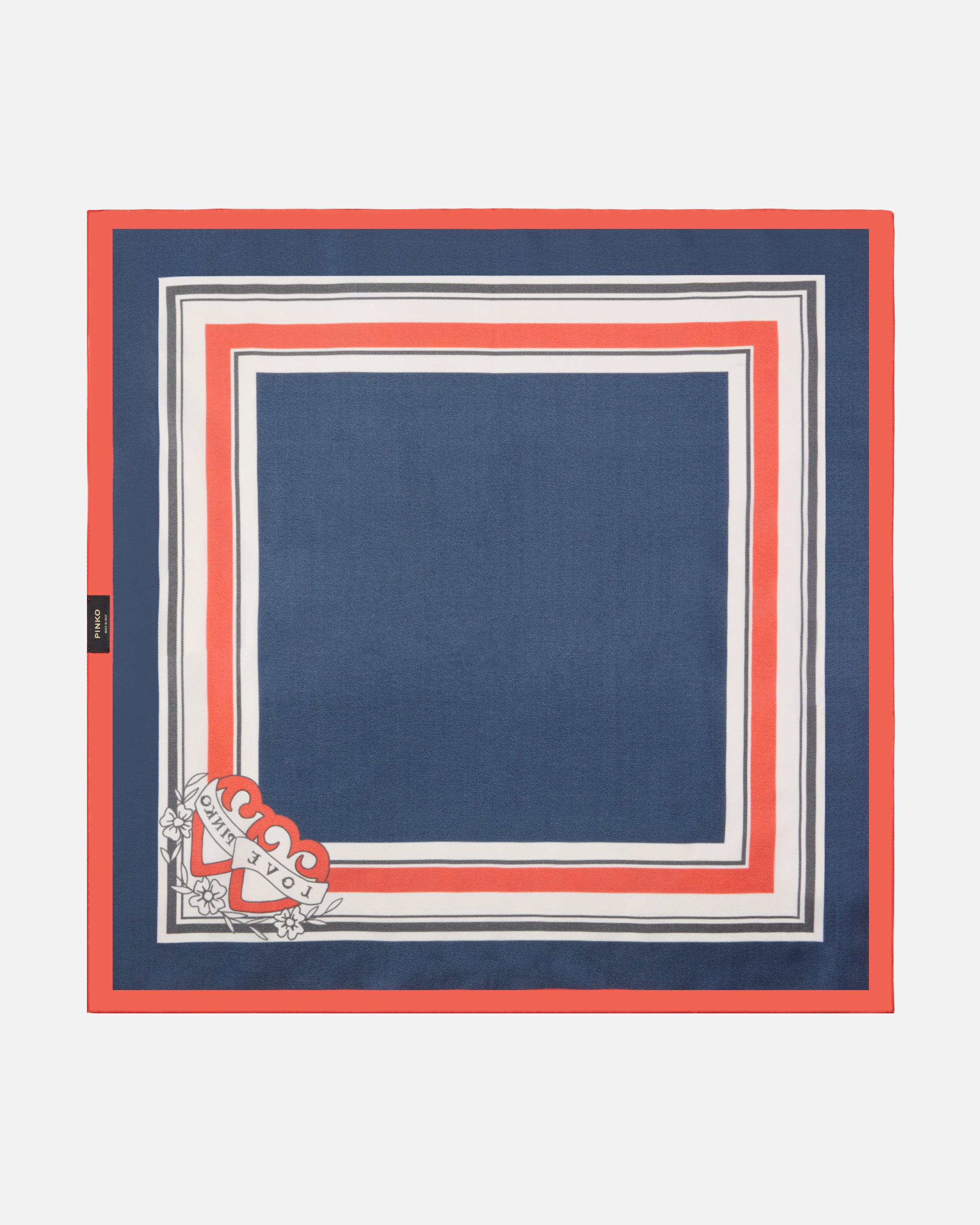 Foulard quadrato in twill dalla texture liscia e raffinata. Il modello si distingue per l'estetica marinara, ben visibile sia nella stampa a righe che funge da cornice, sia nel dettaglio in corrispondenza di un angolo, ispirato ai classici tattoo dei marinai e raffigurante la scritta LOVE PINKO disposta su due cuori. Non fermarti all'apparenza e scopri le diverse opzioni di styling di questo accessorio: indossalo al collo o al polso per un uso più convenzionale, oppure annodalo sul retro della schiena come top per un look audace.