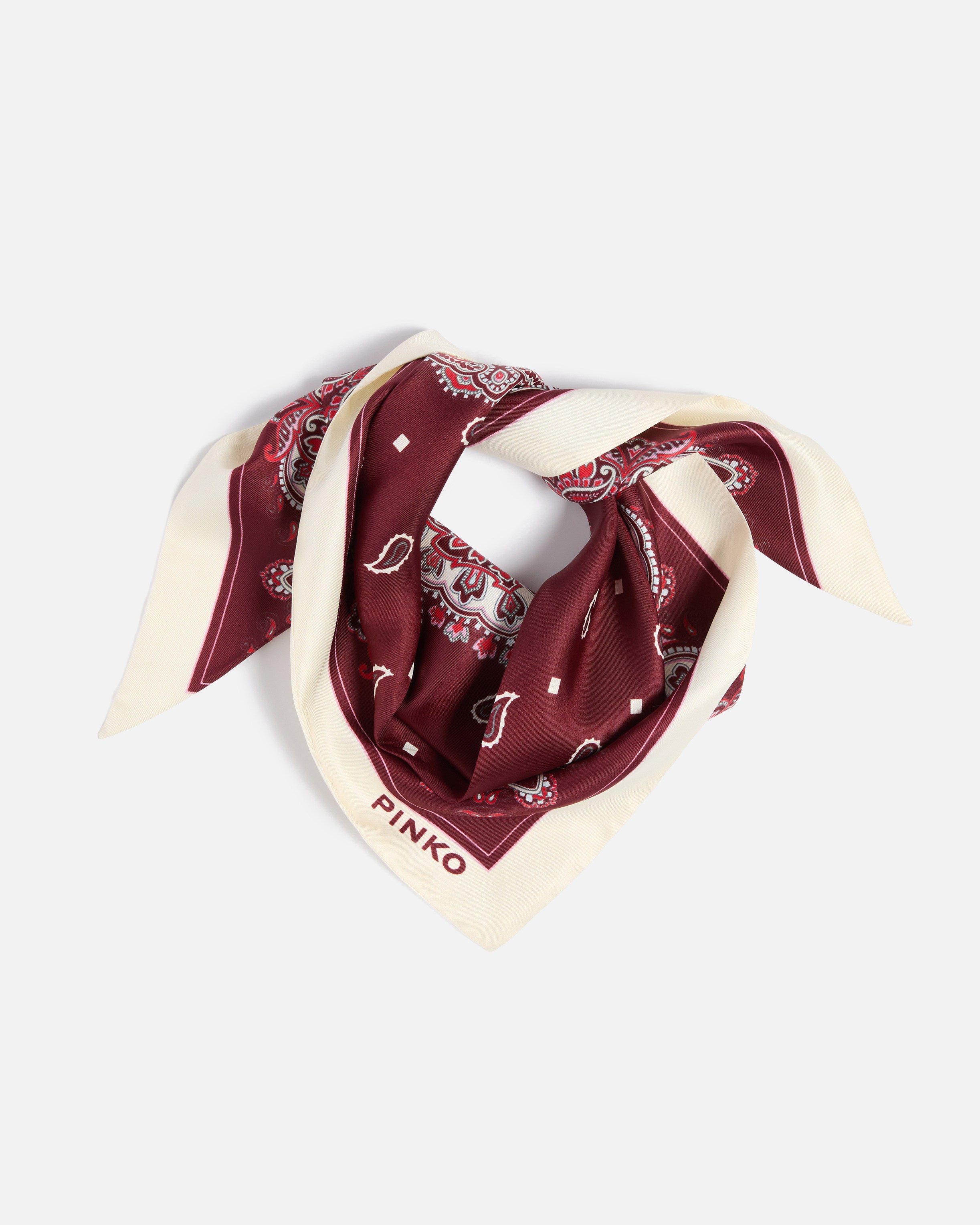 Foulard a forma di triangolo in morbido twill di misto seta. Il modello è impreziosito da una raffinata stampa bandana con micro paisley all over e un elaborato motivo d'ispirazione floreale lungo i bordi, ed è rifinito dal logo lettering PINKO sull'angolo. L'accessorio si presta a svariati utilizzi: indossalo al collo o tra i capelli per movimentare un look più minimal, oppure annodalo al manico di una borsa per aggiungere una nota di personalità ai tuoi look di tutti i giorni.