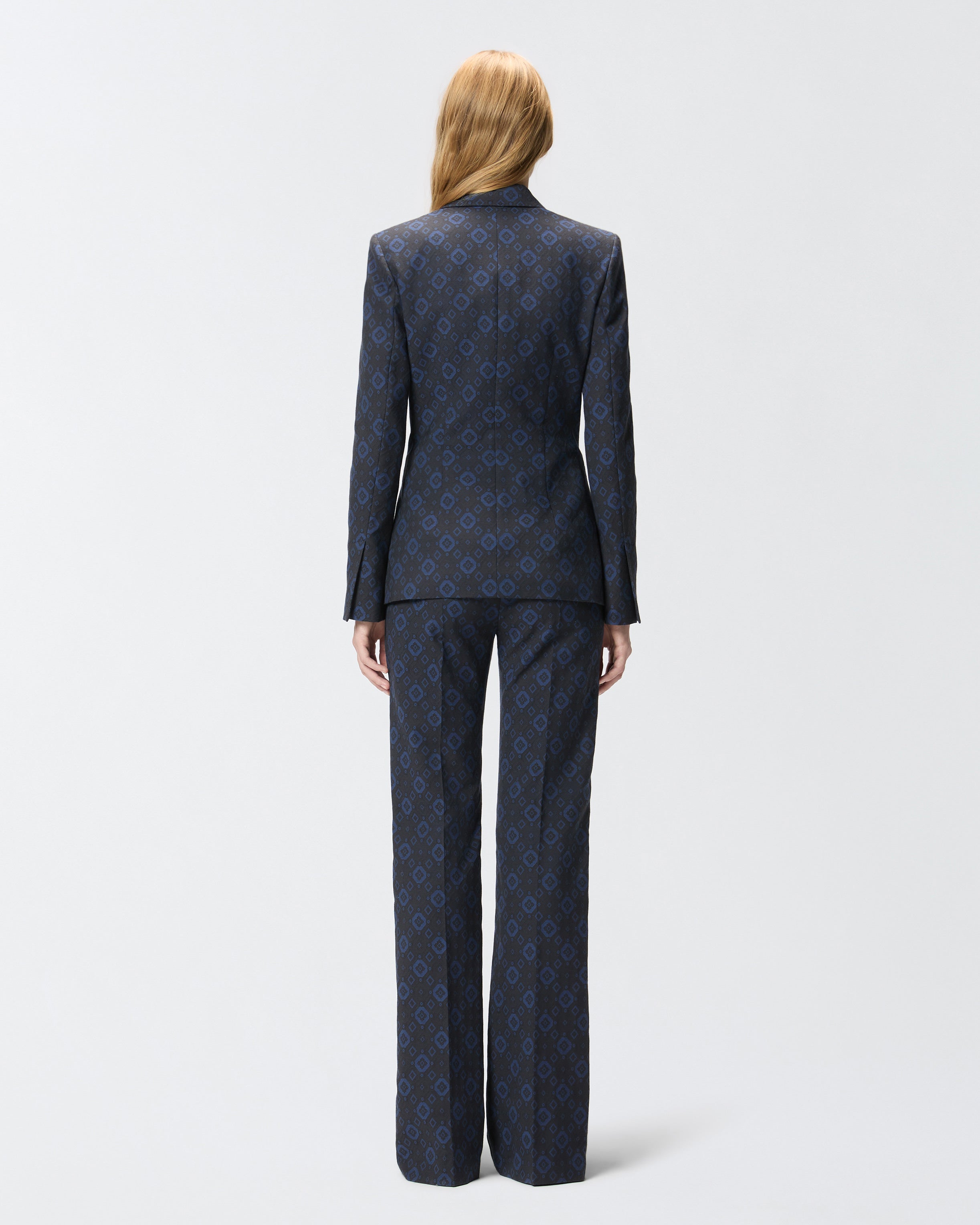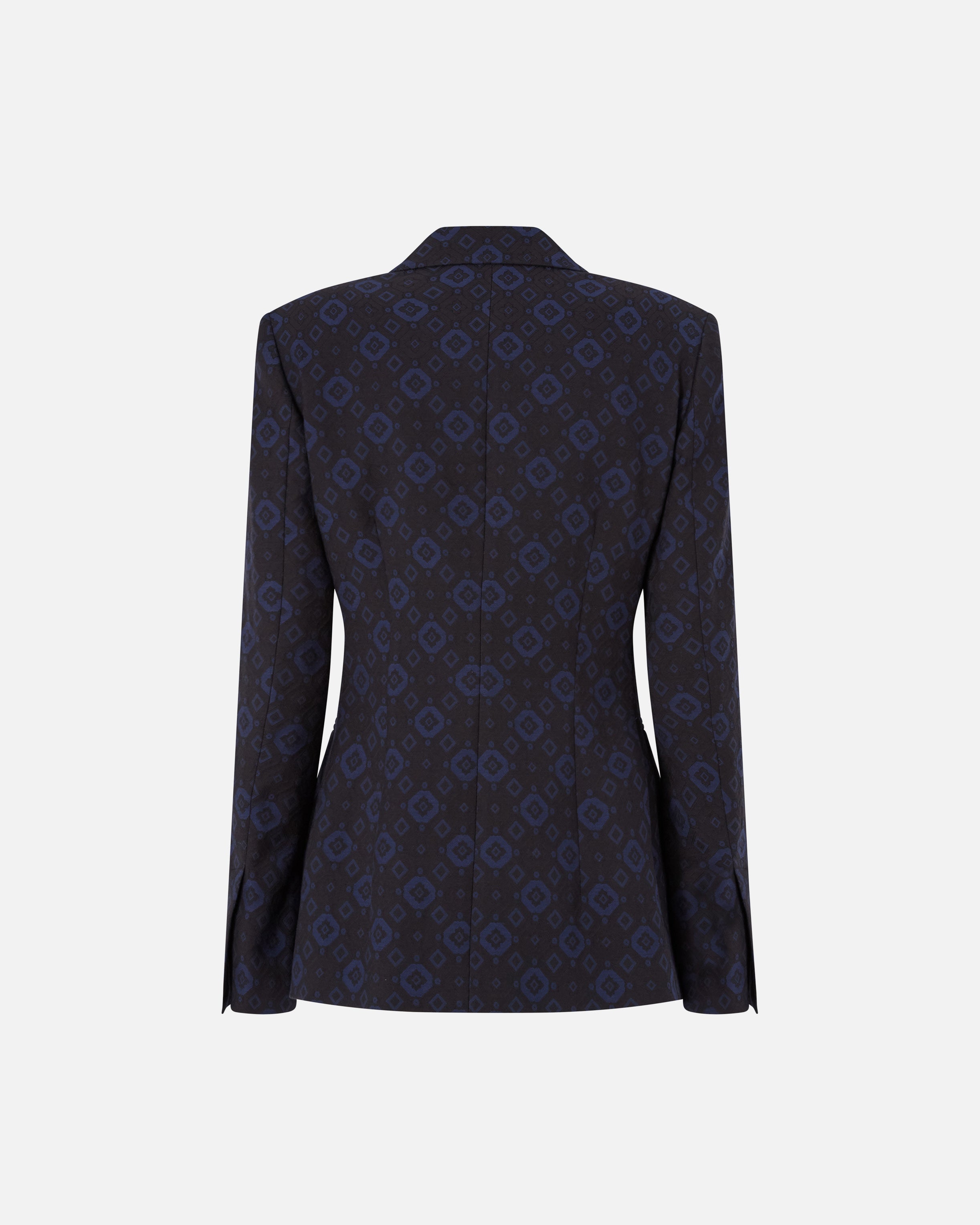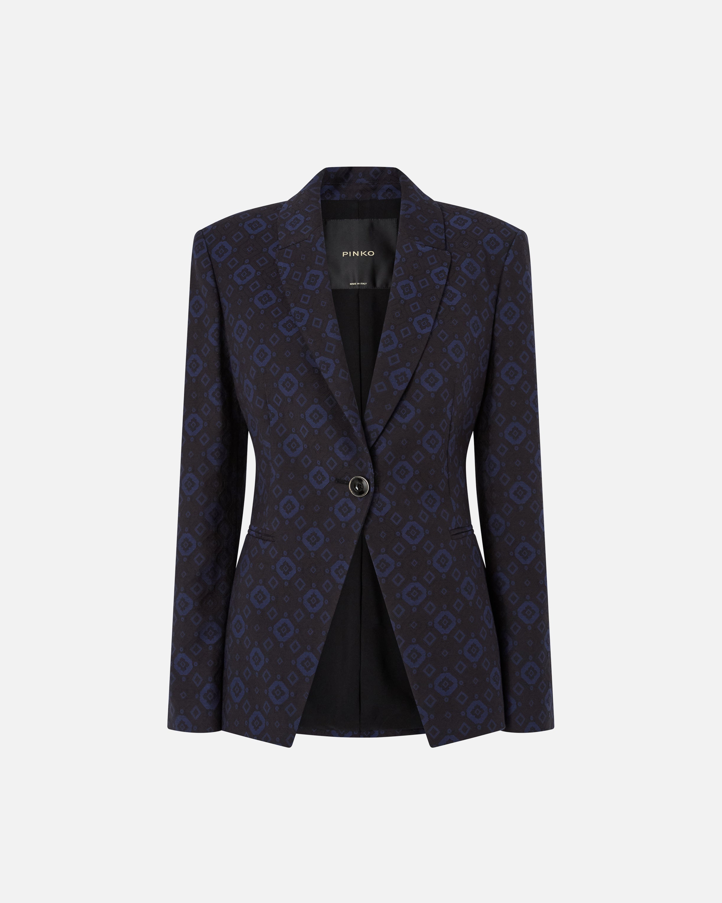 Giacca realizzata in jersey di misto cotone stretch e decorata da un elegante micro motivo geometrico e floreale all over. Il capo, dalla linea aderente che esalta la figura, è caratterizzato da revers classici, due tasche frontali a doppio filetto e una chiusura monopetto a un bottone. La fodera interna assicura un maggiore comfort durante l'indosso. Abbina questa giacca ai pantaloni coordinati e a una camicia minimal per creare un completo femminile ideale per le occasioni formali.
