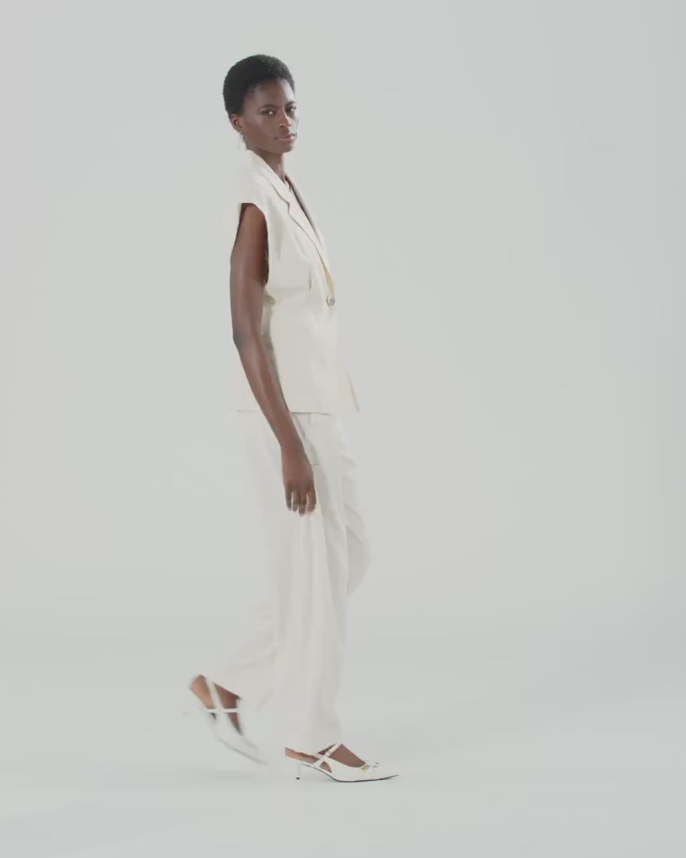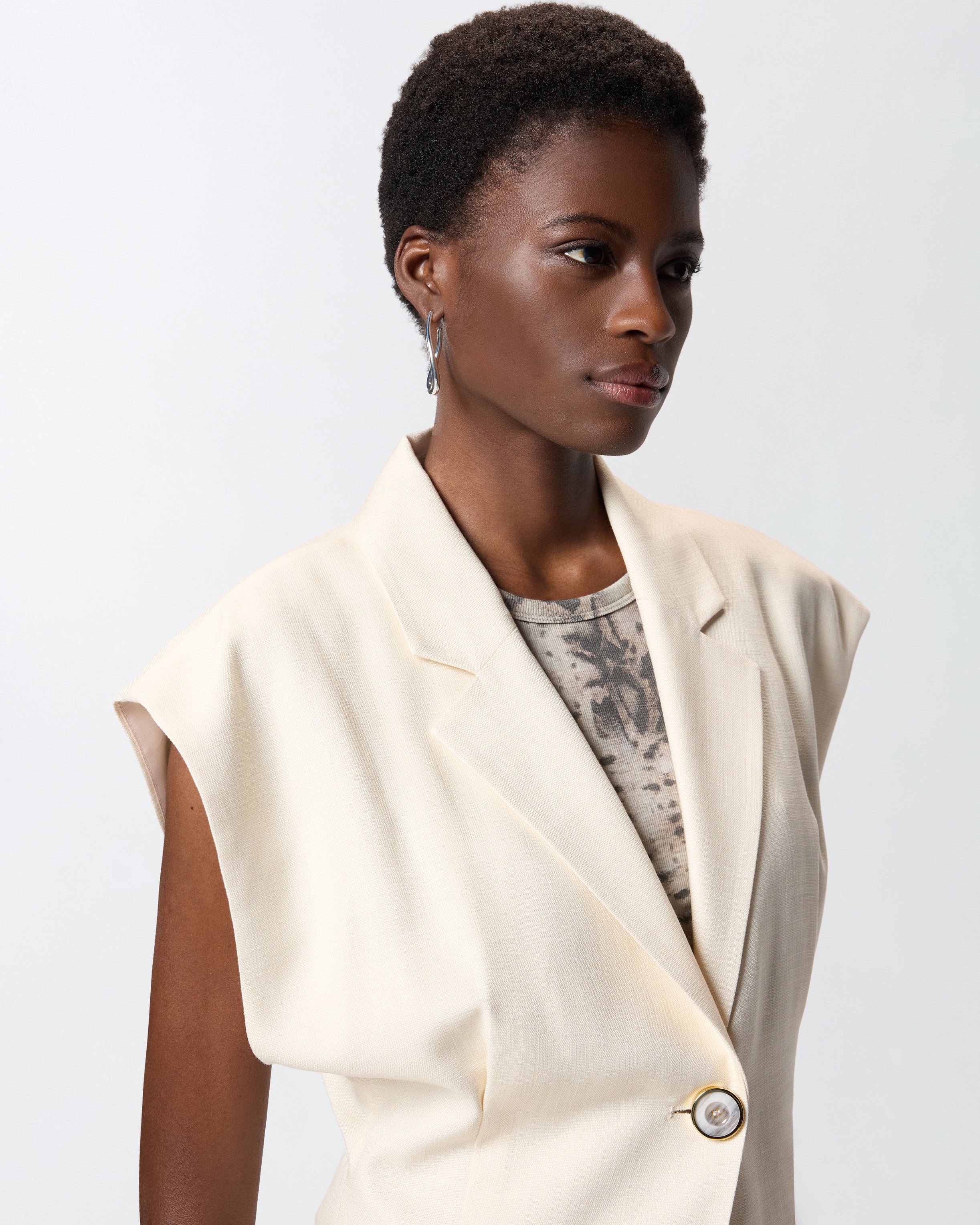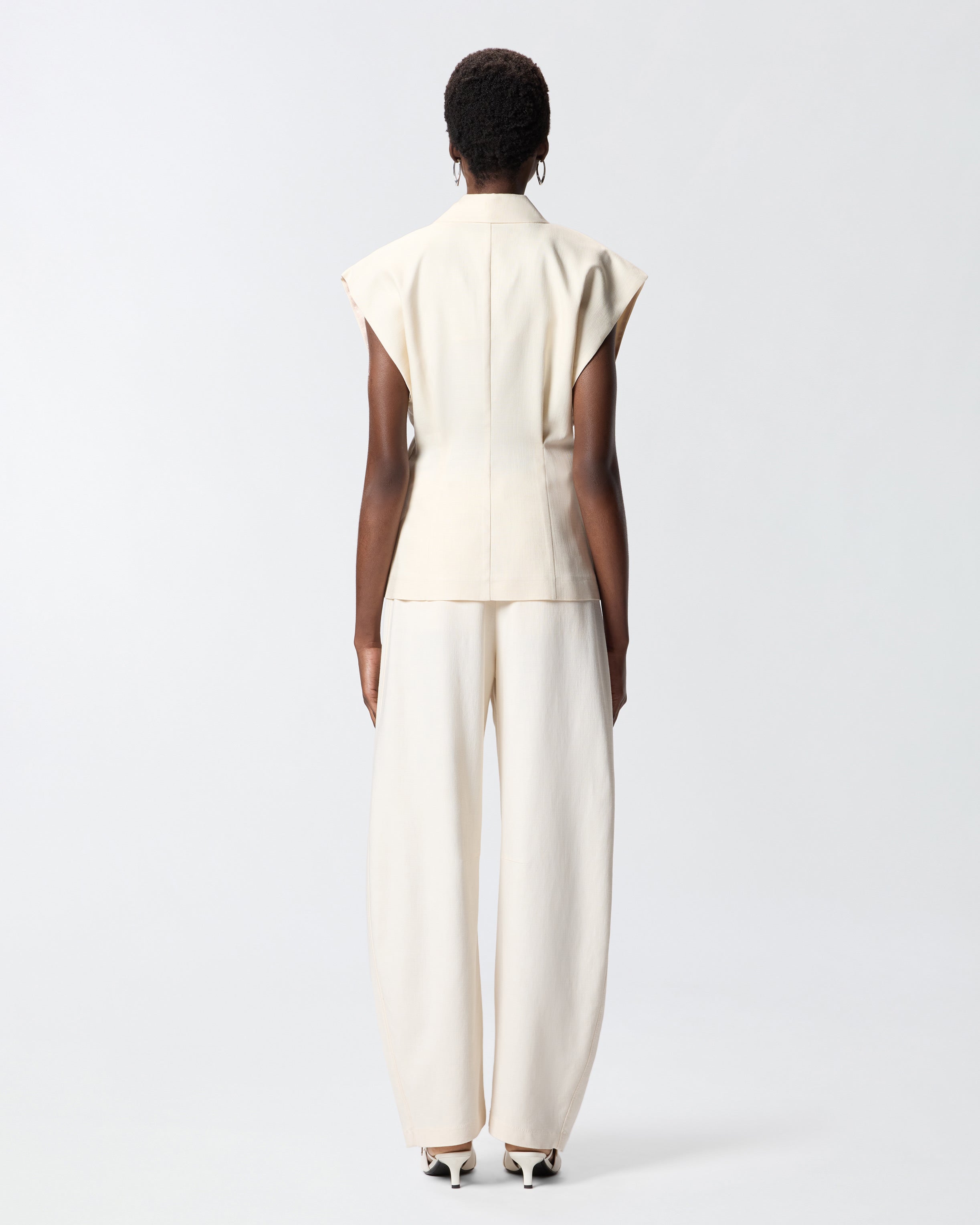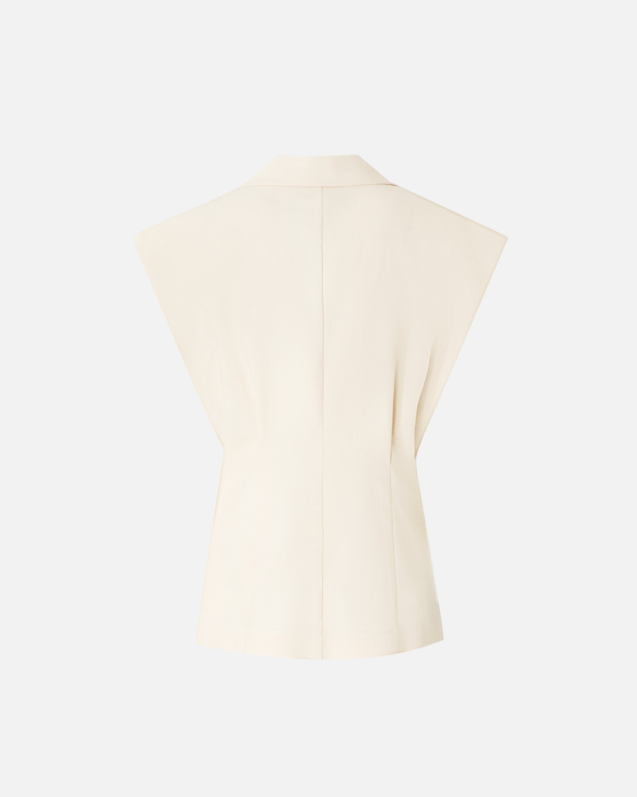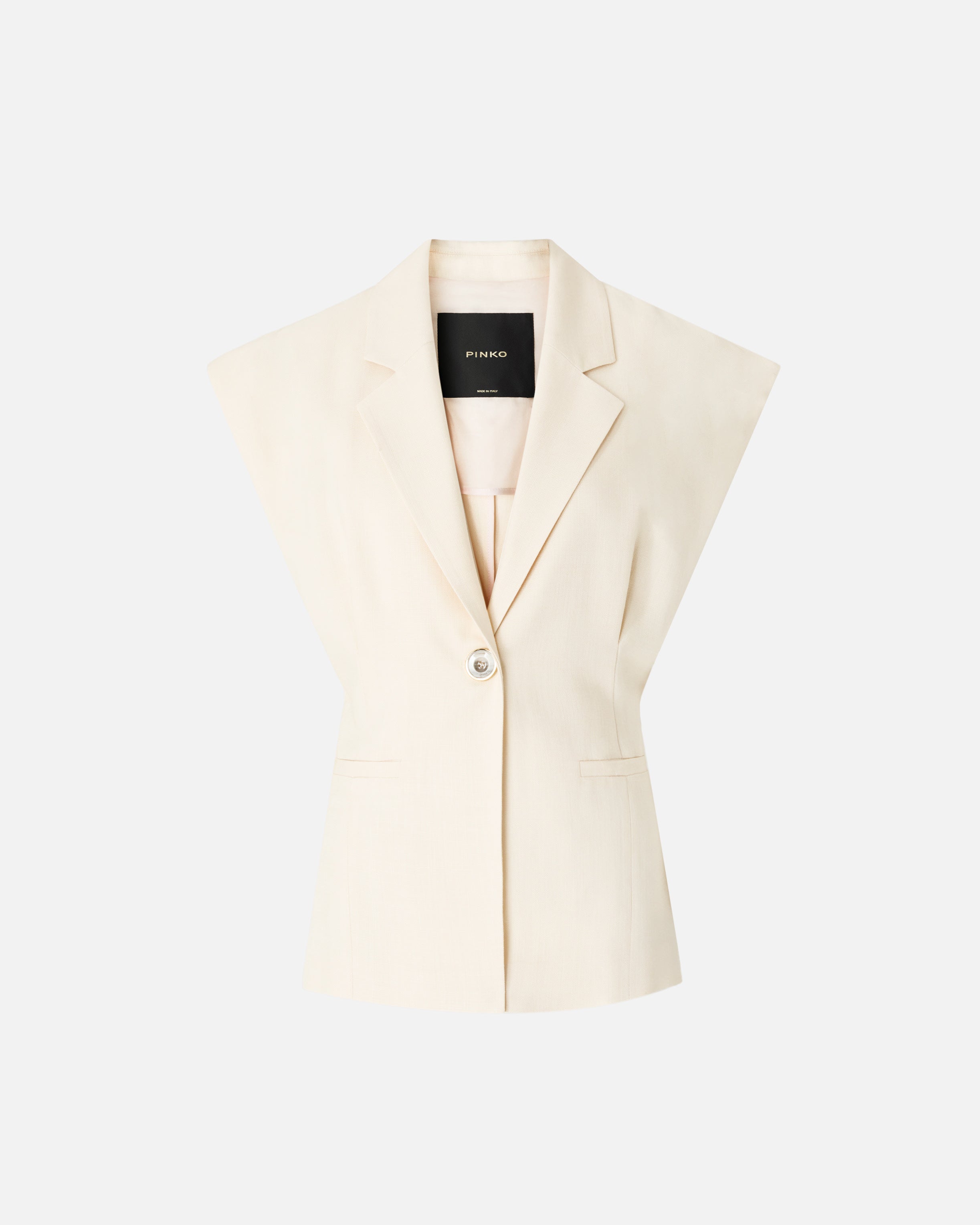 Giacca dal design smanicato realizzata in un tessuto panama che richiama l'inconfondibile aspetto rustico del lino, per un look elegante e disinvolto. Il capo presenta una chiusura monopetto a un bottone, ed è caratterizzato da revers classici, due raffinate tasche a filetto e pinces sul fronte e sul retro che modellano la vita. La fodera ton sur ton realizzata in puro cotone assicura un maggiore comfort durante l'indosso. Indossa questa giacca con la gonna coordinata per creare un total look femminile ideale per le occasioni formali.
