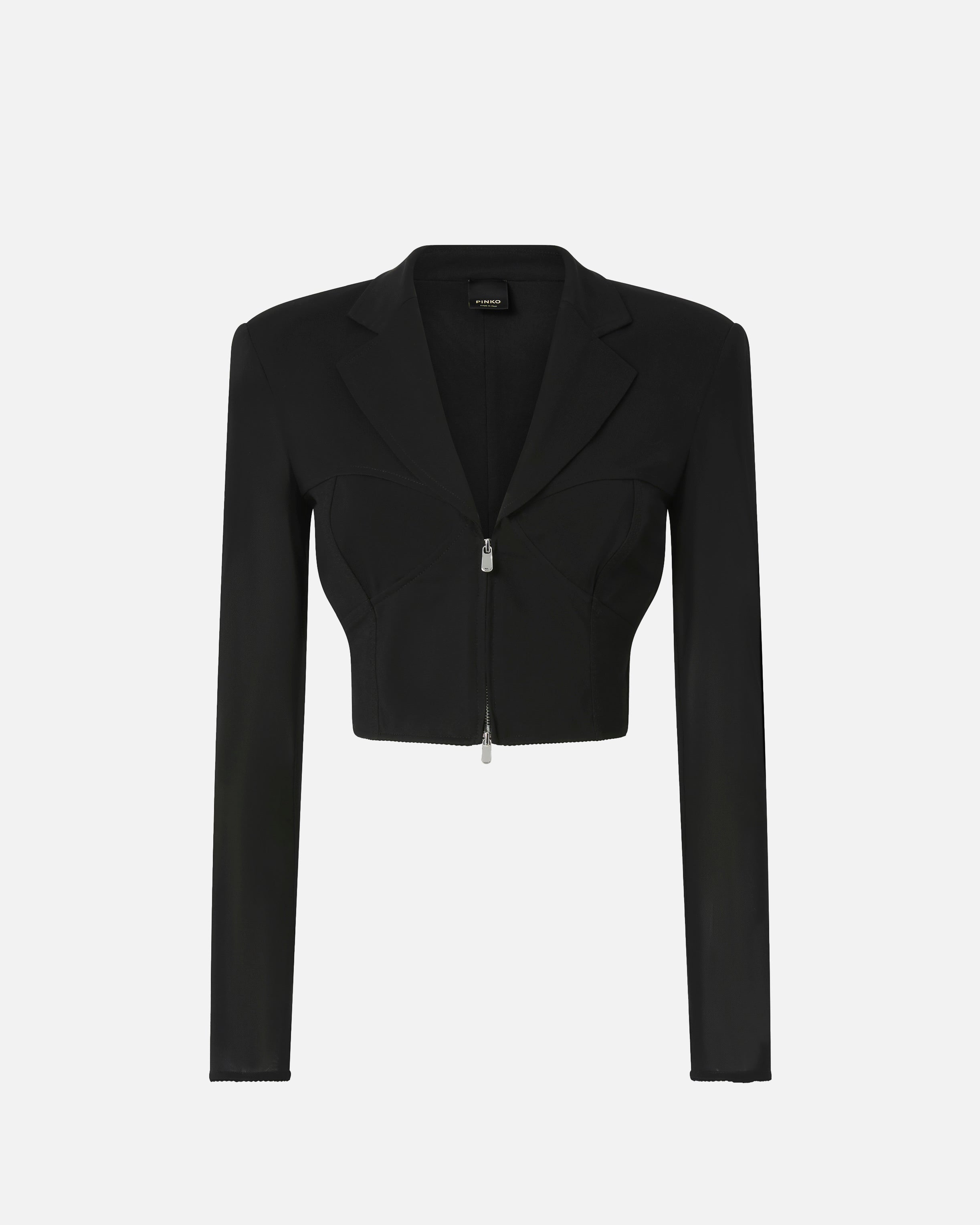 Giacca corta e aderente a maniche lunghe con zip sul davanti. Il tessuto, una tela busto dotata di grande elasticità, conferisce al capo un effetto modellante, valorizzando le forme in modo naturale e armonioso. Il capo garantisce un comfort ottimale, avvolgendo il corpo senza compromettere la libertà di movimento, e offrendo una vestibilità che enfatizza la figura con discrezione ed eleganza. I tagli studiati e le linee contemporanee di questa giacca corta ed elegante sono arricchiti da elementi distintivi, come i seducenti dettagli bustier.