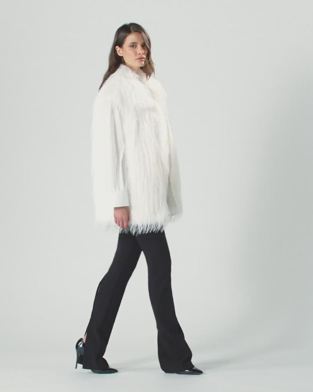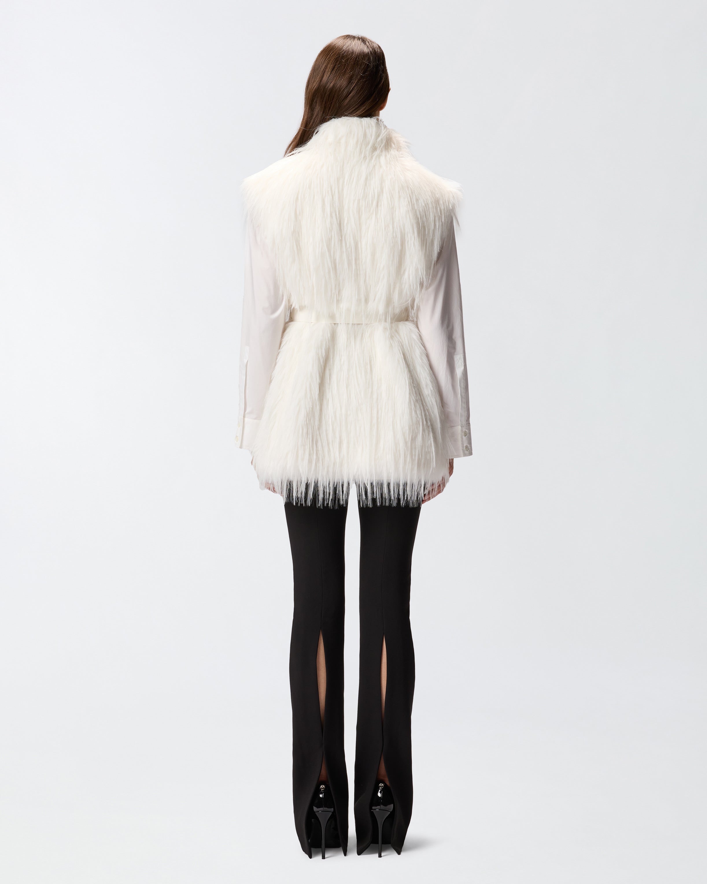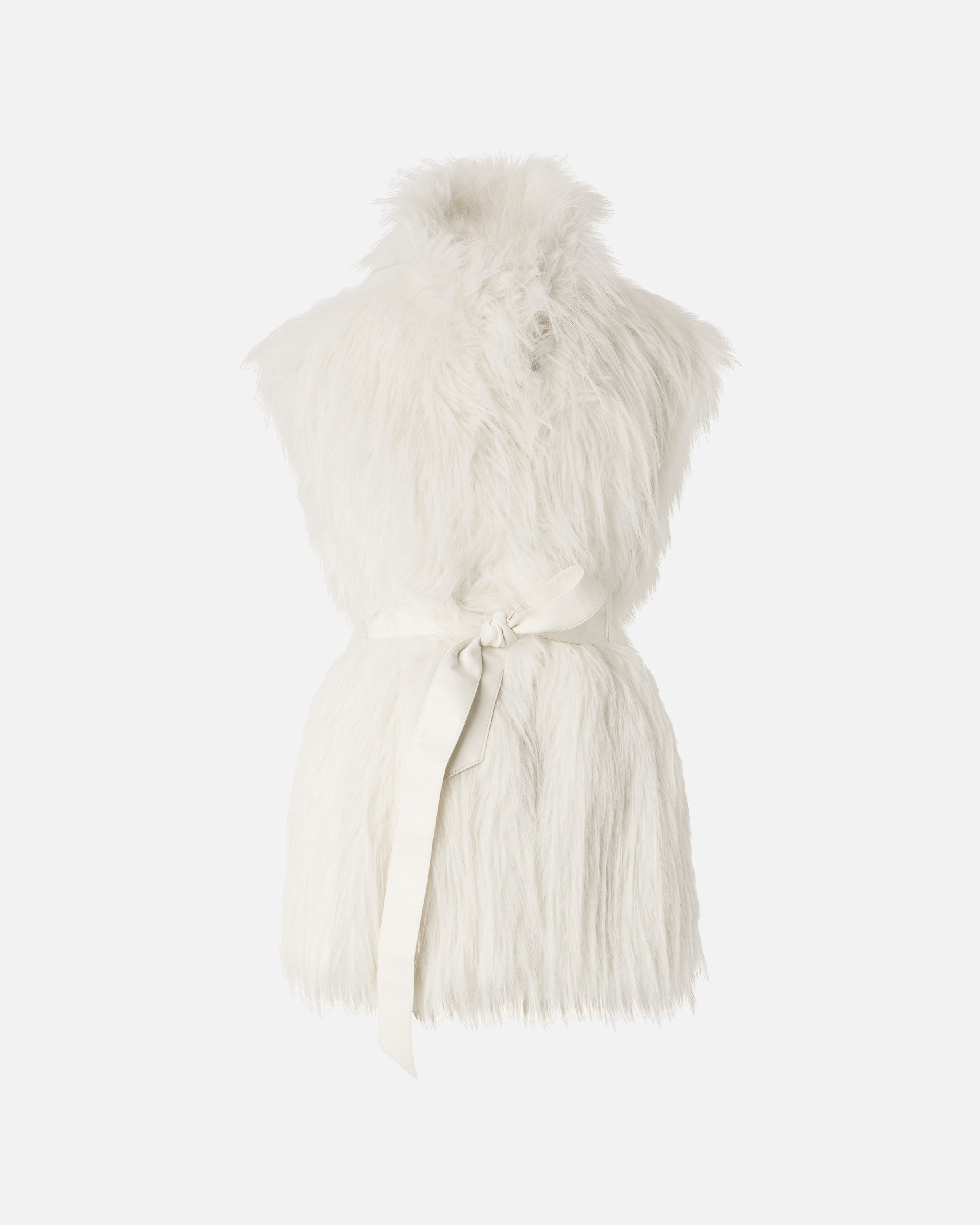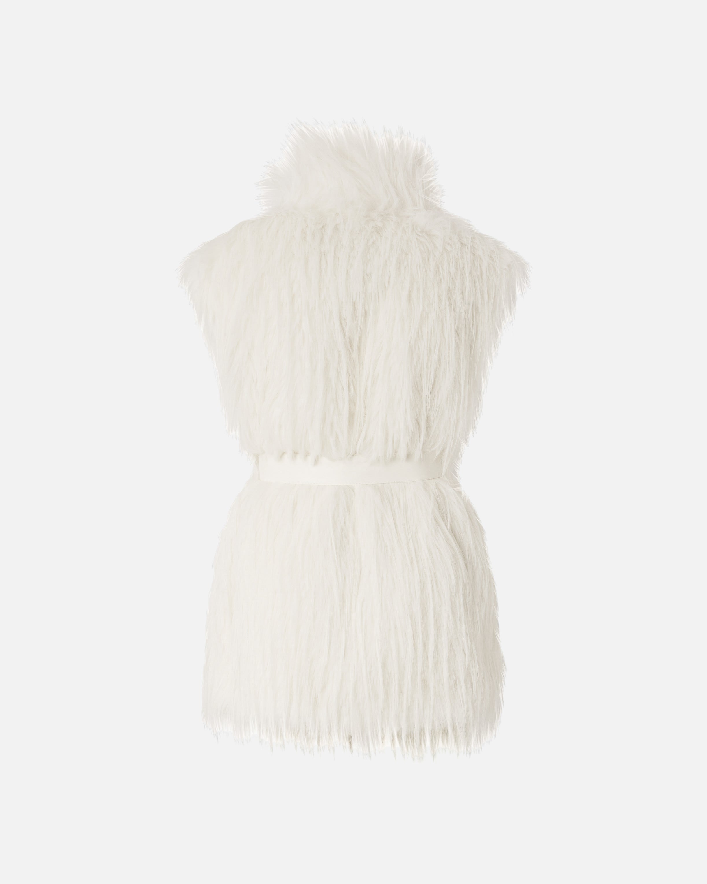 Gilet lungo a collo alto realizzato in un morbido tessuto Aspen effetto pelliccia. Il modello, pronto a regalarti un look da vera star, è completato da una chiusura frontale nascosta e da un raffinato nastro in tono da annodare in vita, ed è foderato per assicurare un indosso confortevole.