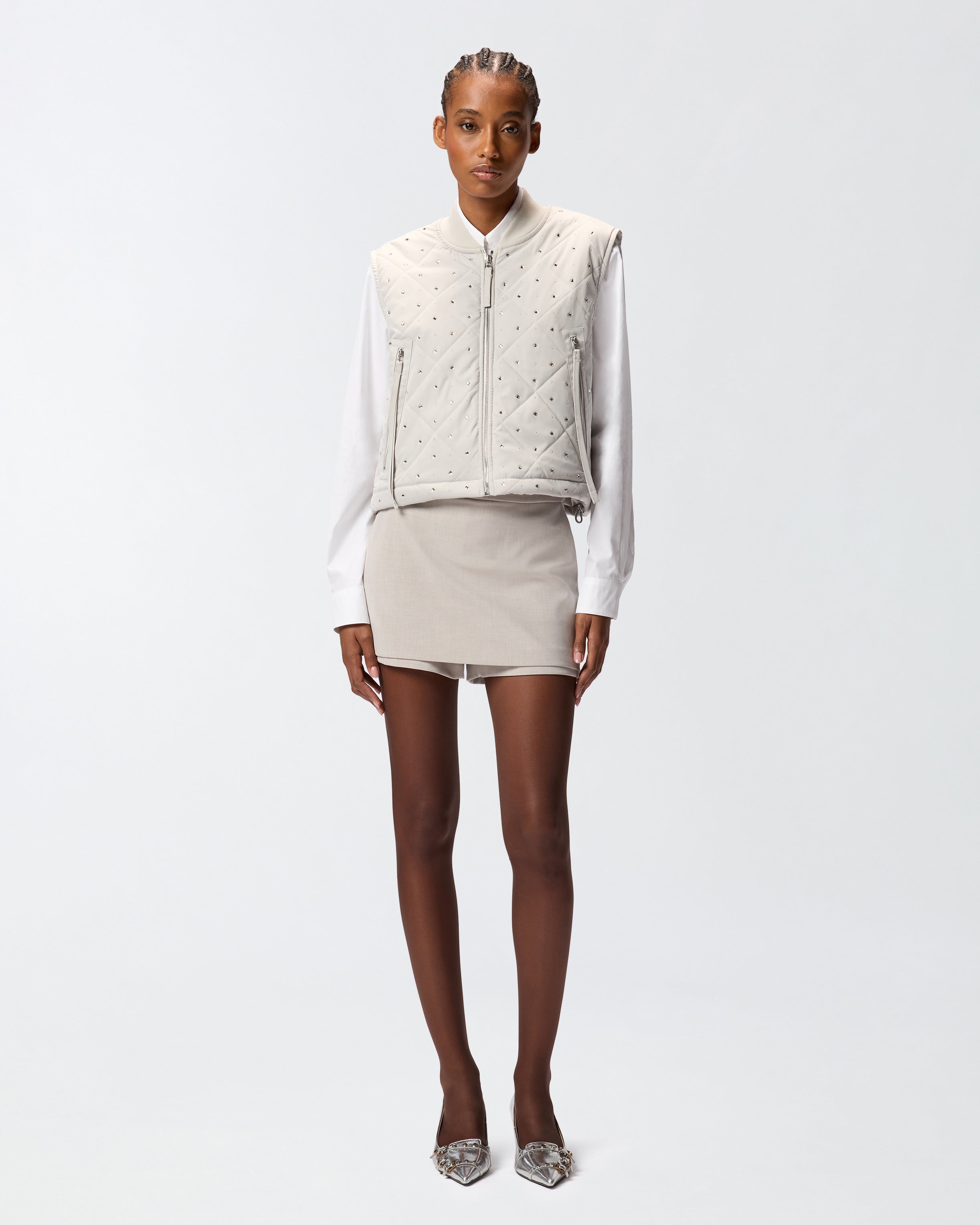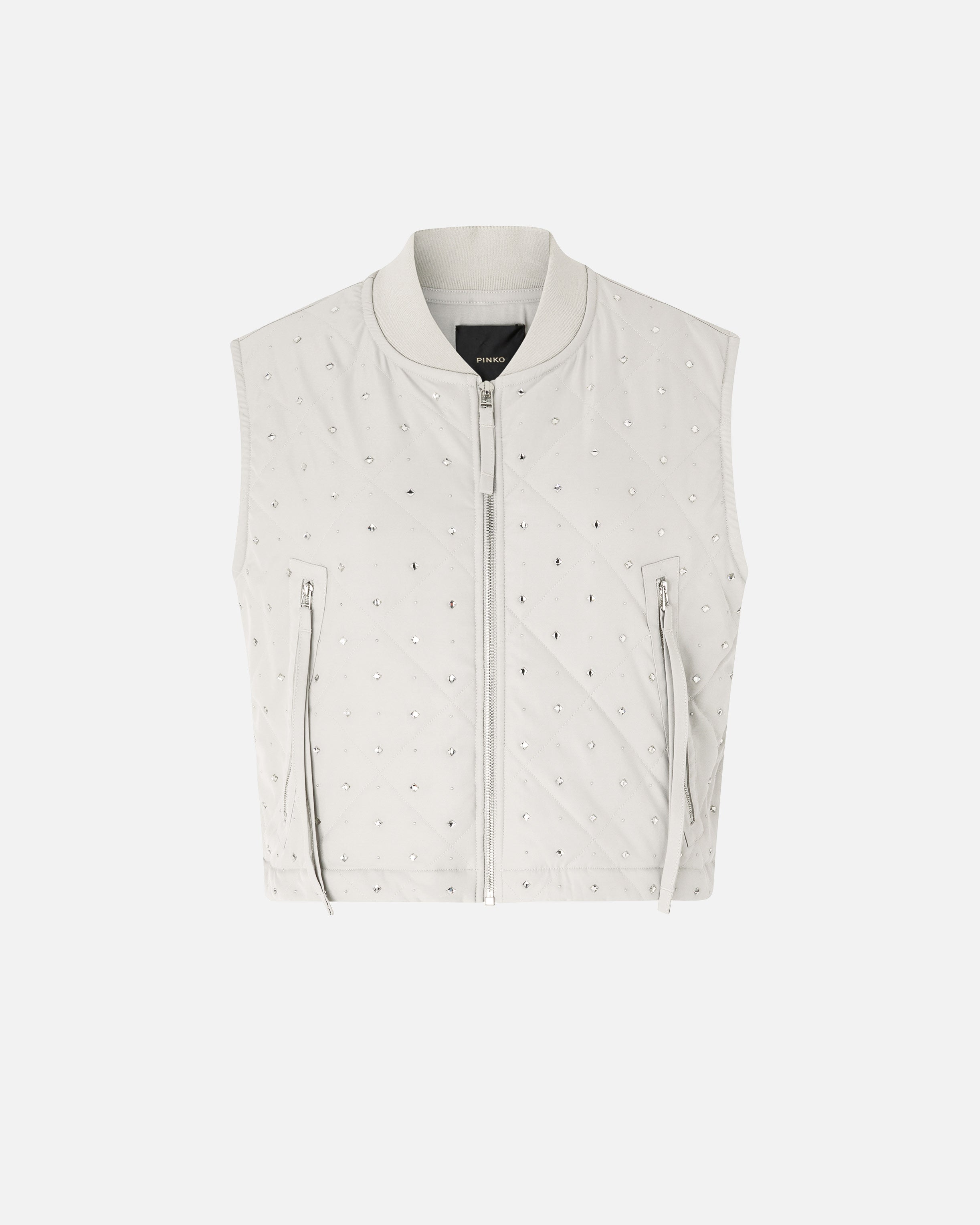 Gilet realizzato in tessuto diagonale dal finish opaco trapuntato e leggermente imbottito. Il modello risulta funzionale grazie alle tasche laterali con zip dotate di laccetti in tono, alla chiusura frontale con zip nascosta, e alla maglia elasticizzata sul colletto per un comfort ottimale. Il carattere pratico del capo è perfettamente bilanciato dalla decorazione: un prezioso motivo all over con strass termoadesivi romboidali e micro borchie in metallo pronto a elevare i vostri outfit in puro stile PINKO.