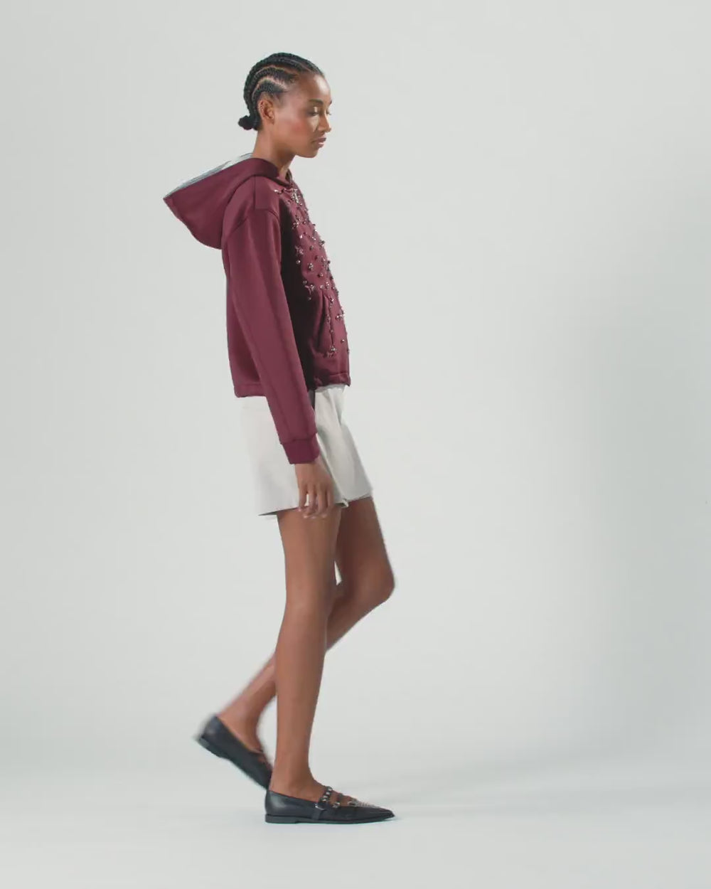 Giubbino stile felpa da donna con cappuccio e tasche laterali, realizzato in tessuto neoprene tecnico stretch. L'essenza sportiva del modello crea un originale contrasto con lo scintillante ricamo di cristalli e paillettes sul davanti, disposti in modo da formare delle stelle. Questo capo originale non potrà fare a meno di illuminare le tue giornate e i tuoi outfit.