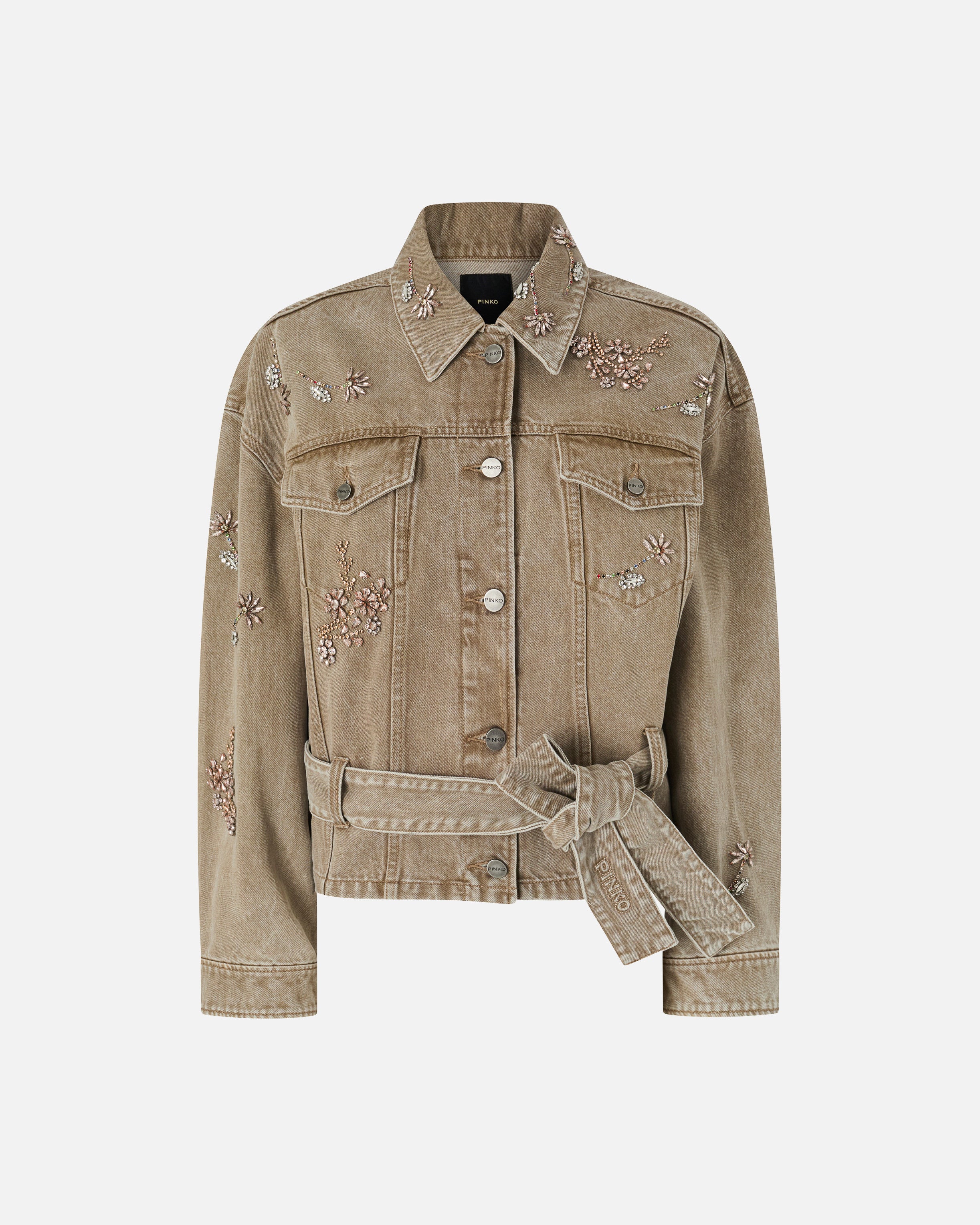 Giubbino con maniche lunghe e spalla scesa realizzato in denim di cotone e lyocell marrone e impreziosito da un motivo di fiori gioiello ricamati sul davanti. Il modello presenta polsini con bottoni, due tasche con patta e bottone sul petto e due tasche a filetto laterali, ed è rifinito da una cintura rimovibile dello stesso tessuto da annodare in vita. Un capo versatile e contemporaneo pronto a elevare i tuoi outfit quotidiani in puro stile PINKO.