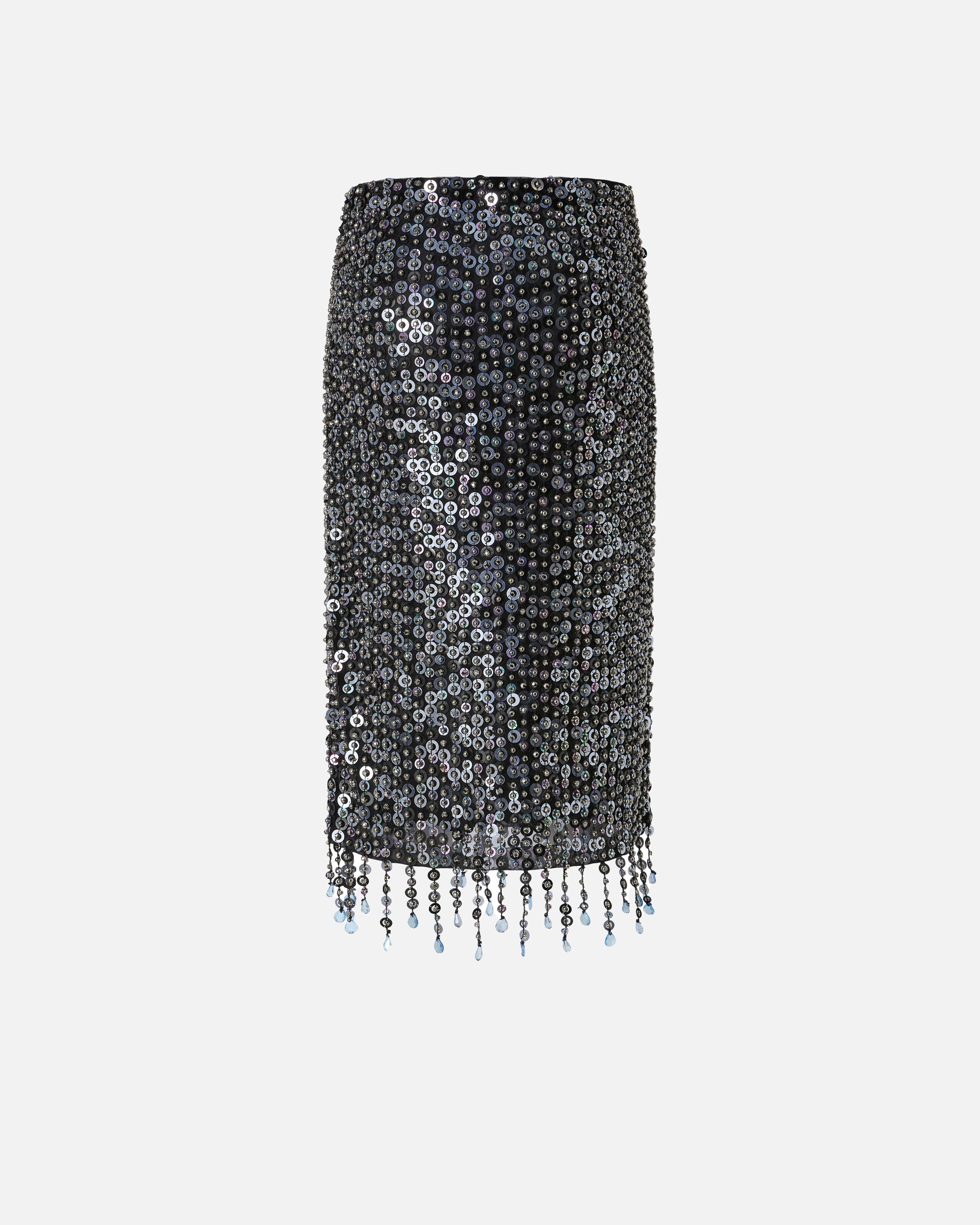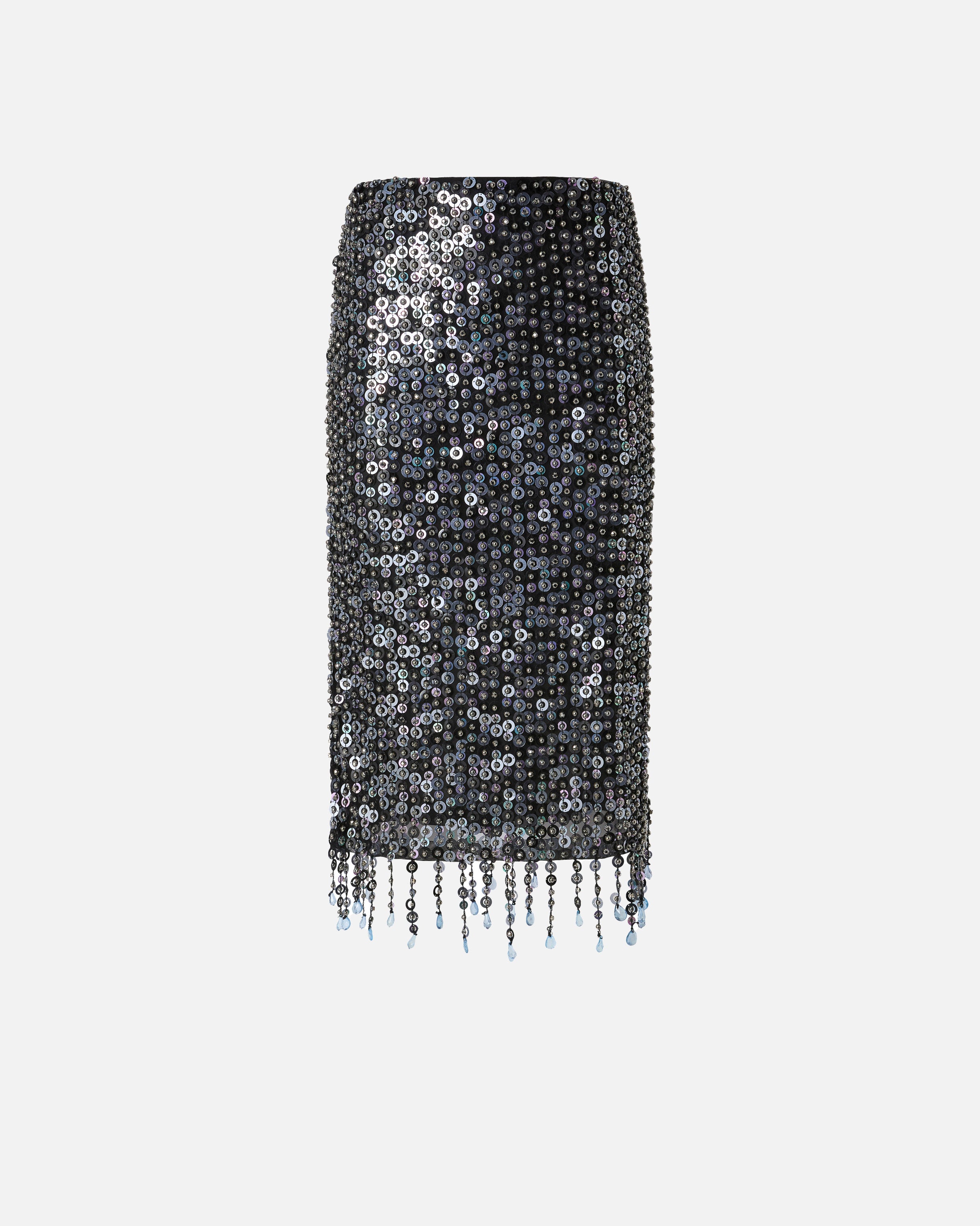 Gonna longuette a tubino impreziosita da una cascata di paillettes rotonde con all'interno cristalli di vetro e piccole sfere metalliche che creano luminosi riflessi nei toni del nero e del blu. Il fondo del capo è rifinito da sottili frange che ricadono in modo leggero e che conferiscono un tocco di dinamicità e movimento in puro stile PINKO. Indossa questa gonna insieme al top coordinato per un look da sera scintillante, oppure abbinala a una camicia o una blusa per un completo più formale che non passerà inosservato.