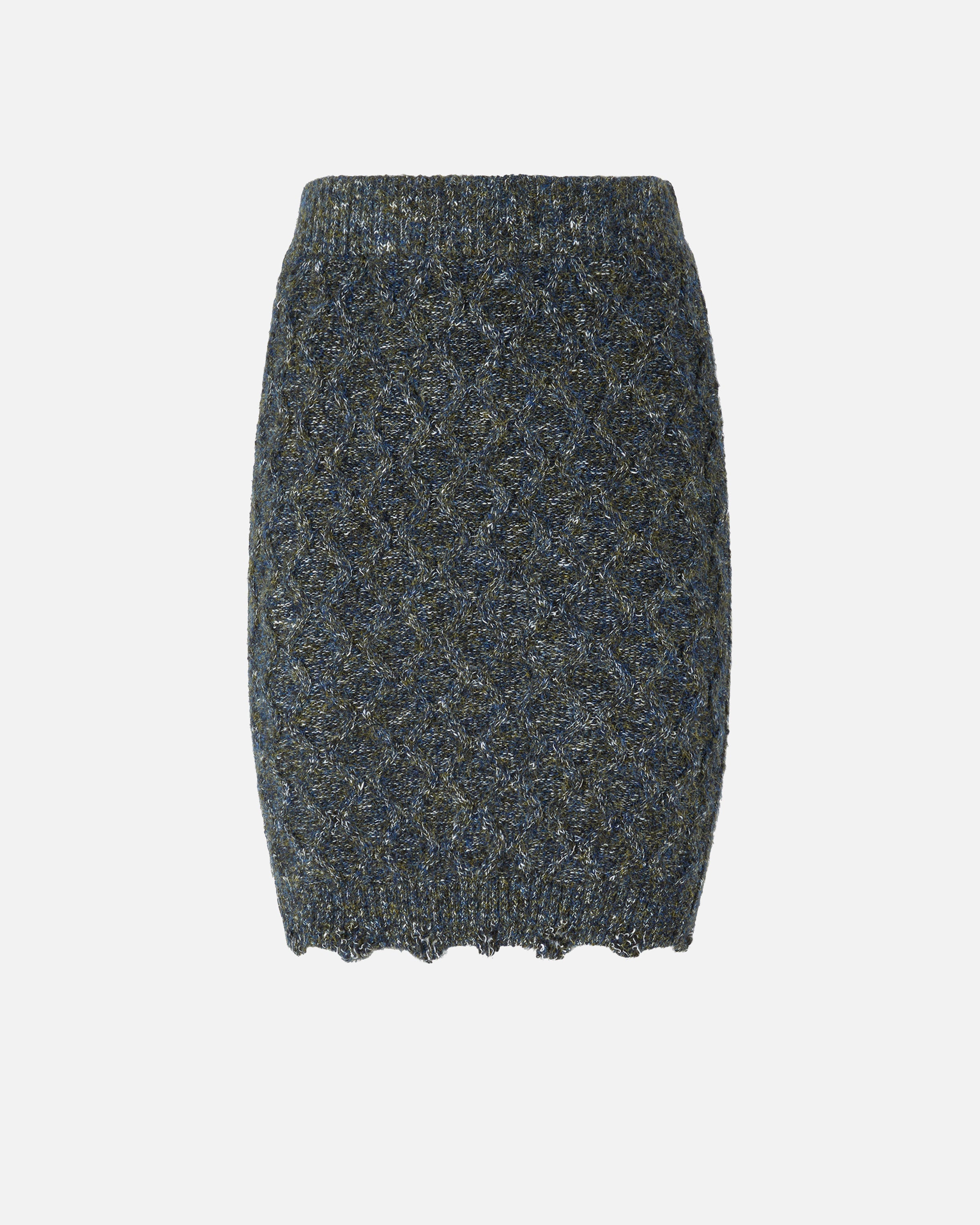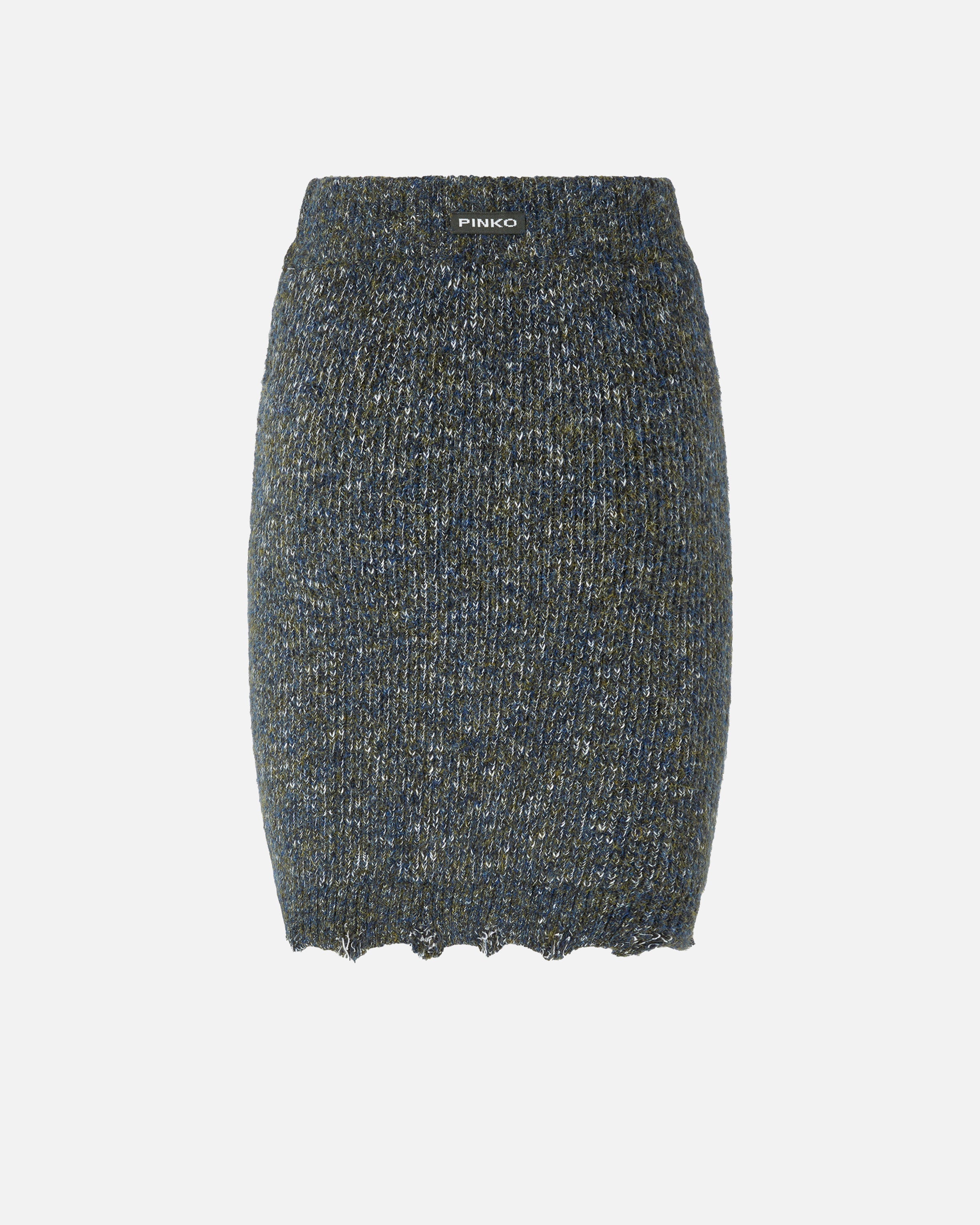 Gonna corta in maglia con filati di colori diversi, caratterizzata da una lavorazione a costine sul retro e dal punto treccia sul davanti che dona movimento e tridimensionalità al design. La fascia in vita, personalizzata da una piccola etichetta con logo lettering PINKO, è elasticizzata, così come l'orlo che presenta un delicato motivo smerlato. Scalda i tuoi outfit invernali con questo modello da abbinare al dolcevita coordinato per un total look raffinato ed essenziale. Il capo è stato sottoposto a prove di finissaggio per ridurre al minimo la possibile formazione di pilling, garantendo una maggiore morbidezza e durabilità del tessuto.