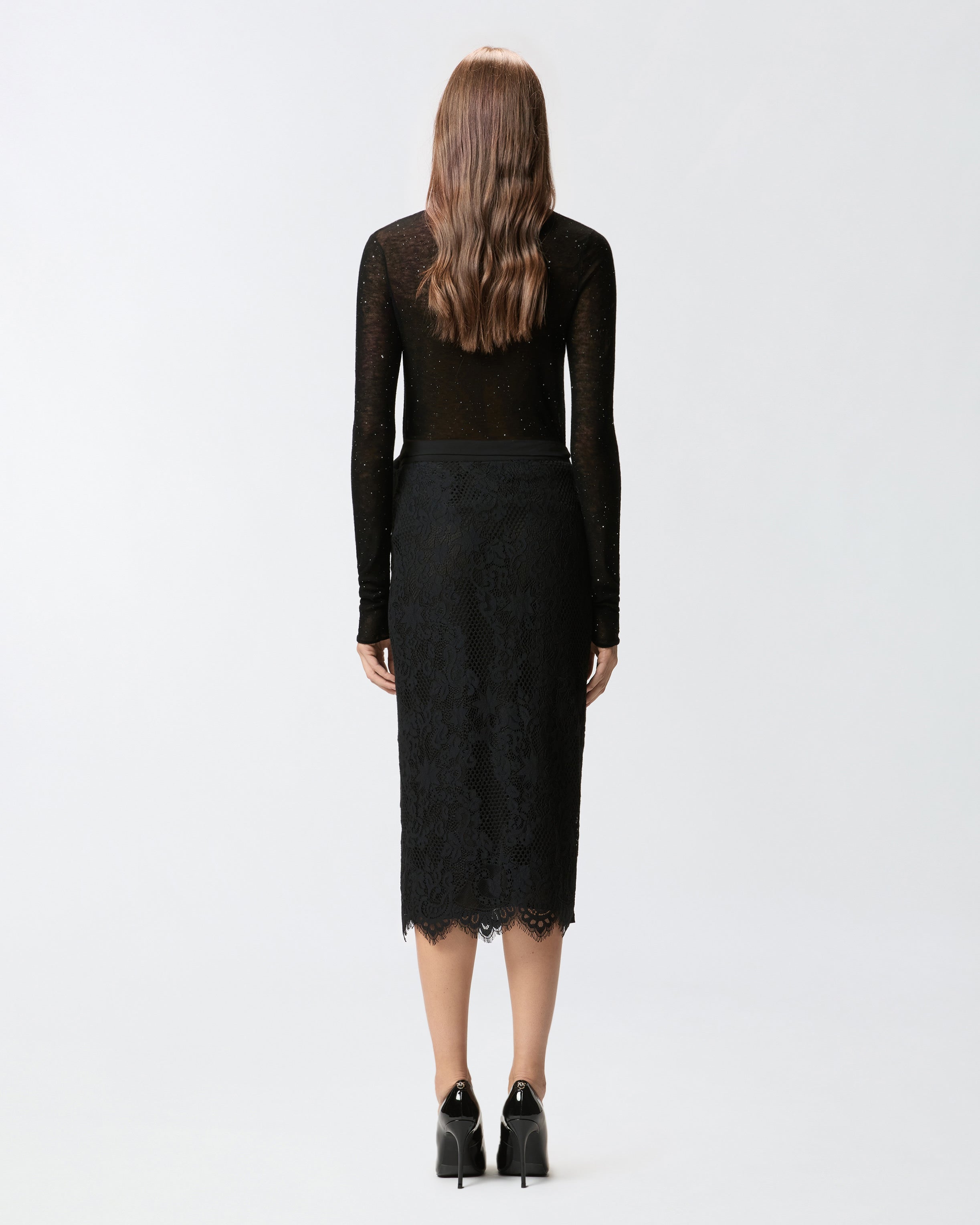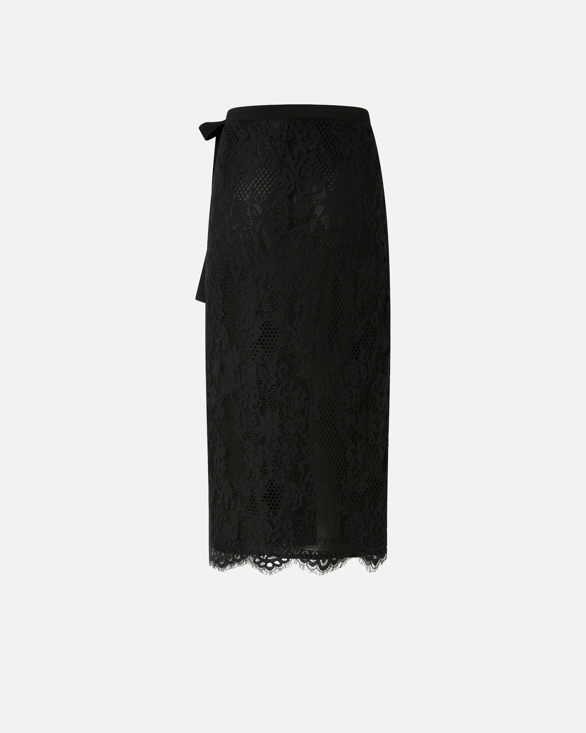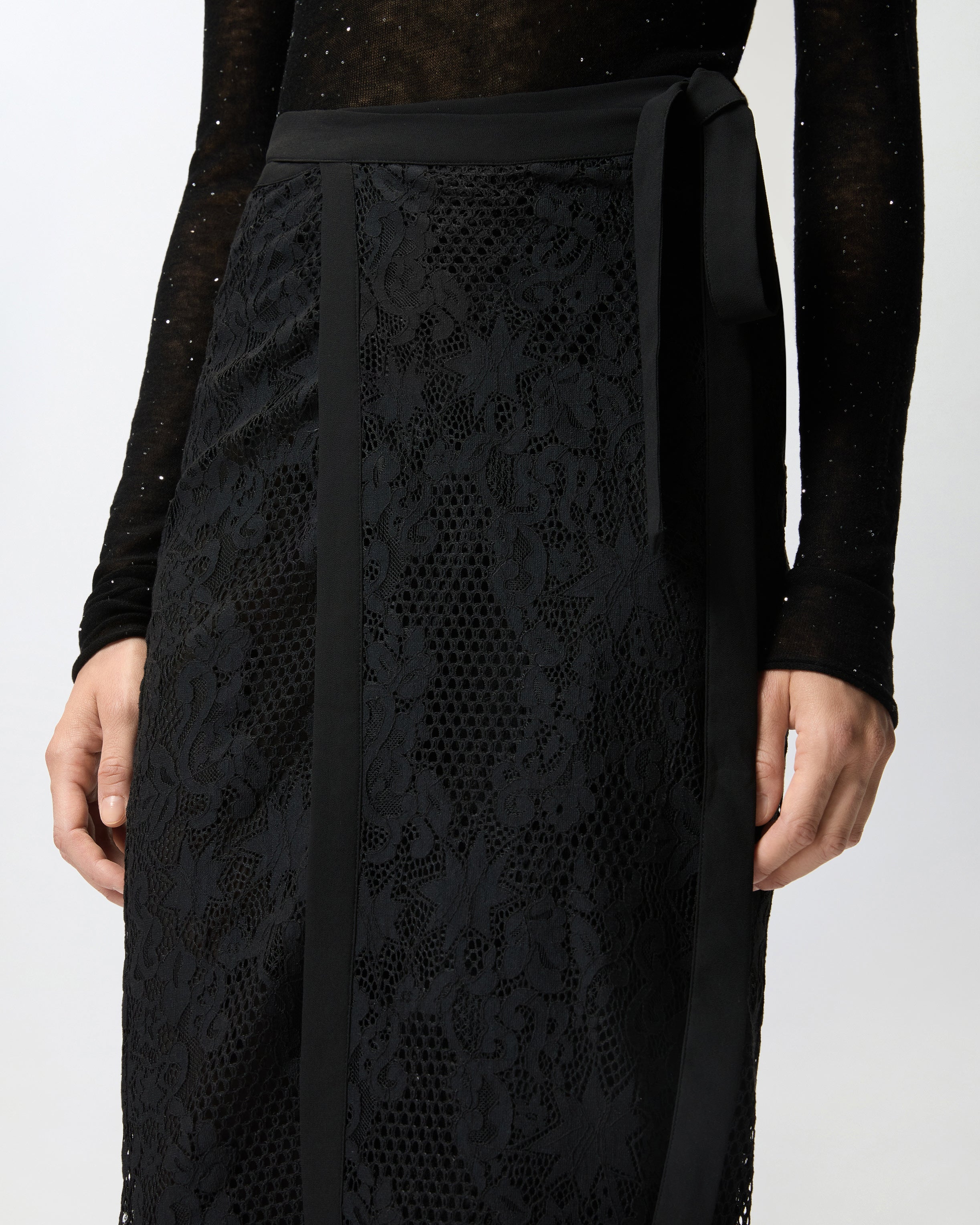 Gonna longuette con design a portafoglio completato da un nastro da annodare a fiocco sul fianco. Il capo è realizzato in raffinato pizzo rebrodè che scende delicatamente oltre il fondo, ed è rifinito da cintura e bordature in tessuto unito. Modello foderato. Abbina la gonna longuette al body in pizzo nello stesso colore per un total look femminile e audace.