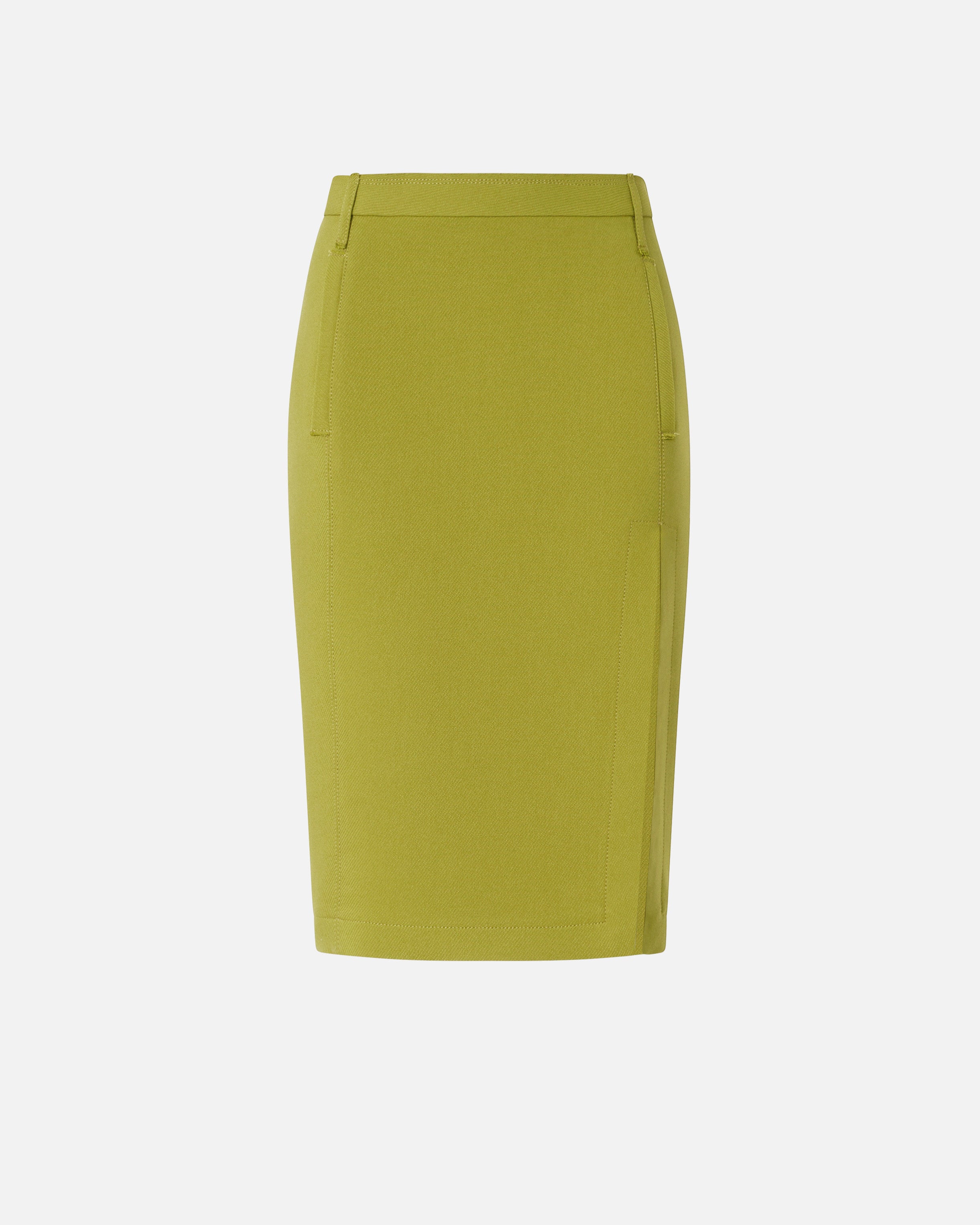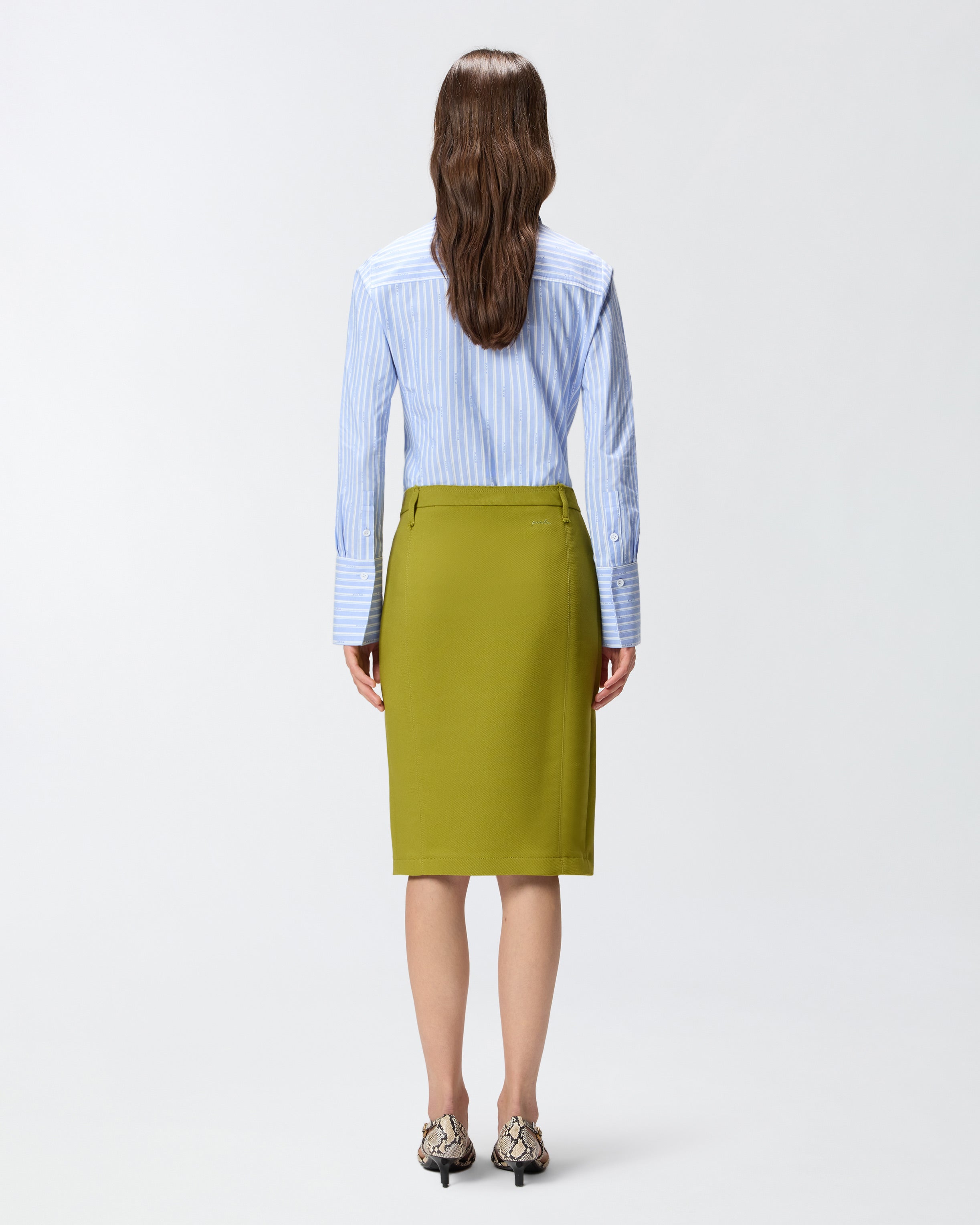 Gonna longuette dalla linea aderente realizzata in un tessuto doppio con armatura diagonale, particolarmente adatto anche per la mezza stagione. Dotato di una tasca con bottone a pressione e di discrete tasche laterali a filetto, il modello si distingue per lo spacco laterale sul davanti e l'originale sfrangiatura in vita, portavoce dell'estro creativo del brand. A rifinire la gonna, ideale per un un cocktail party o per un outfit da giorno, troviamo i passanti per cintura e il logo lettering PINKO ricamato sul retro che aggiunge ulteriore personalità. - GAILA GONNA