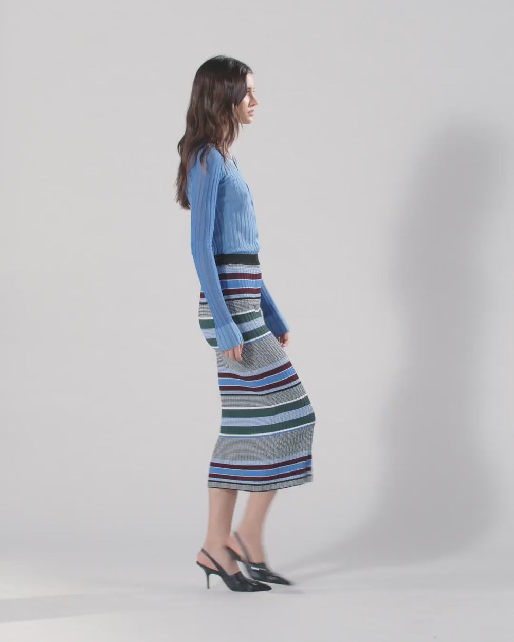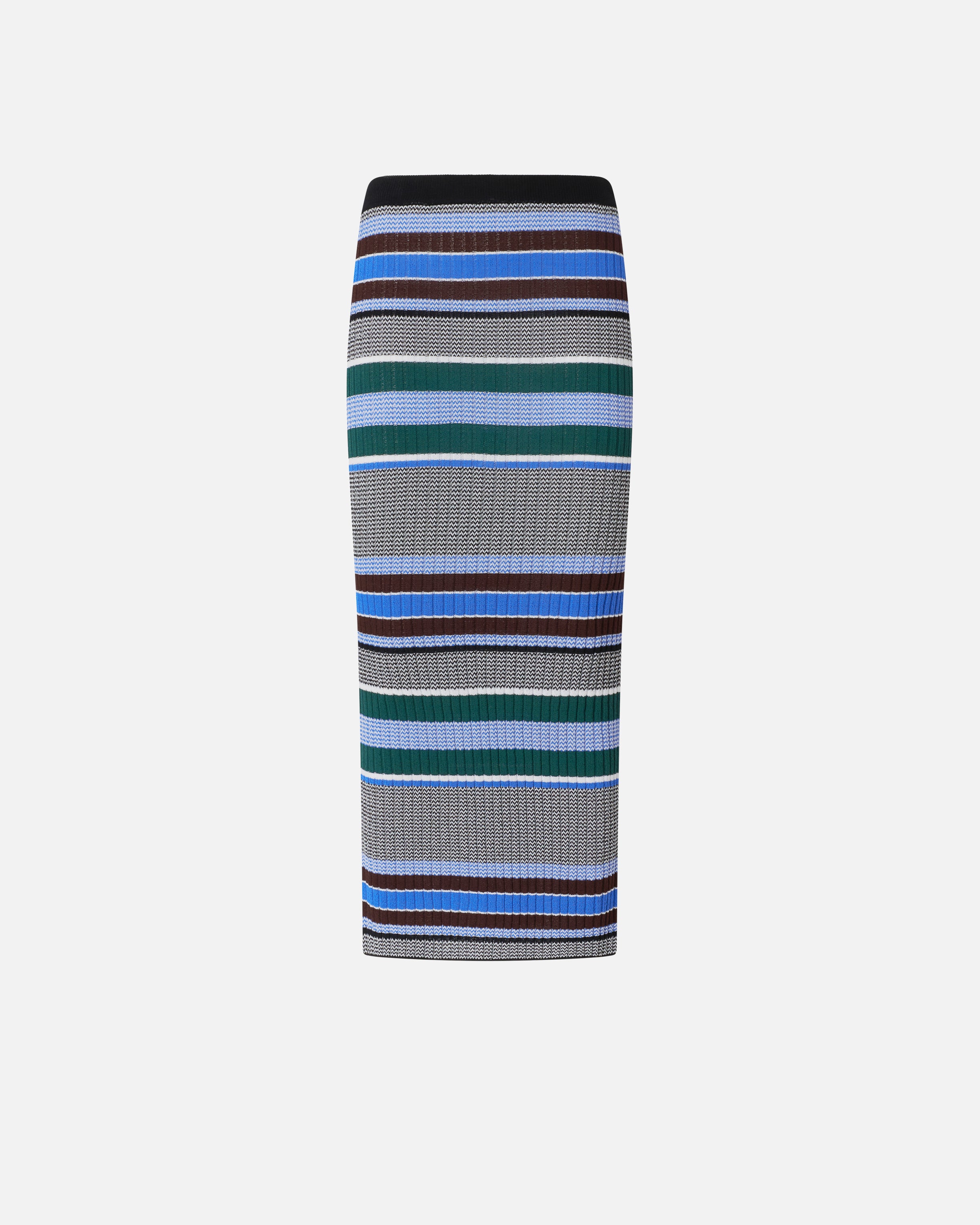 Gonna longuette dalla linea aderente con comoda vita elasticizzata. Perfetto per dare vita a inediti look da giorno, il modello è realizzato in maglia di viscosa lavorata a costine, un tessuto particolarmente elastico e confortevole pensato per accarezzare il corpo con naturalezza, ed è personalizzato da una fantasia a righe orizzontali multicolor di diverso spessore che dona ulteriore movimento e dinamicità. Il tocco finale è dato dall'etichetta con logo lettering PINKO sul retro.
