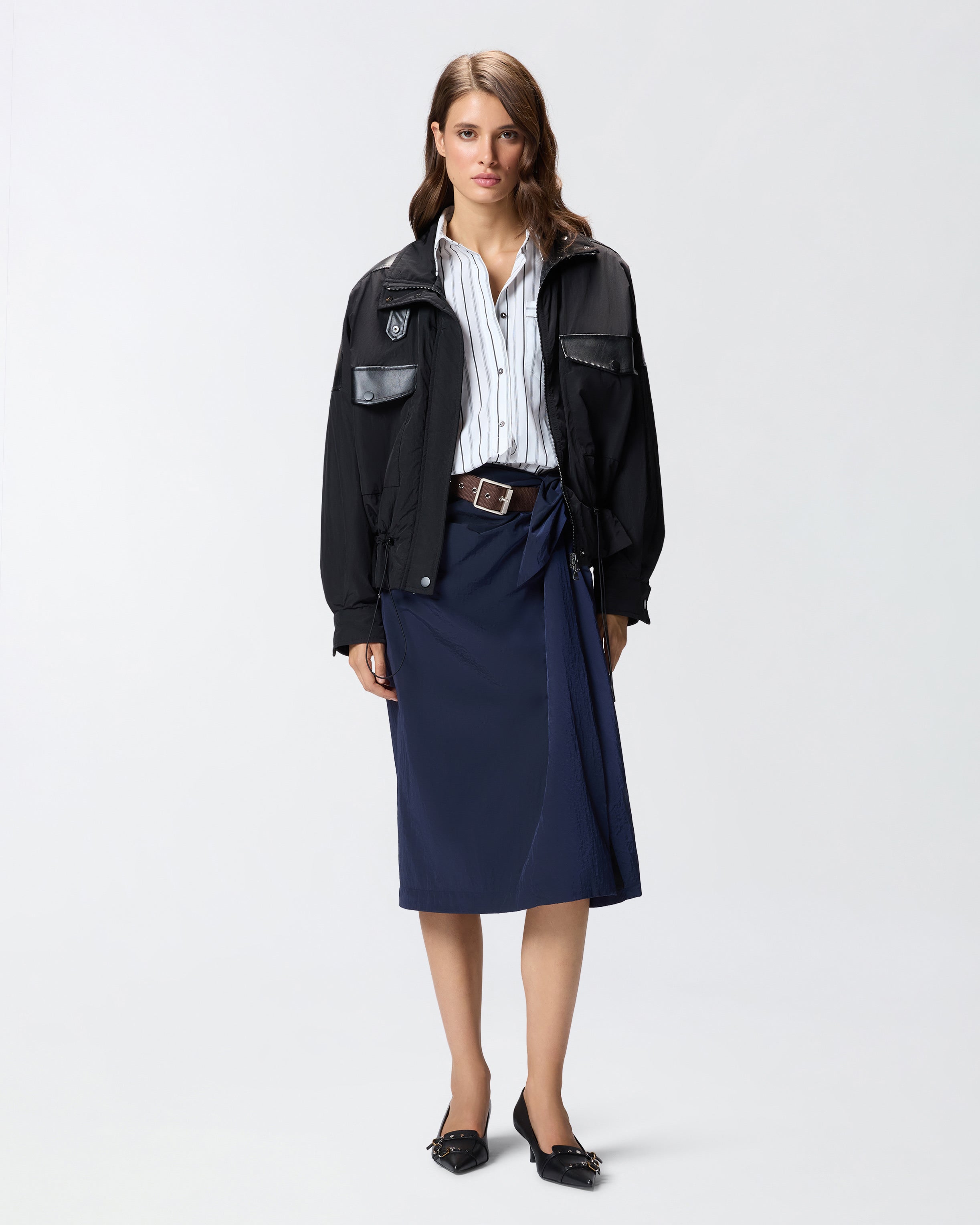 Gonna longuette dalla silhouette a pareo caratterizzata da una chiusura a portafoglio con morbidi nastri da annodare sul davanti. Il capo è realizzato in tela tecnica dal finishing opaco per un aspetto funzionale ed è completato da tasche posteriori a filetto e da una cintura in tessuto regolabile e rimovibile. Prova l'abbinamento con una camicia oversize e stivali alti per un outfit metropolitano dal carattere deciso.
