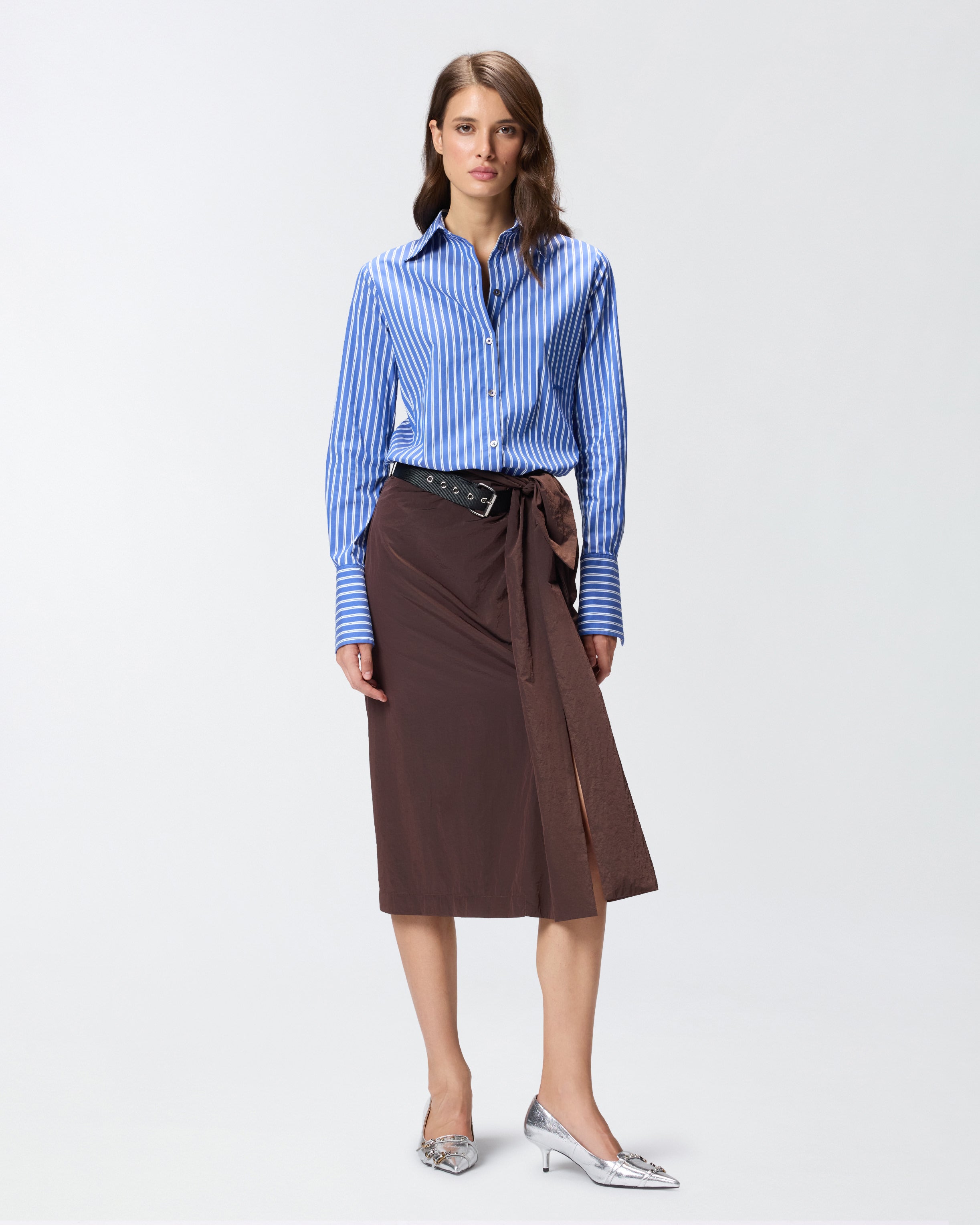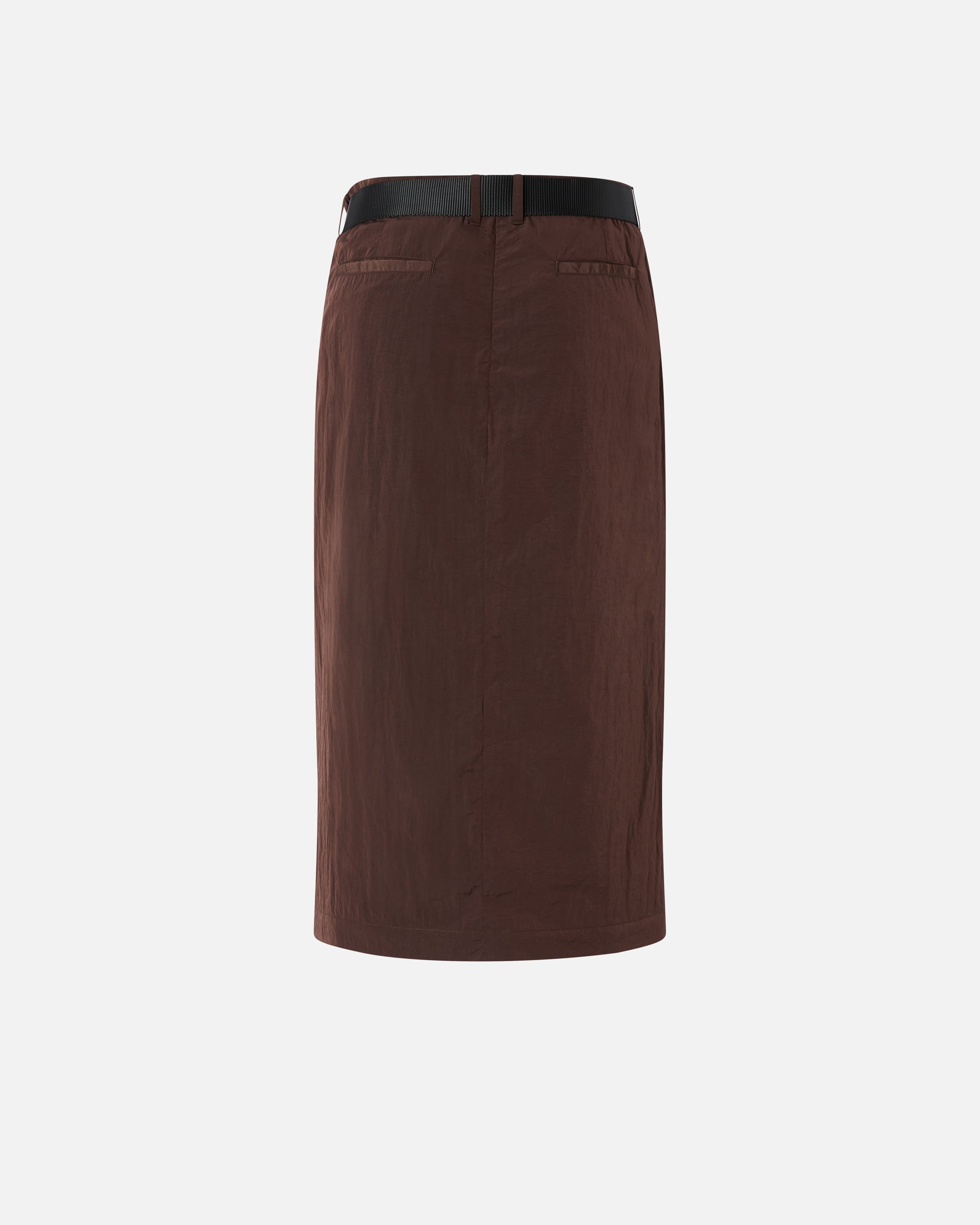 Gonna longuette dalla silhouette a pareo caratterizzata da una chiusura a portafoglio con morbidi nastri da annodare sul davanti. Il capo è realizzato in tela tecnica dal finishing opaco per un aspetto funzionale ed è completato da tasche posteriori a filetto e da una cintura in tessuto regolabile e rimovibile. Prova l'abbinamento con una camicia oversize e stivali alti per un outfit metropolitano dal carattere deciso.