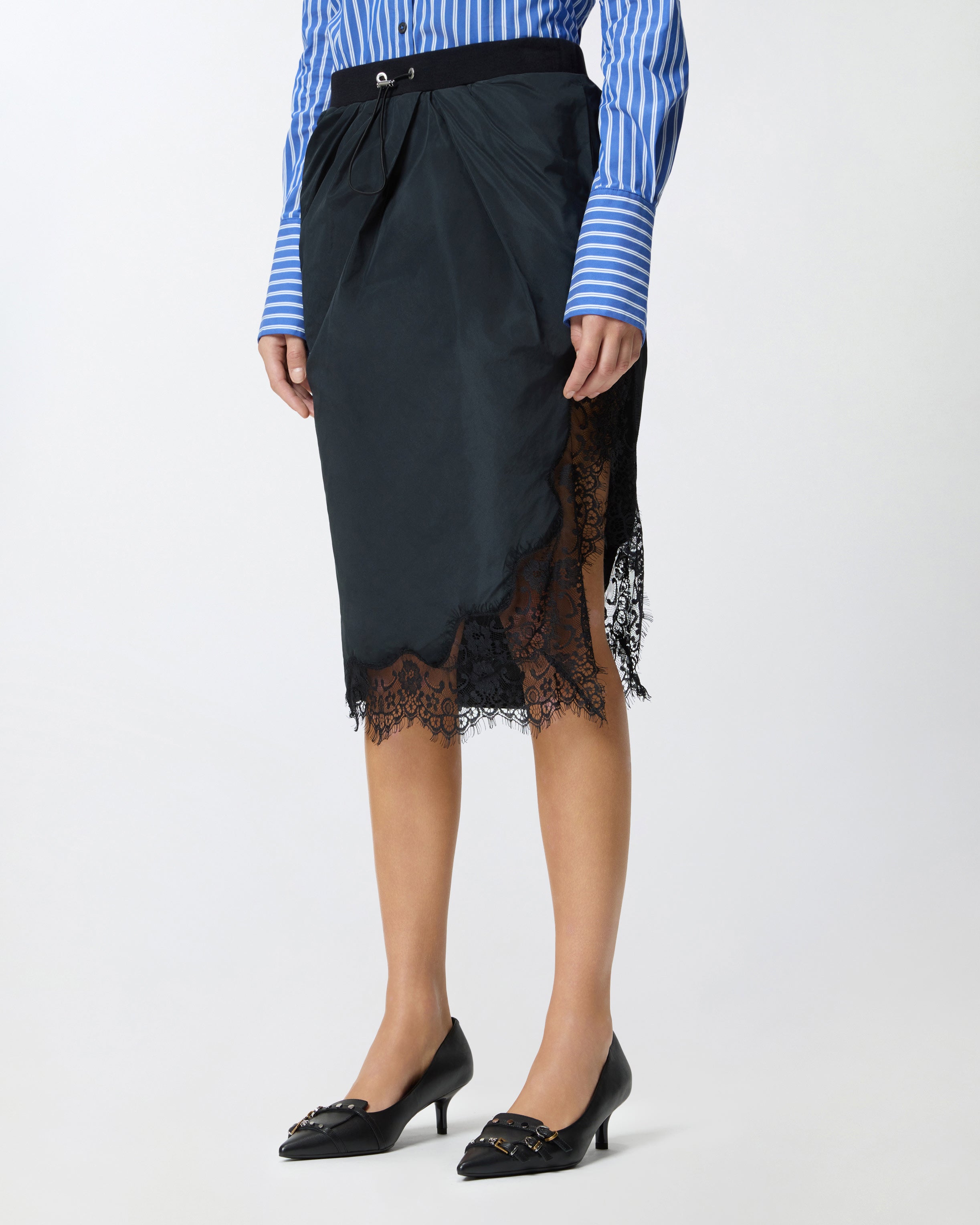 Gonna longuette realizzata in taffetà di microfibra dalla mano memory. L'effetto increspato del tessuto si sposa alla perfezione con l'inserto in pizzo intarsiato sull'orlo, creando un delicato effetto lingerie, mentre un tocco sportivo è dato dalla fascia elasticizzata con coulisse in vita d'ispirazione trekking per adattare il capo ad ogni silhouette. Questa gonna elegante ti accompagnerà con un tocco audace e femminile nelle tue occasioni speciali, in un outfit che non può passare inosservato.