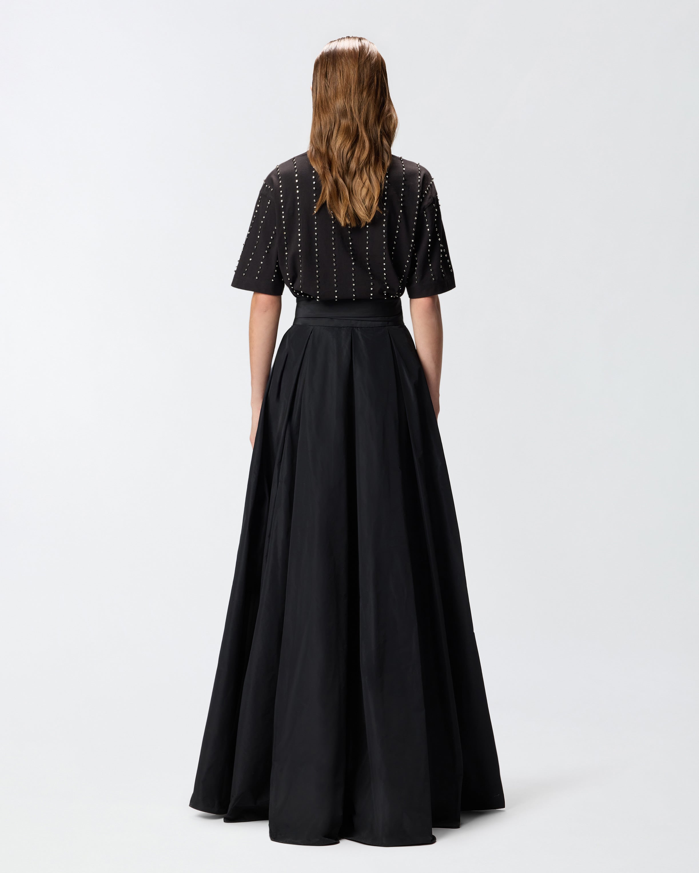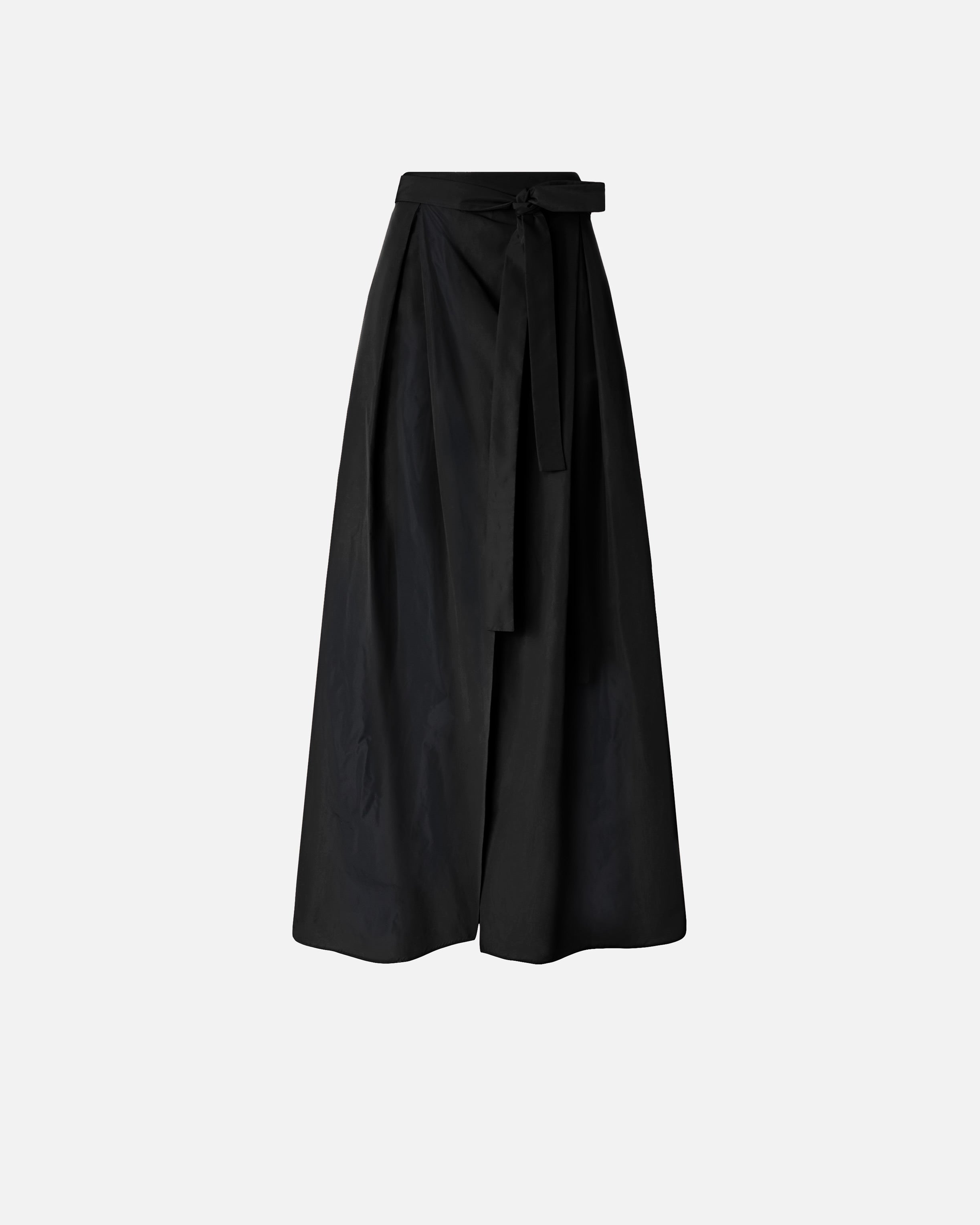 Gonna lunga e voluminosa, caratterizzata da una linea svasata con pieghe ampie che donano profondità e una chiusura a portafoglio con nastro coordinato da annodare in vita in base al proprio gusto. Il capo è realizzato in taffetà, un tessuto lucente dalla mano asciutta e decisa che rappresenta appieno il DNA PINKO, ed è la soluzione perfetta per risolvere i tuoi outfit da cerimonia della bella stagione: prova l'abbinamento con il crop top coordinato per un total look di grande impatto, oppure indossalo con un top a contrasto se preferisci ottenere un effetto spezzato.
