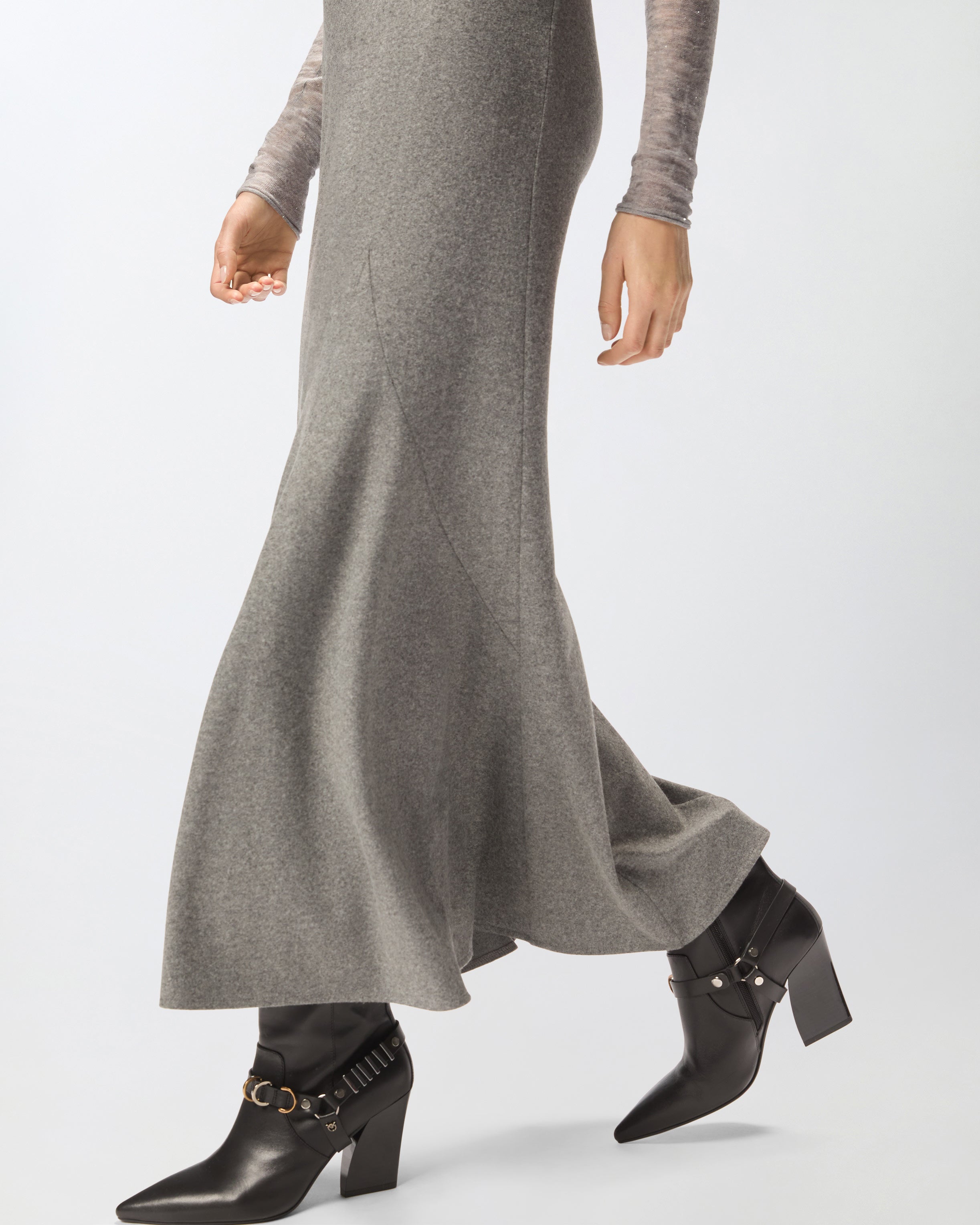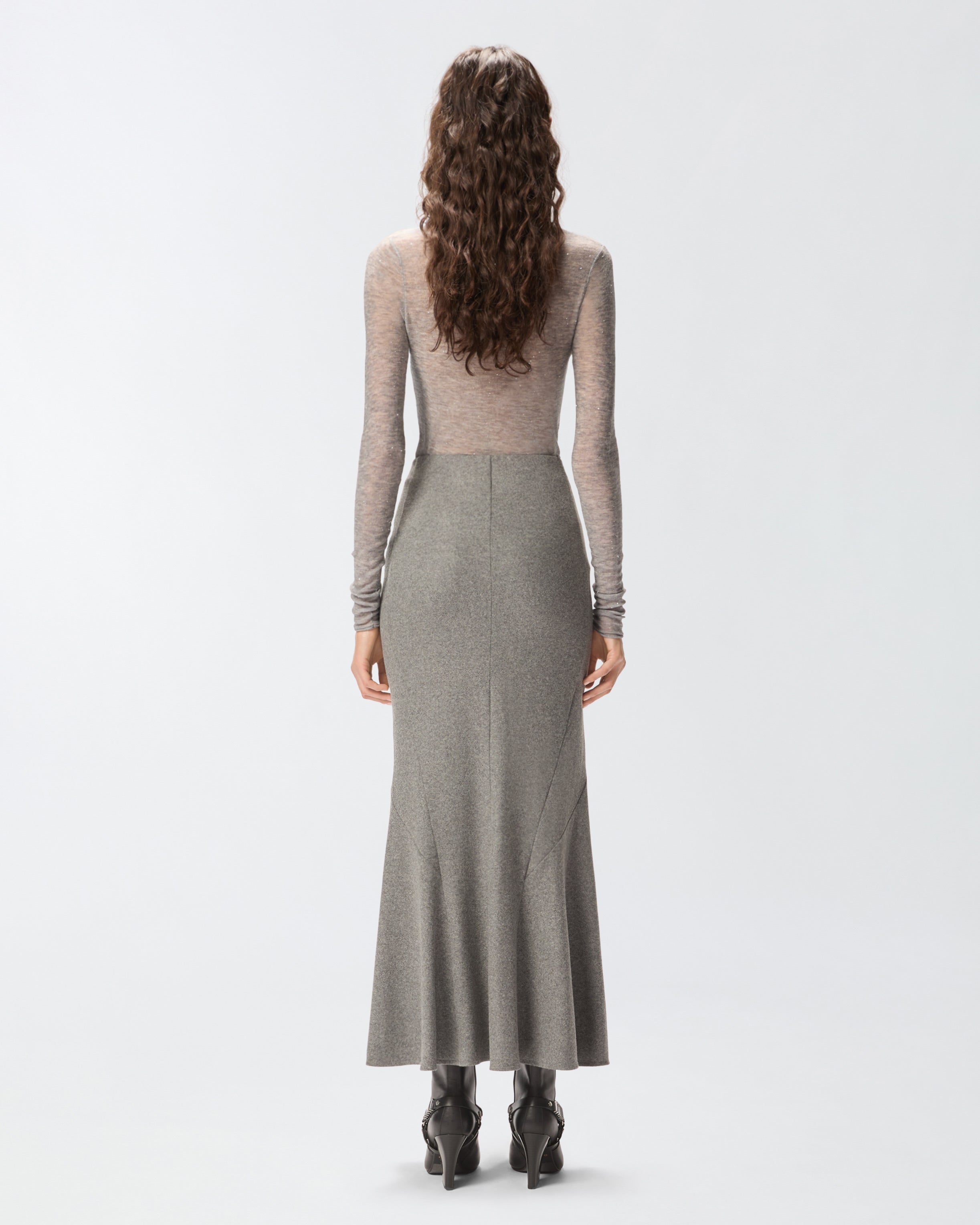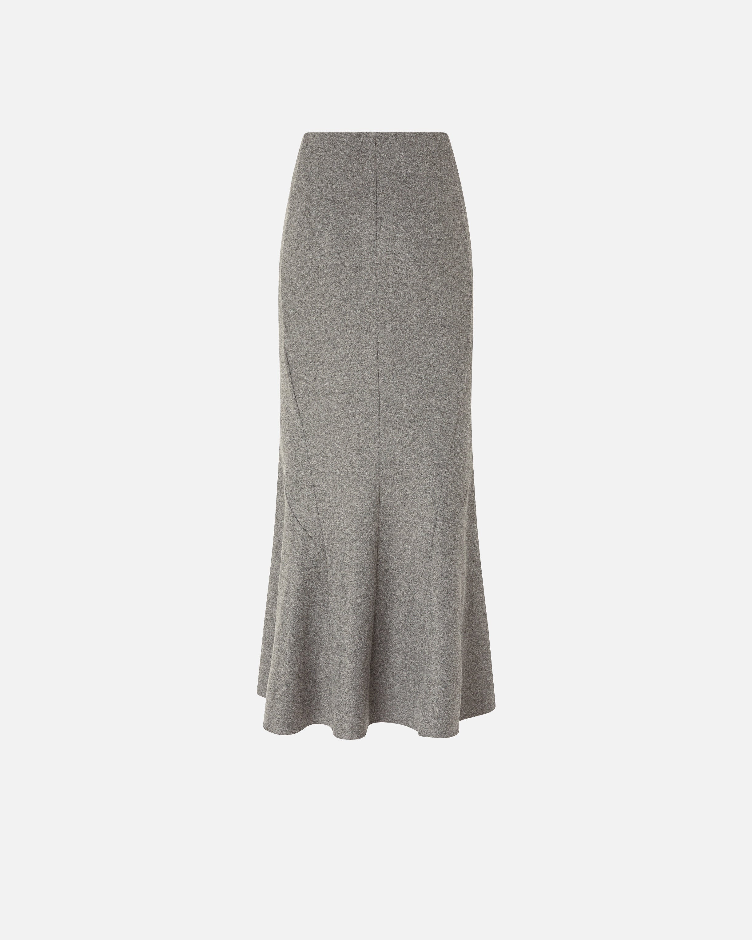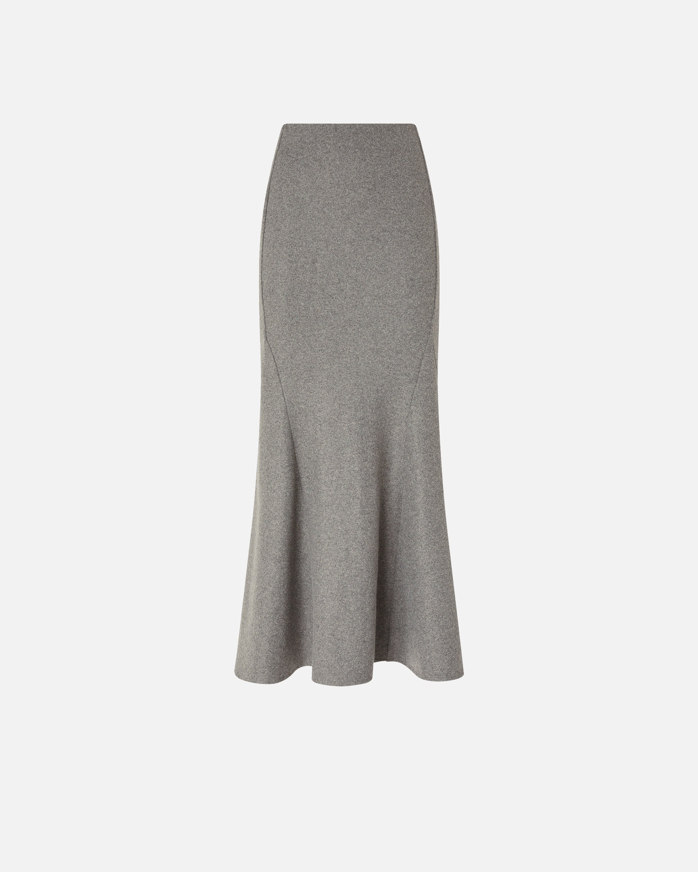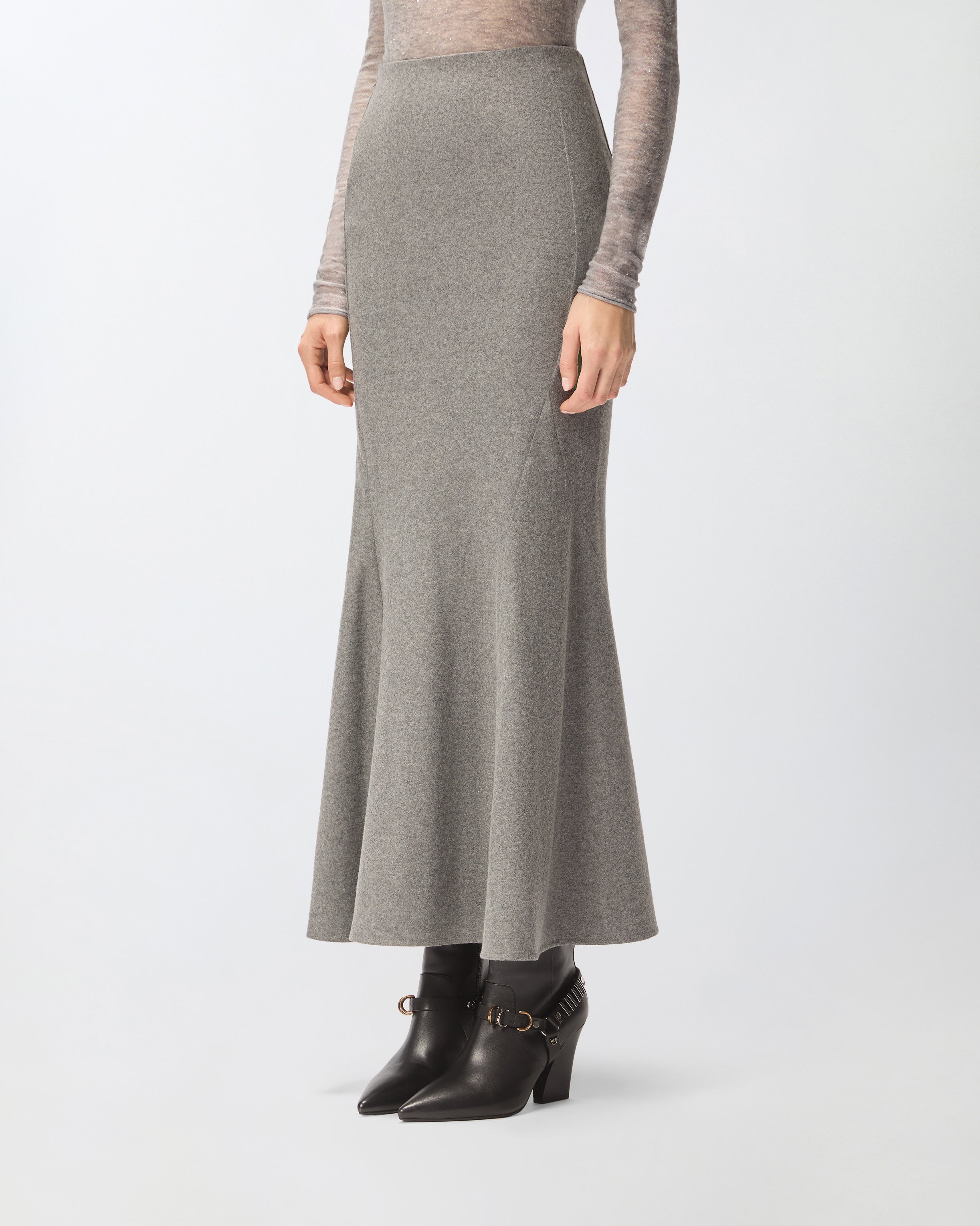 Gonna lunga e aderente realizzata in flanella di jersey di misto lana tinto in filo, un tessuto perfetto per combinare sartorialità e comfort. La silhouette tail, che si ispira alla linea a sirena, è essenziale ma viene scandita da cuciture ben definite ed è resa più morbida e fluida dalla svasatura al fondo. Chi ha detto che i capi formali non possano essere anche confortevoli? I tuoi look per l'ufficio non saranno mai più gli stessi.