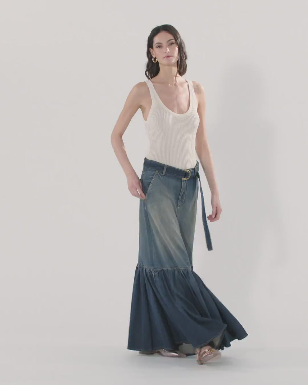 Gonna lunga dalla linea leggermente svasata in light denim di cotone e lyocell, caratterizzata da una mano fluida e da lievi scoloriture che donano movimento al tessuto. Il capo presenta una voluminosa balza sul fondo che dà origine a morbide pieghe, ed è dotato di due tasche applicate sul retro, per una nota funzionale, e di una cintura coordinata in vita con doppia fibbia a D da annodare a tuo gusto. Abbraccia la tendenza western e indossa questa gonna insieme a un paio di stivali texani e a una camicia con microfantasia. - GUARDIANO GONNA