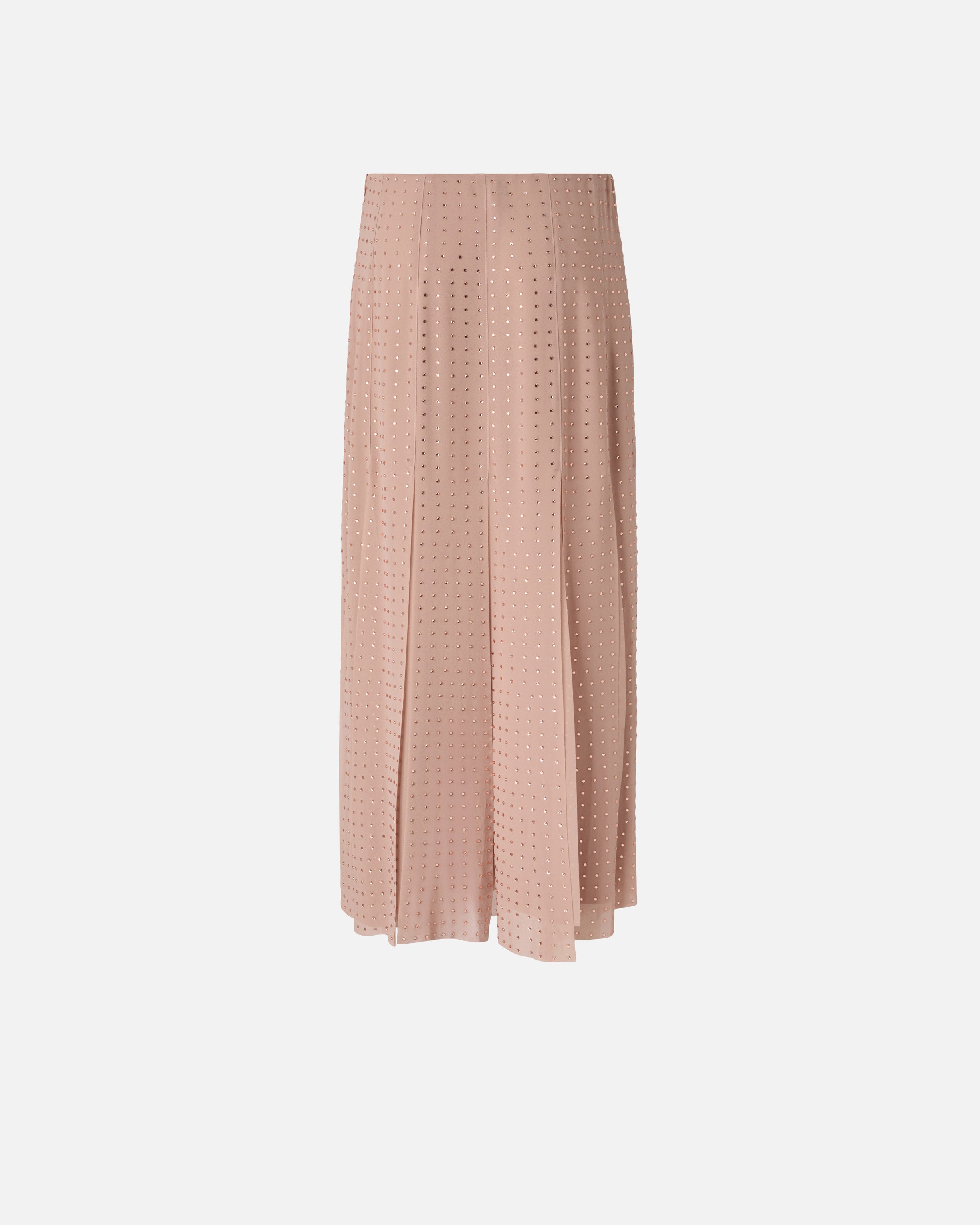 Gonna midi caratterizzata da inediti pannelli sul fondo che danno vita a frange larghe e creano l'illusione di un design a pieghe. Il modello è realizzato in un tessuto georgette dal raffinato aspetto opaco che accompagna il corpo con delicatezza e permette di ottenere una silhouette fluida e leggera, ed è impreziosito da brillanti strass disposti su tutta la superficie del capo, perfetta espressione del DNA PINKO. La gonna, foderata, è completata dalla chiusura laterale con zip invisibile, per offrire un tocco di funzionalità discreta senza interrompere la continuità della decorazione. - RUCOLA GONNA