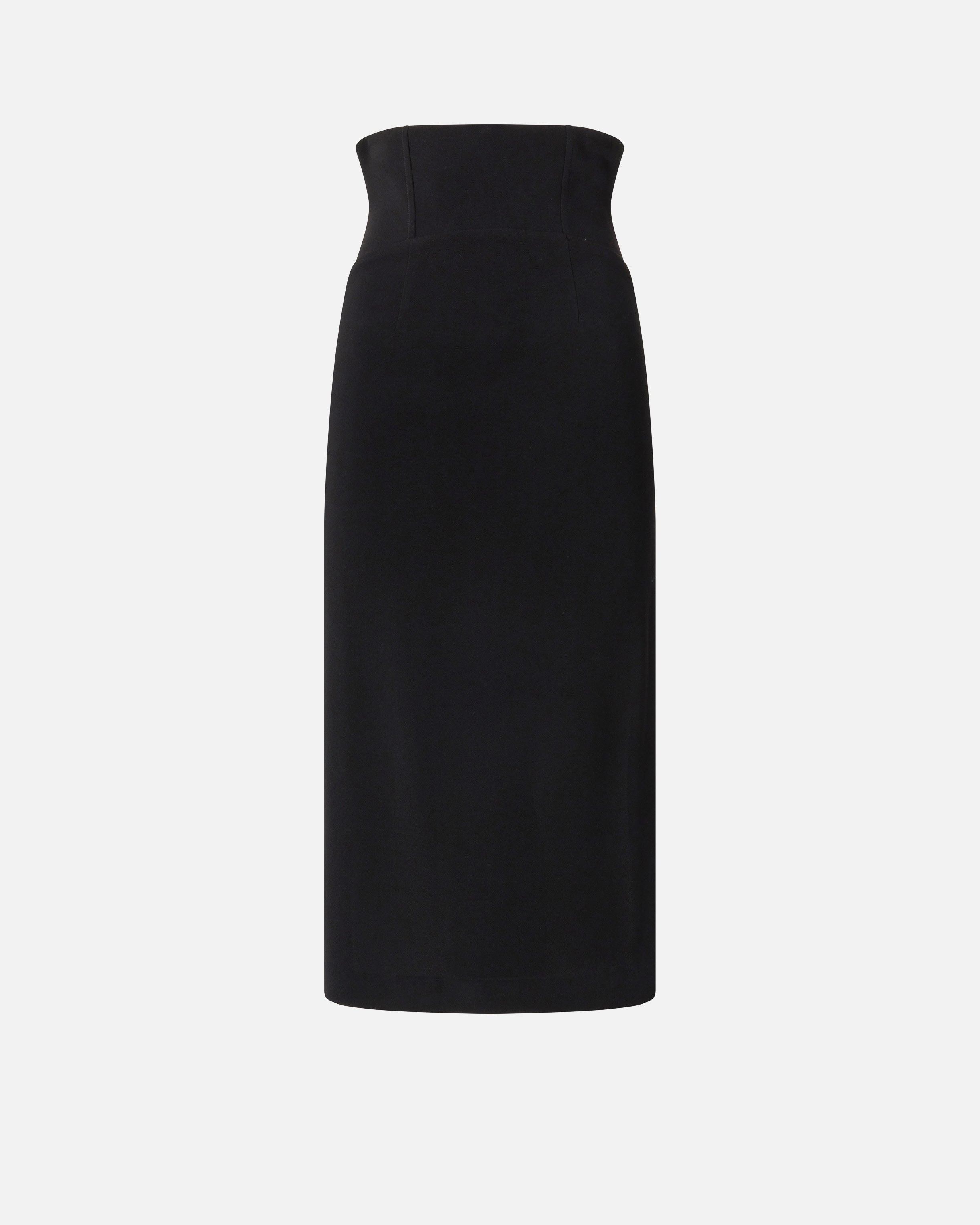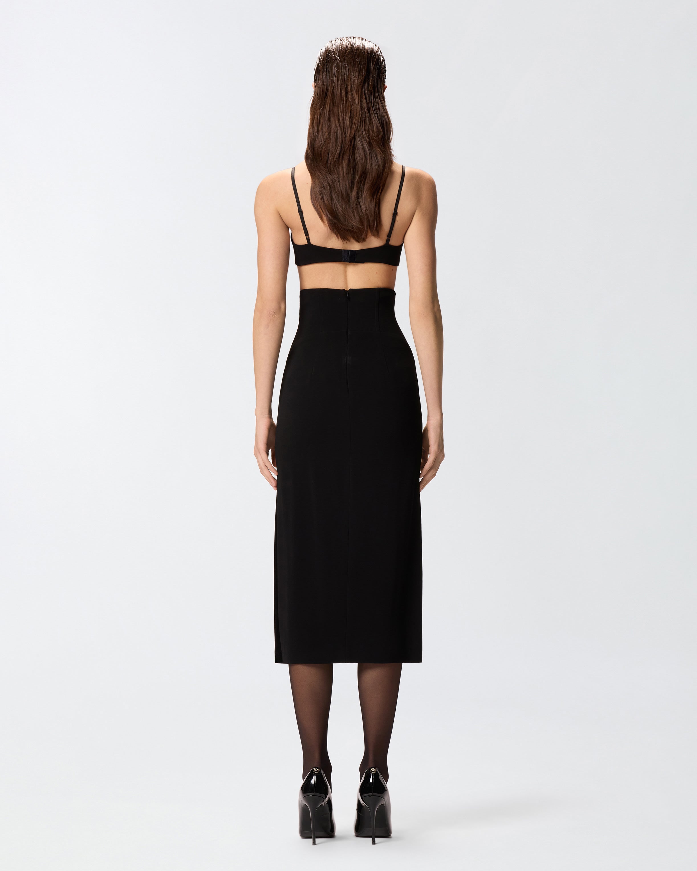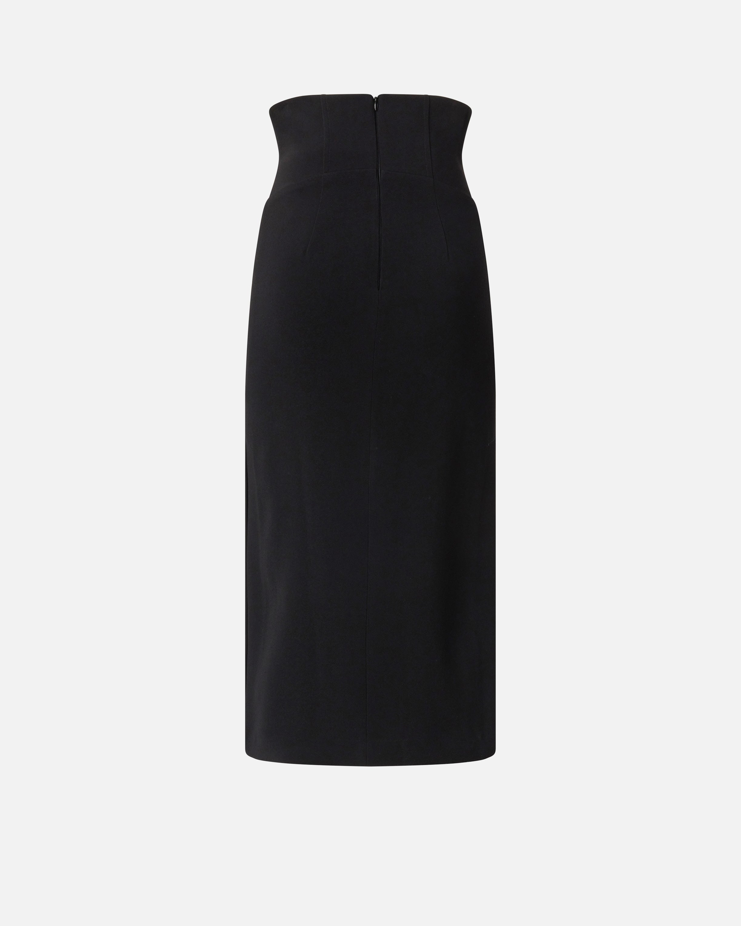 Gonna midi dalla linea aderente, realizzata in tessuto di viscosa stretch dall'aspetto compatto, perfetto per esaltare la figura, e dotata di eleganti spacchetti laterali e di una comoda chiusura con zip sul retro per facilitare l'indosso. La vera particolarità del capo risiede però nella vita, caratterizzata da un design molto alto messo in evidenza dalle stecche che donano struttura e ricordano i bustier femminili. Grazie alla sua particolare texture, ma anche per la silhouette femminile, questa gonna è perfetta per una serata speciale, abbinata alle tue décolleté preferite.