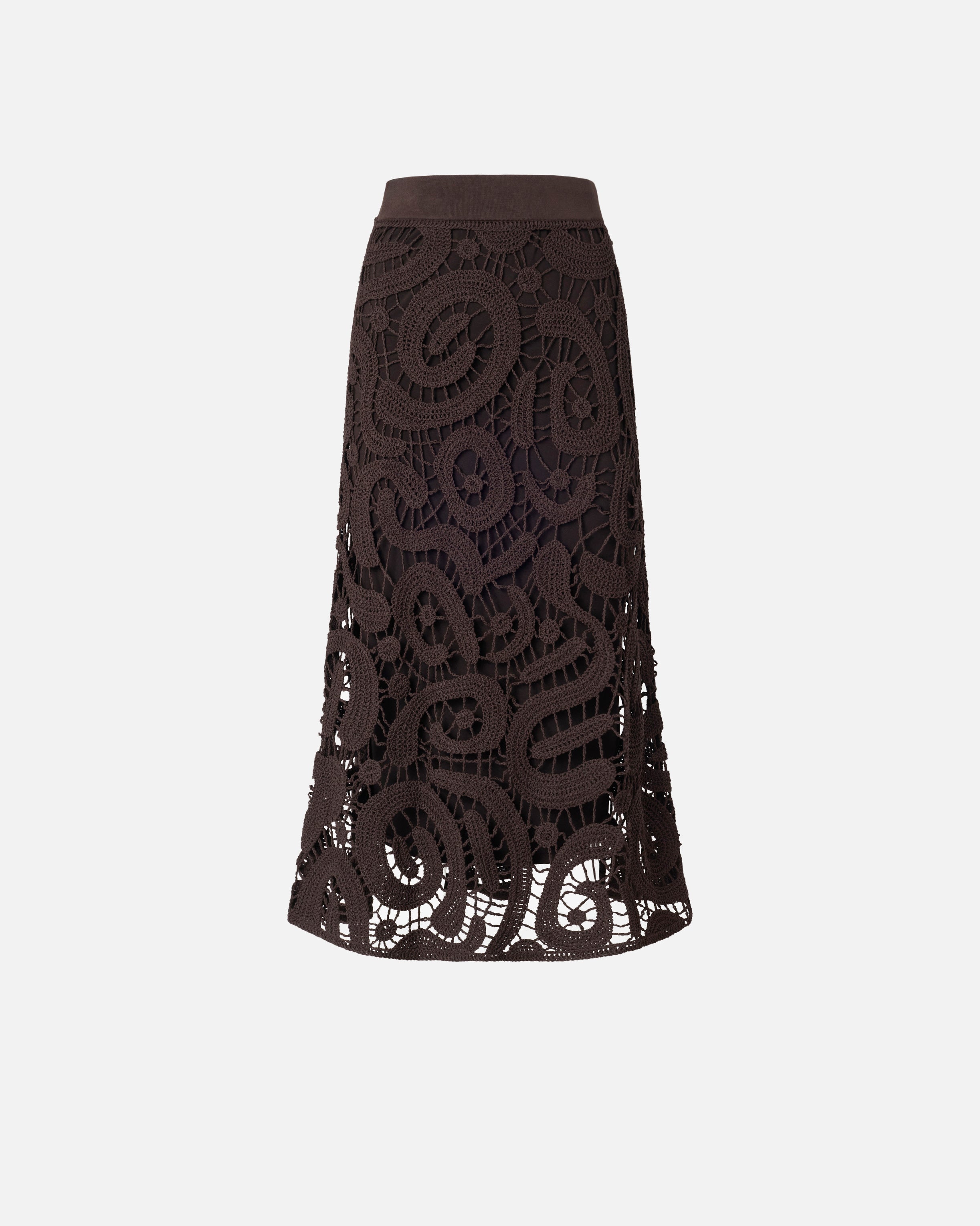 Gonna con lunghezza midi e linea svasata al fondo, dotata di vita elasticizzata e caratterizzata da una raffinata lavorazione crochet con un innovativo motivo geometrico che, anche grazie alla fodera interna, dona dinamismo al design e crea un effetto vedo non vedo.