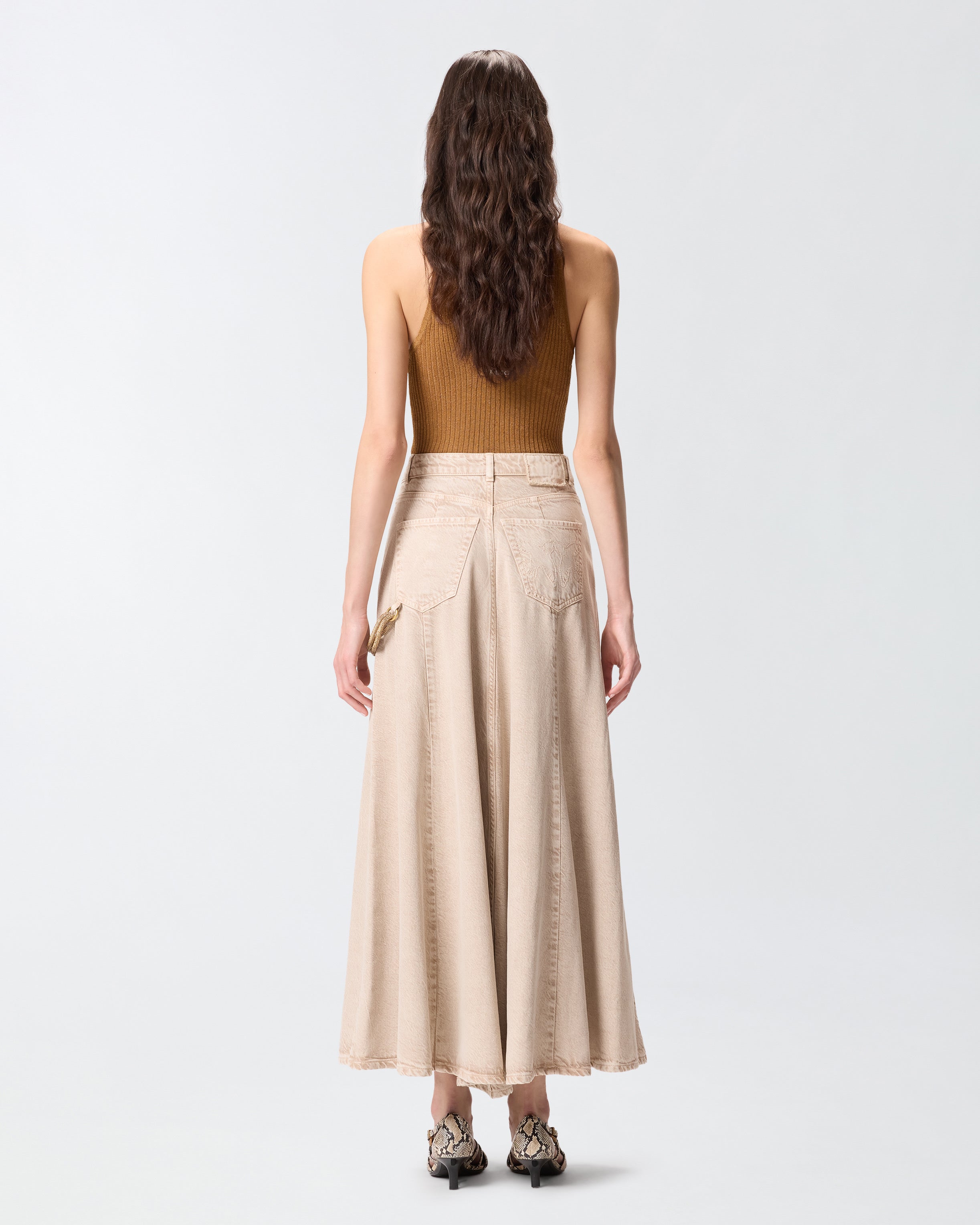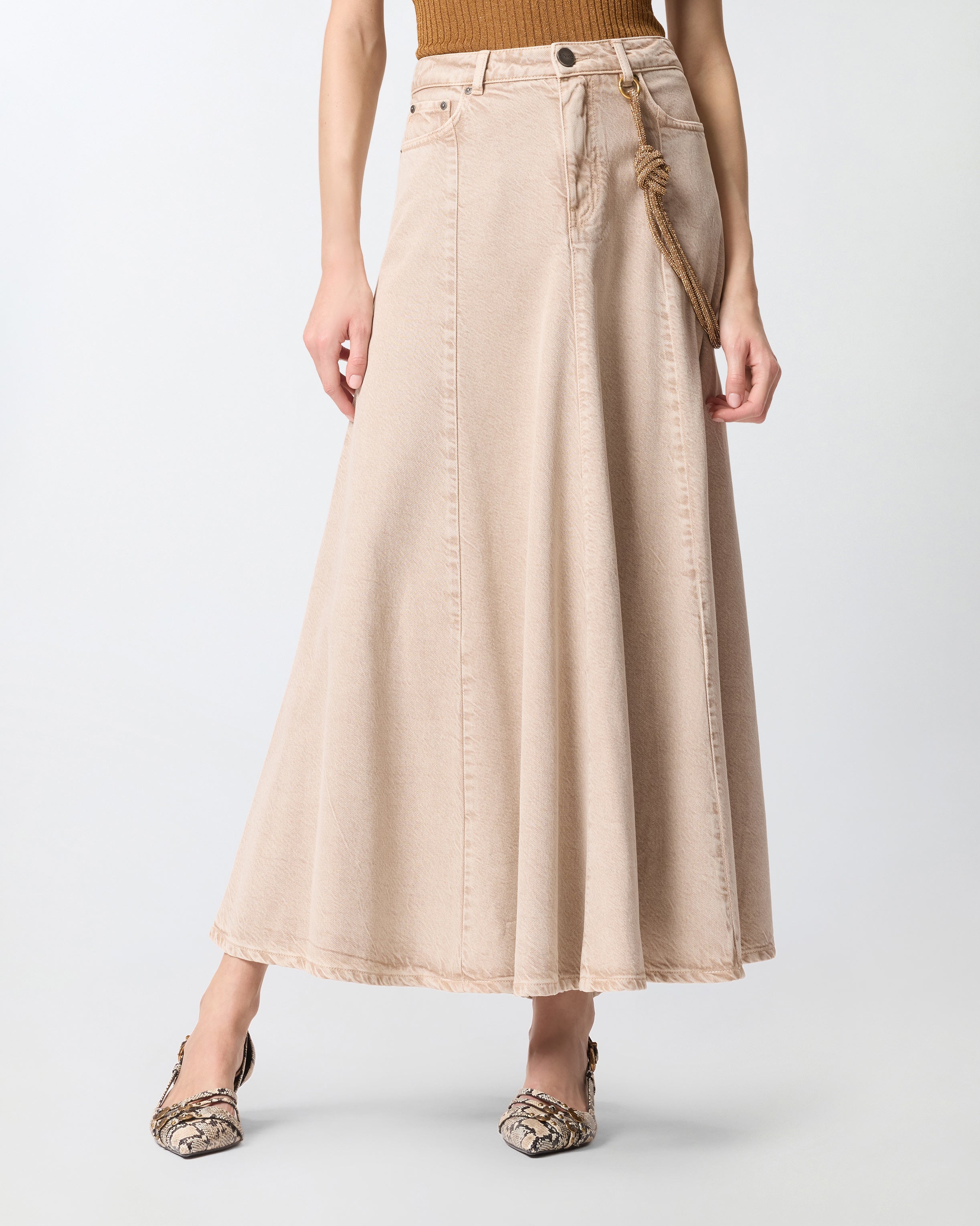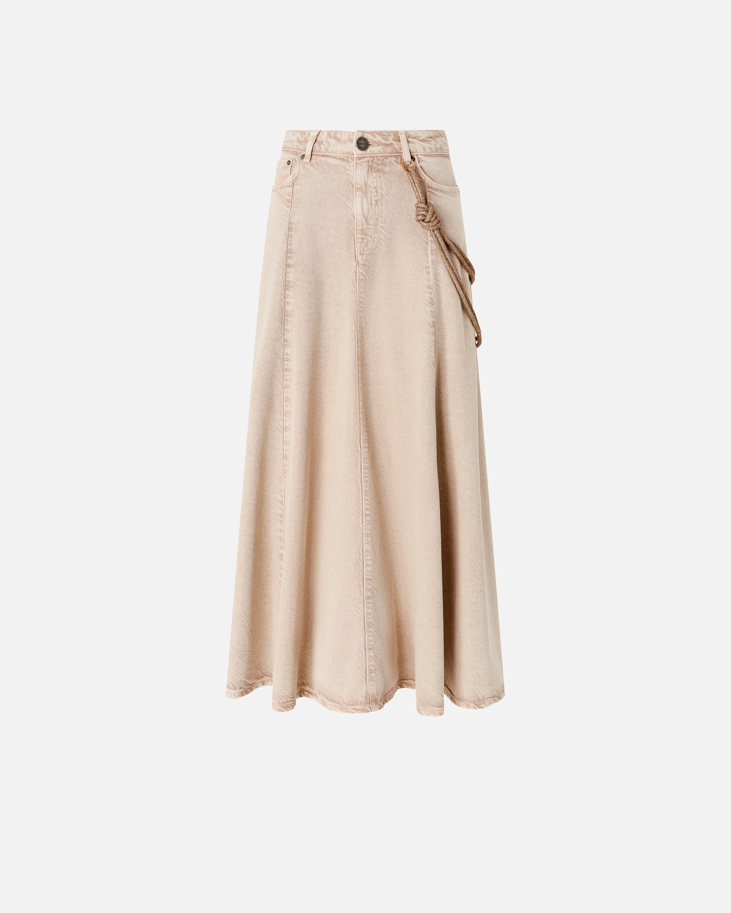 Gonna midi a cinque tasche realizzata in bull denim di cotone e lyocell dalla mano fluida e caratterizzata da una linea leggermente svasata con morbide pieghe sul fondo. Dotato di una comoda chiusura frontale con zip nascosta e bottone a vista, il modello è decorato da un dettaglio speciale: una corda gioiello rimovibile da attaccare al passante frontale e sul retro, illuminata da piccoli strass. Rifinisce il design il logo Love Birds ricamato in tono su una delle tasche posteriori. La gonna è ideale in abbinamento con una camicia per un outfit quotidiano dal touch femminile e personale, da indossare anche in ufficio. - HURGHADA GONNA