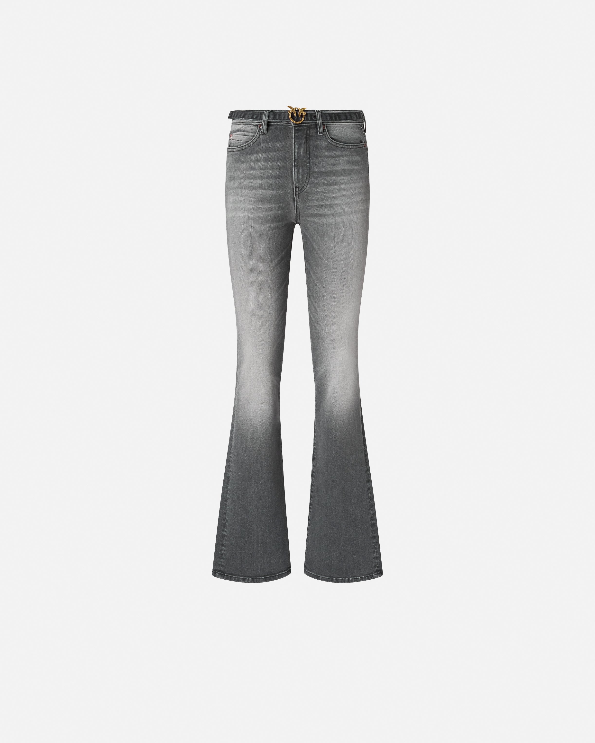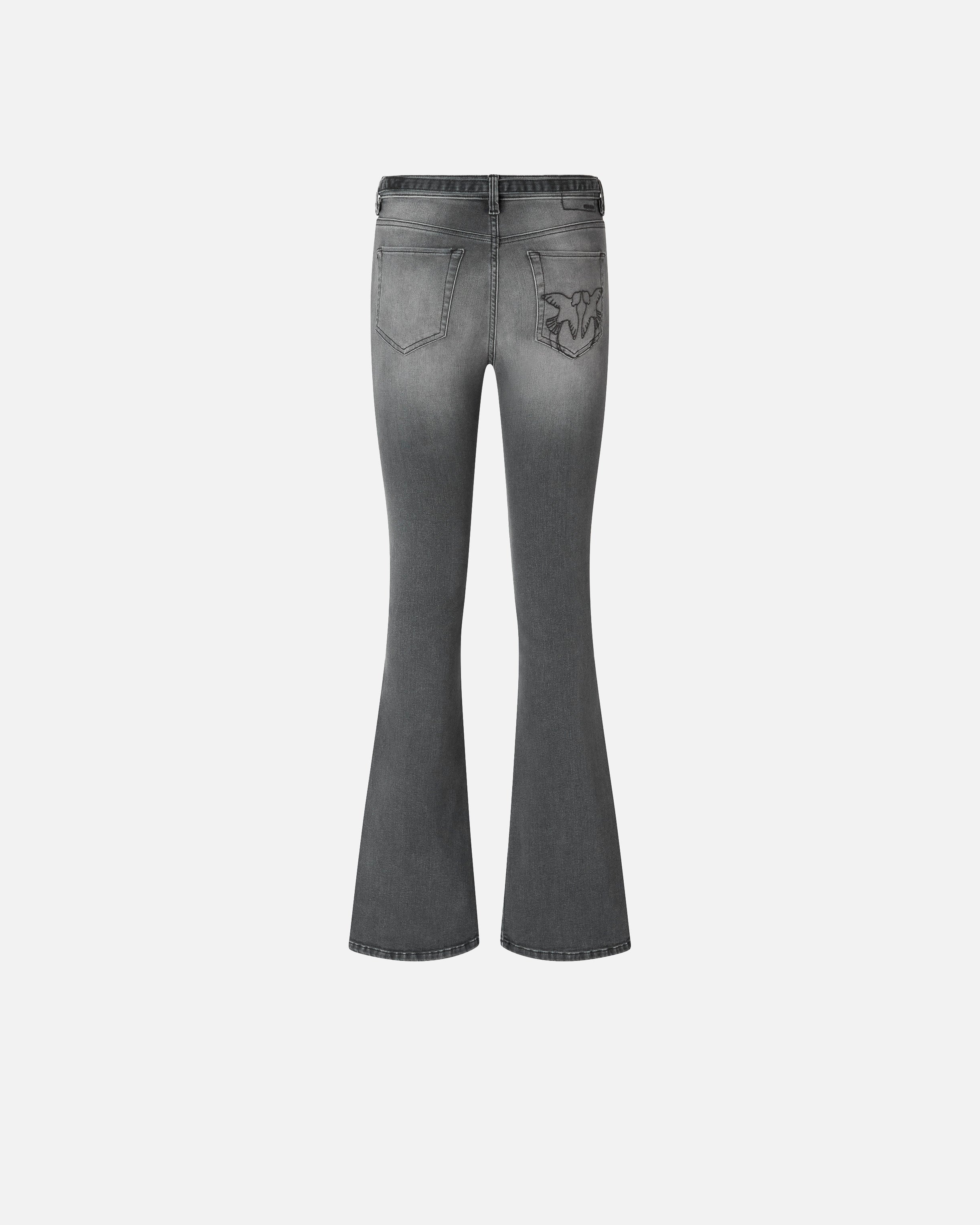 Jeans cinque tasche flared-fit, con gamba aderente fino al ginocchio e svasata al fondo, realizzati in power stretch denim grigio scuro di cotone parzialmente riciclato con scoloriture. La tela utilizzata è un denim high recovery che non si deforma facilmente e che conserva la sua tenuta originale nel tempo. A personalizzare il design in puro stile PINKO troviamo il logo lettering ricamato sul retrocinta, e il logo Love Birds, presente sotto forma di ricamo sulla tasca posteriore destra e sotto forma di rivetto sul quinto taschino. Completo di cintura abbinata nello stesso tessuto con fibbia Love Birds Diamond Cut in metallo. Vita media con passanti per cintura, chiusura con zip e bottone.