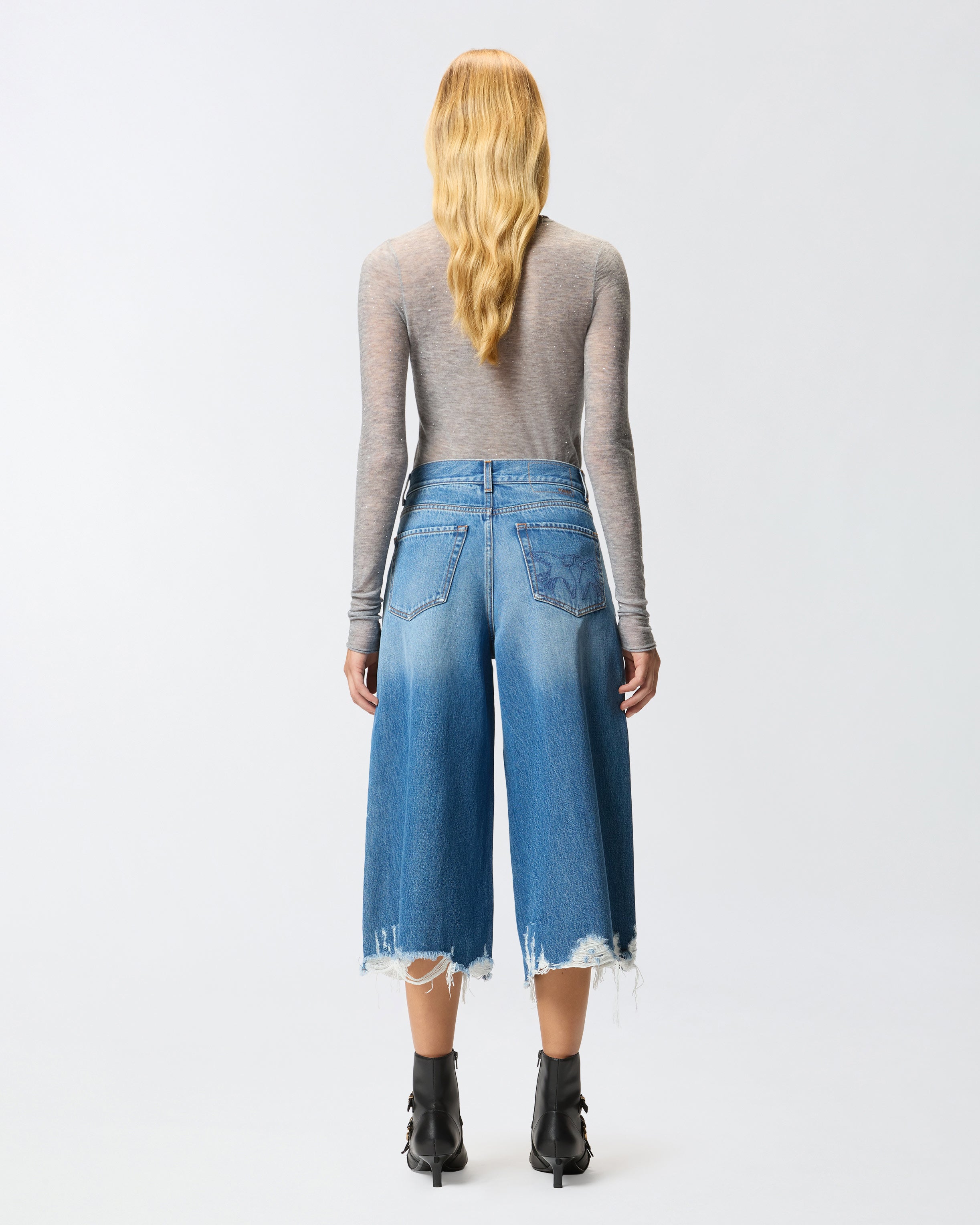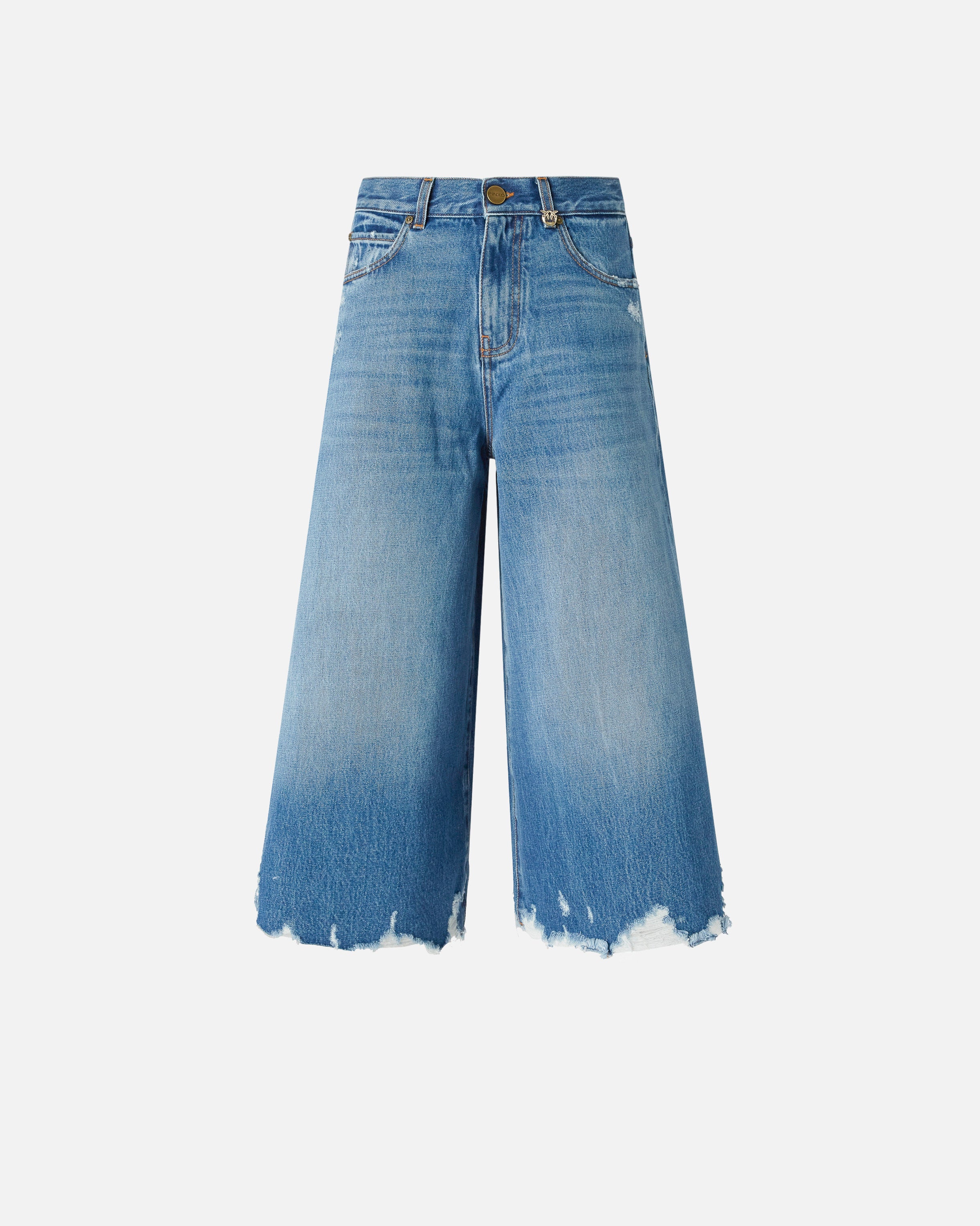 Bermuda lungo cinque tasche d'ispirazione anni 70 con gamba ampia dall'orlo sfilacciato manualmente per un effetto used, realizzato in denim fermo di cotone e trattato con lavaggio stone wash con stracci per creare contrasti di colore. A personalizzare il design in puro stile PINKO troviamo il logo lettering del brand ricamato sul retrocinta, il logo Love Birds con uccellini ricamati sulla tasca posteriore destra e il passante rimovibile con logo Love Birds. Indossa questi jeans corti con un paio di stivali alti per un look d'impatto anche durante la stagione fredda. Vita media con passanti per cintura, chiusura con zip e bottone.