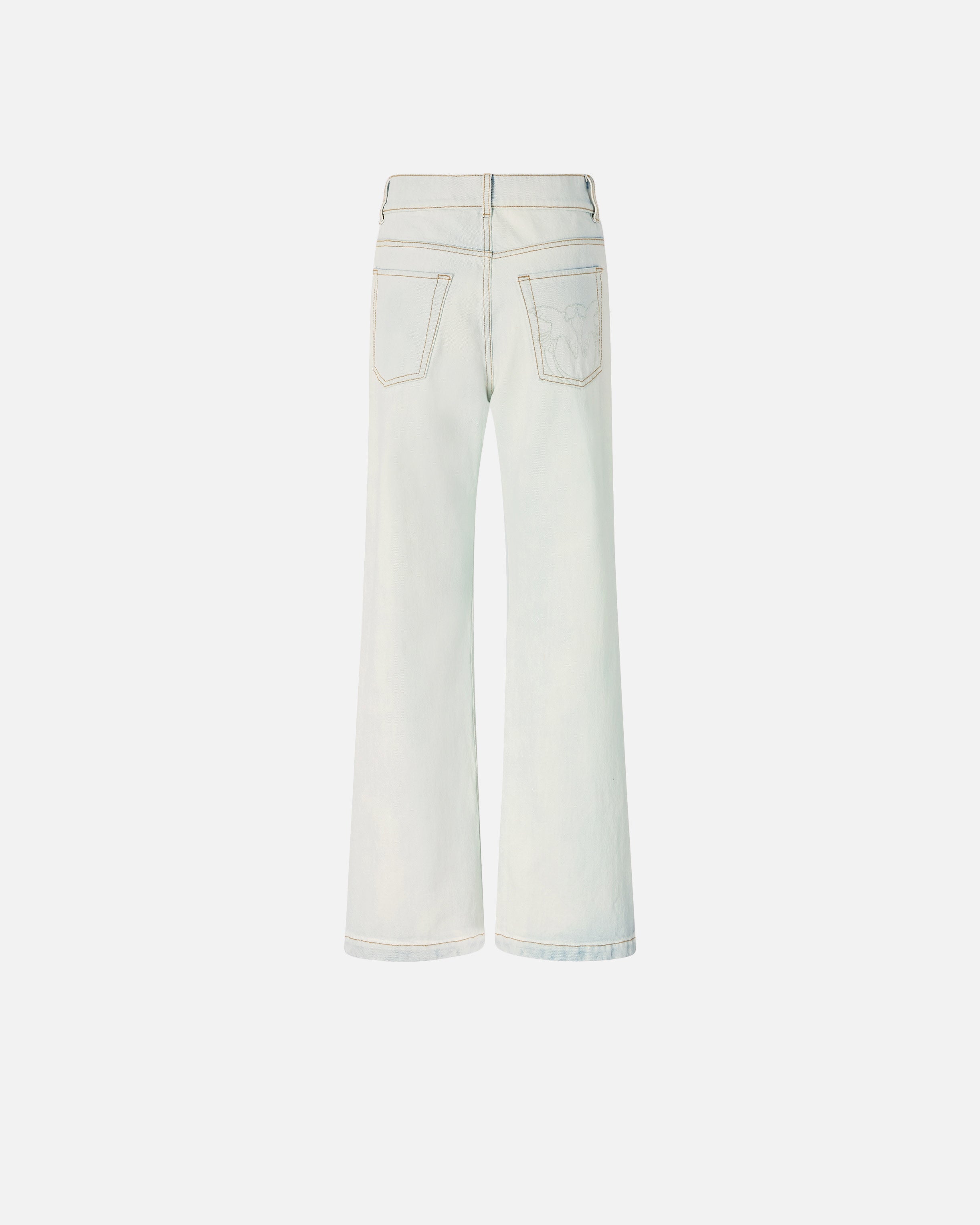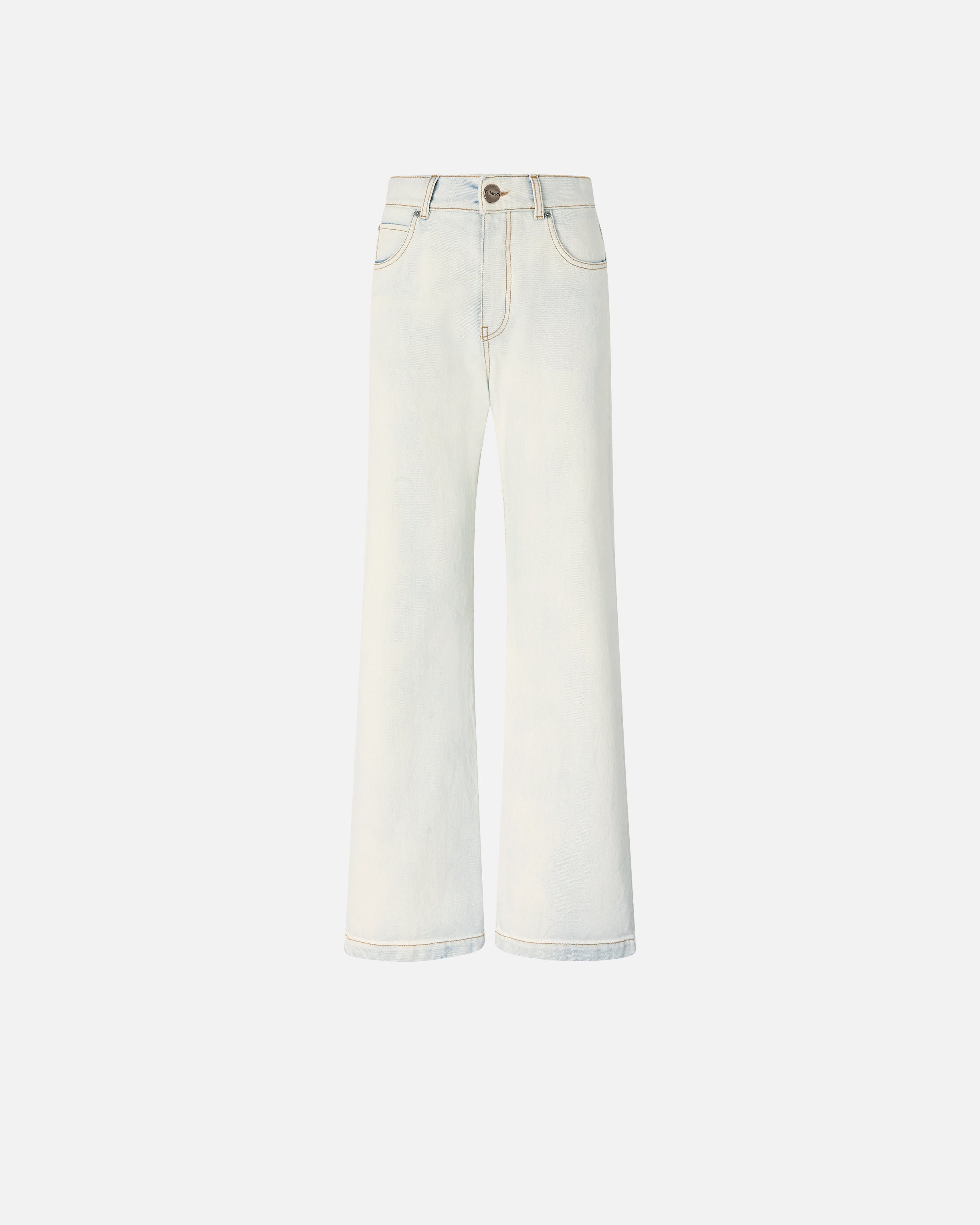 Jeans cinque tasche da donna con silhouette wide leg dalla gamba dritta e ampia con fondo risvoltato fisso. Il capo è realizzato in denim di puro cotone con lavaggio super bleached per ottenere una tonalità bianco ottico su tutta la superficie, tranne per l'interno vita e il risvolto a fondo gamba, che creano così un effetto cromatico a contrasto. Grazie alla zip più corta, al gancio interno e al bottone a pressione il modello può essere indossato in due modi: a vita media, per un look più classico, o a vita bassa risvoltata per un raffinato tocco di originalità in puro stile PINKO. A personalizzare il design non potevano mancare gli iconici simboli del brand: il logo Love Birds laserato su una delle tasche posteriori e il logo lettering PINKO che rifinisce il retro dell'interno vita.