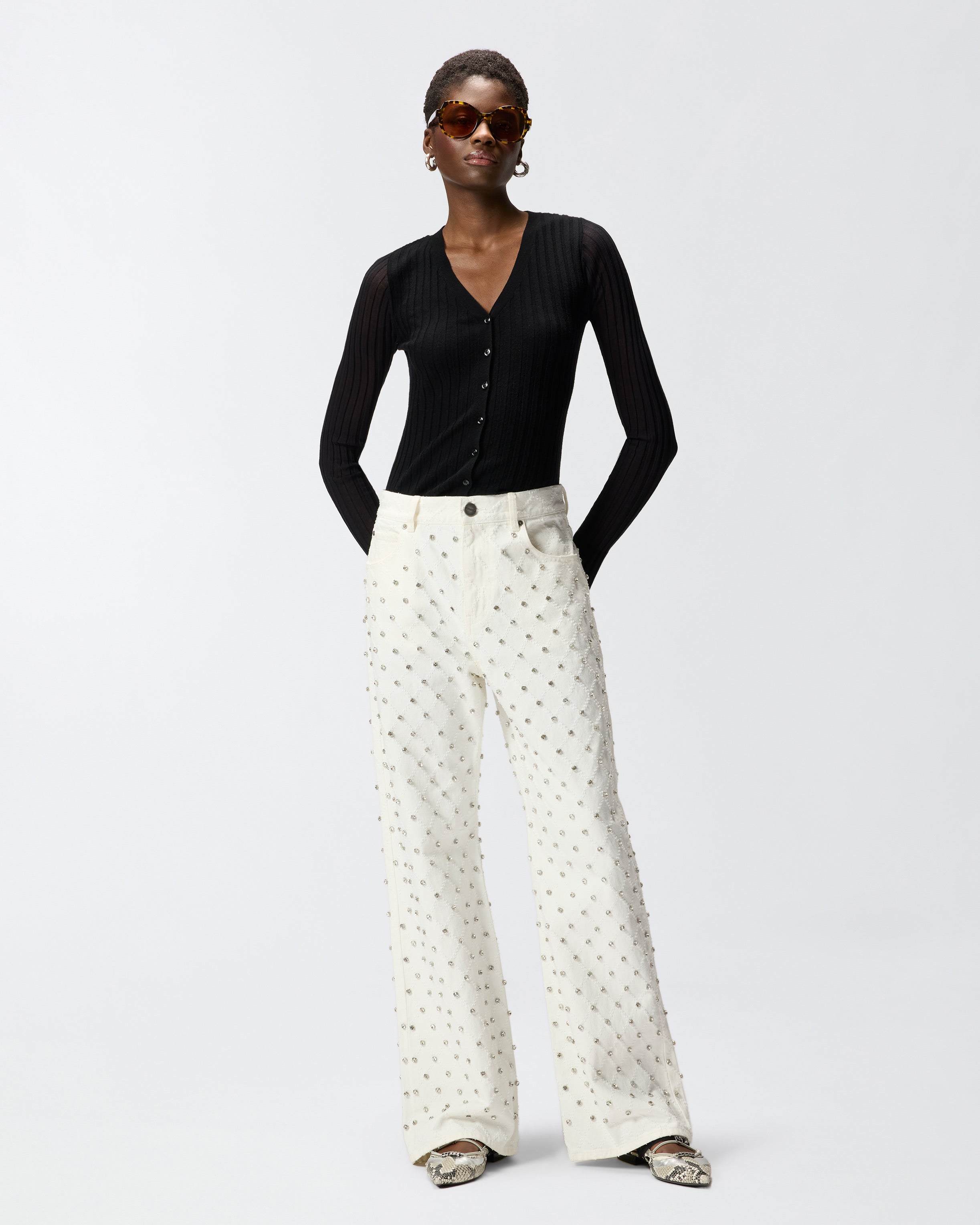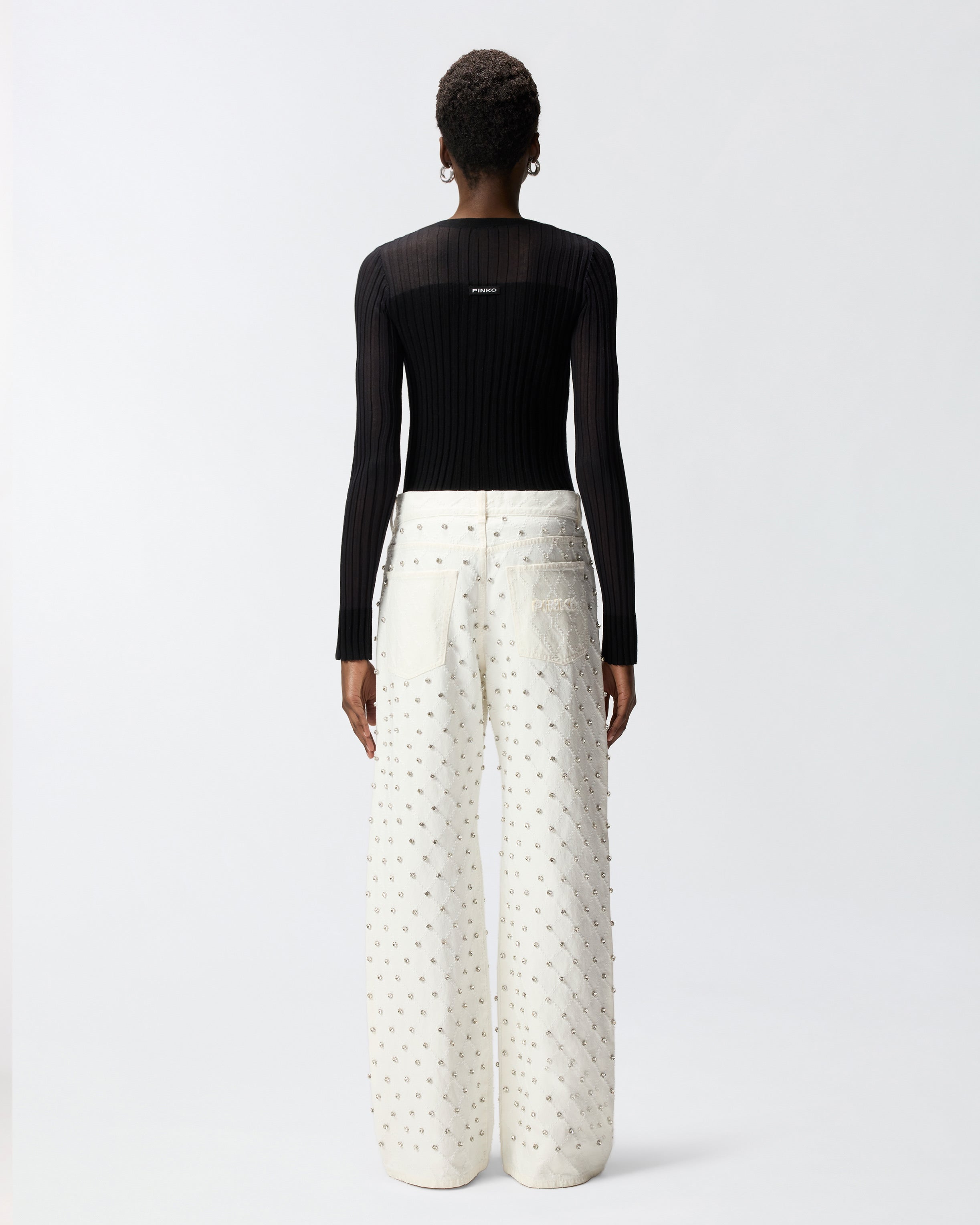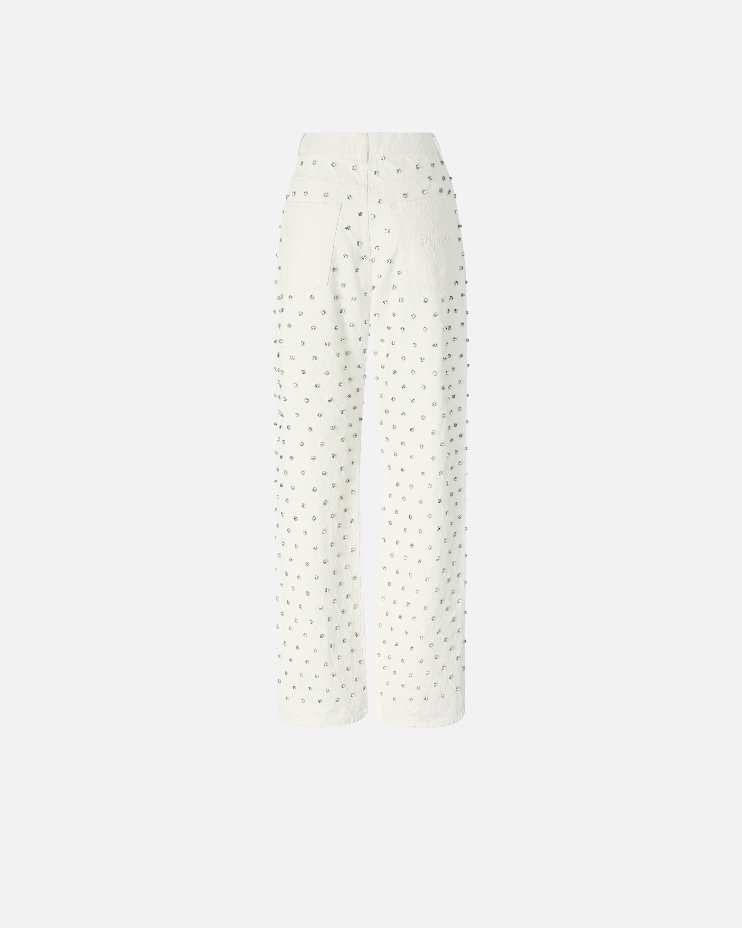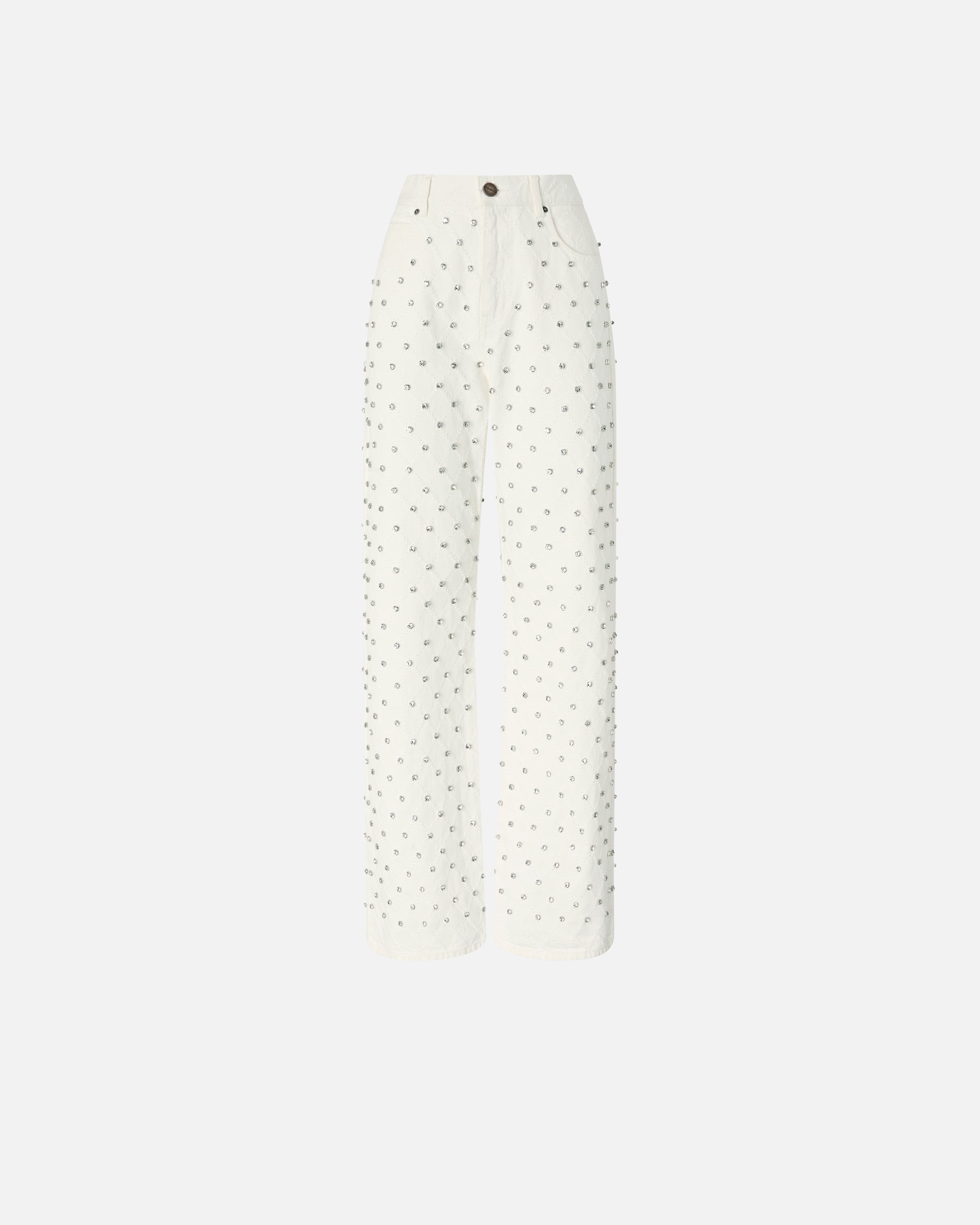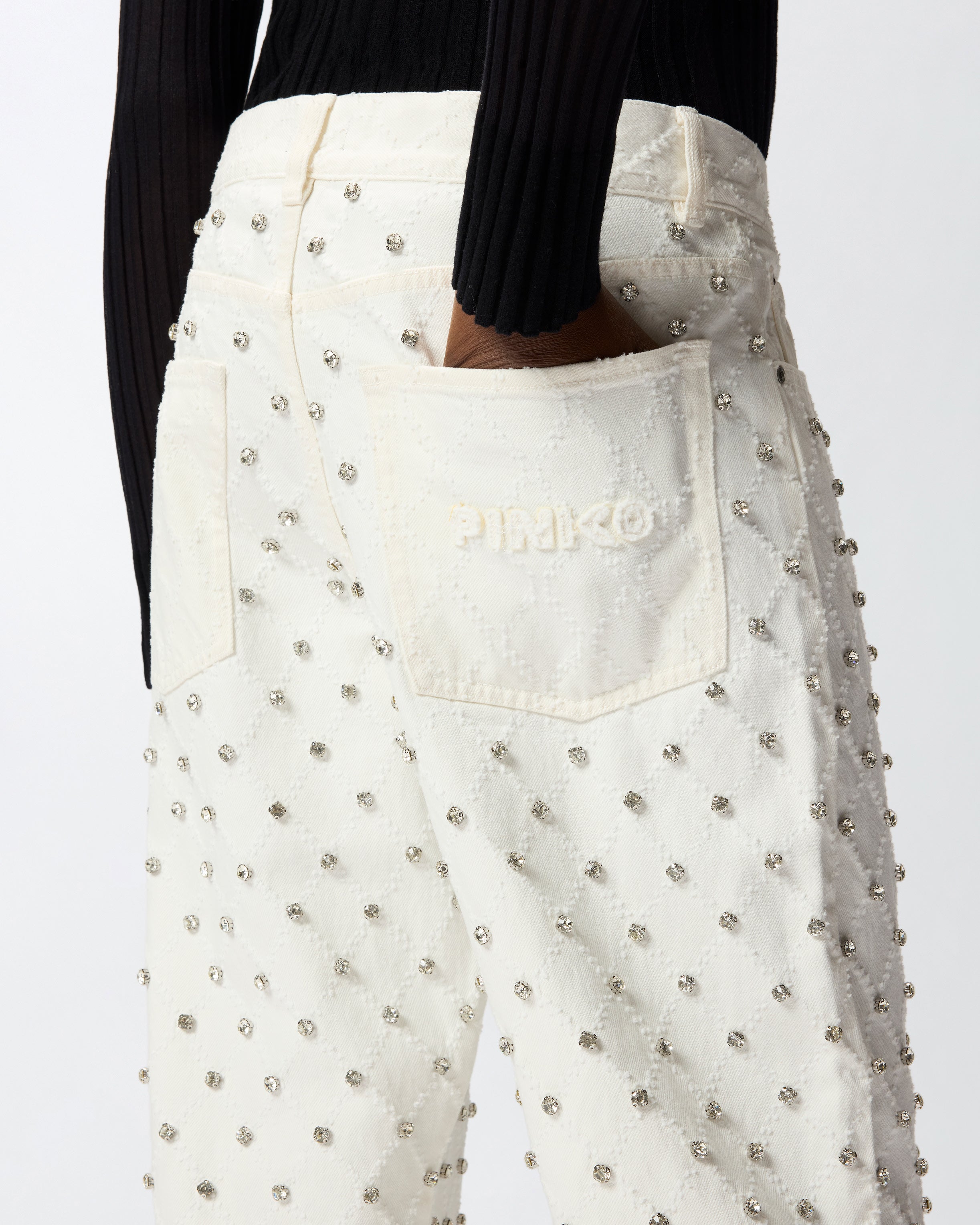 Jeans cinque tasche wide leg realizzati in denim di puro cotone e rifiniti dal logo lettering PINKO leggermente sfrangiato su una delle tasche posteriori. Il modello punta su un contemporaneo gioco di contrasti, come solo PINKO sa fare: il minimalismo del design si combina infatti con il motivo a rombi laserato leggermente a contrasto, arricchito da luminosi strass ricamati a mano. Indossa questo capo con un cardigan a contrasto e preparati a far brillare i tuoi look quotidiani! - WANDA WIDE LEG