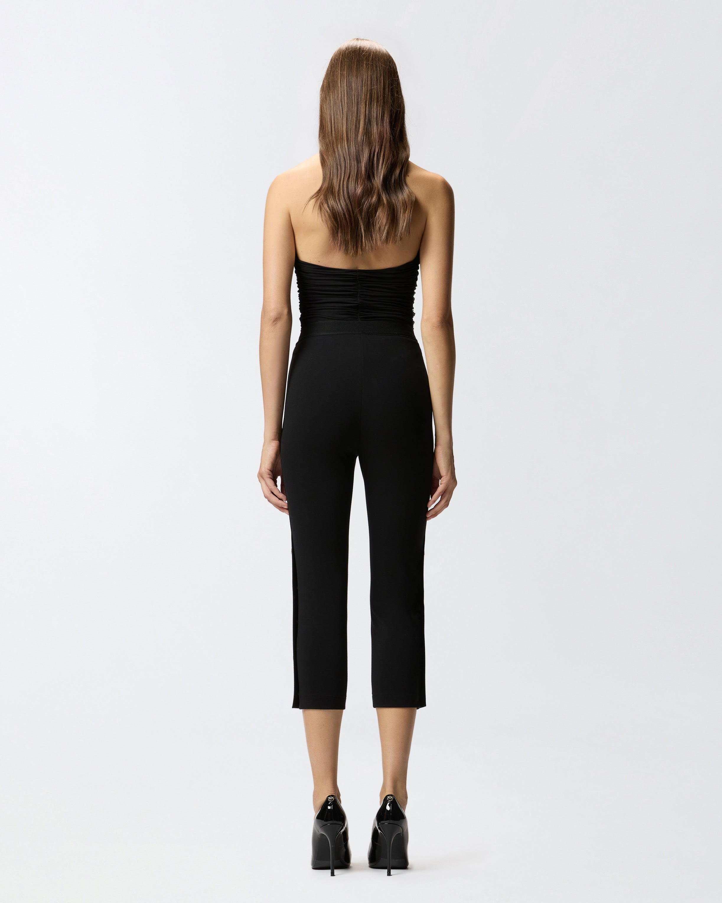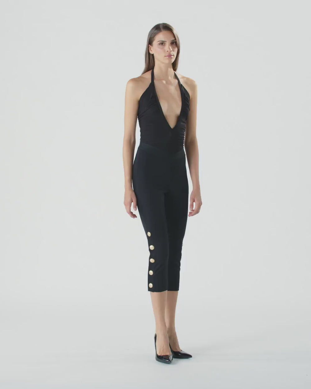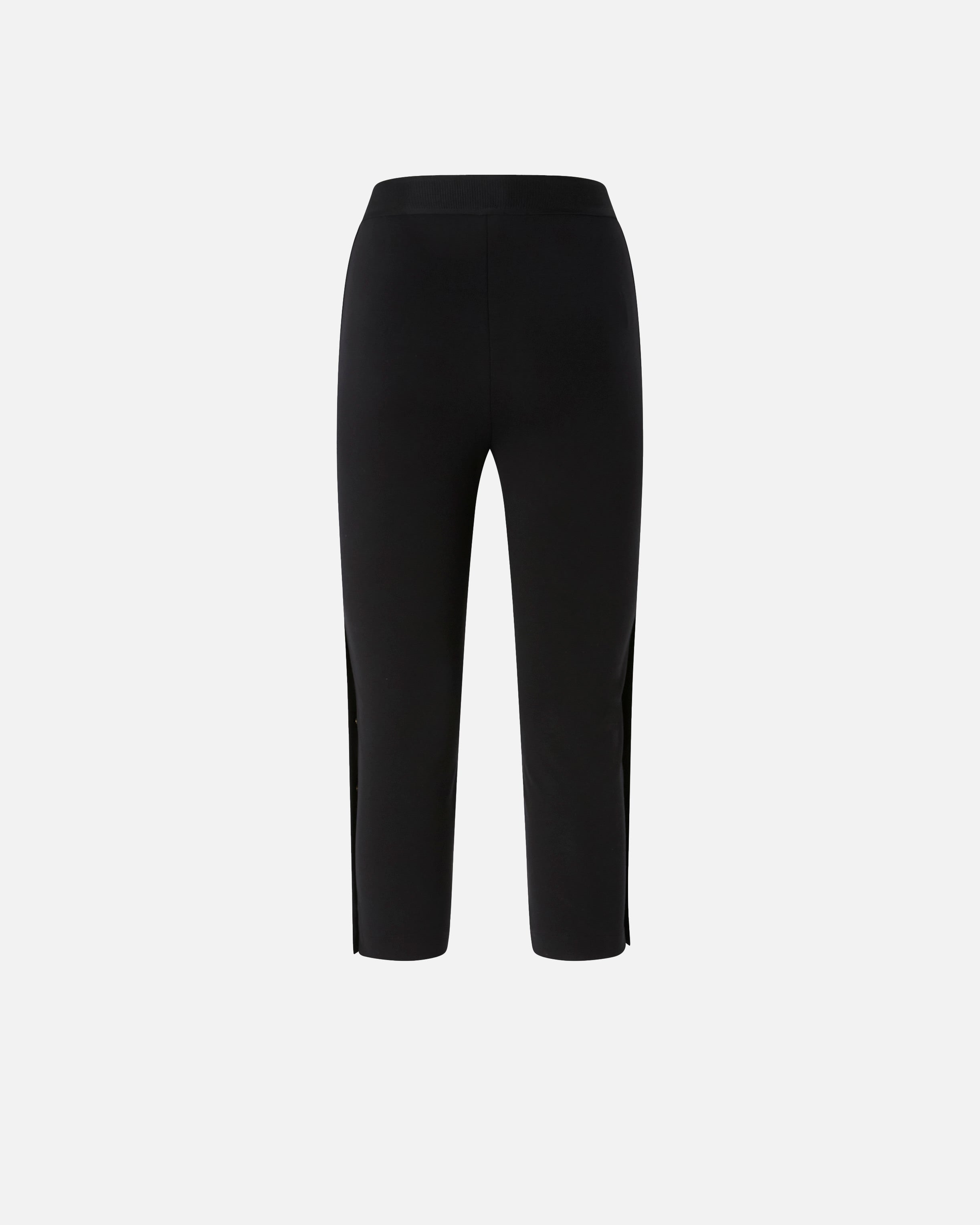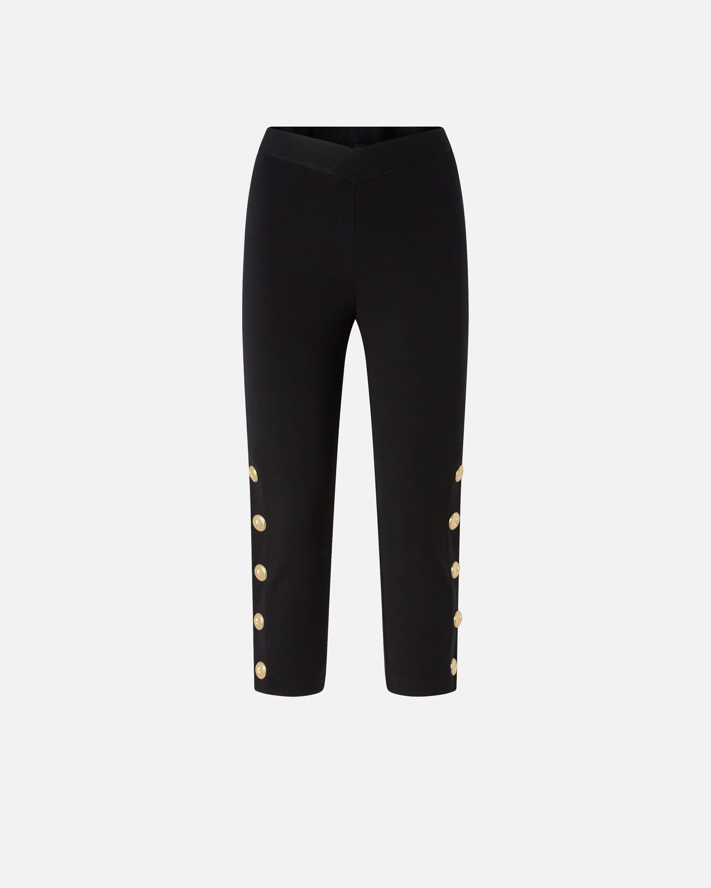 Leggings a vita alta in tessuto tecnico di viscosa stretch lavorato a punto stoffa. Il modello dalla vestibilità skinny, piuttosto aderente, è caratterizzato da una comoda vita elasticizzata leggermente a V sul davanti, ed è impreziosito da una fila di bottoni metallici decorati da stella sul lato esterno della gamba, per un tocco personalizzato in puro stile PINKO.