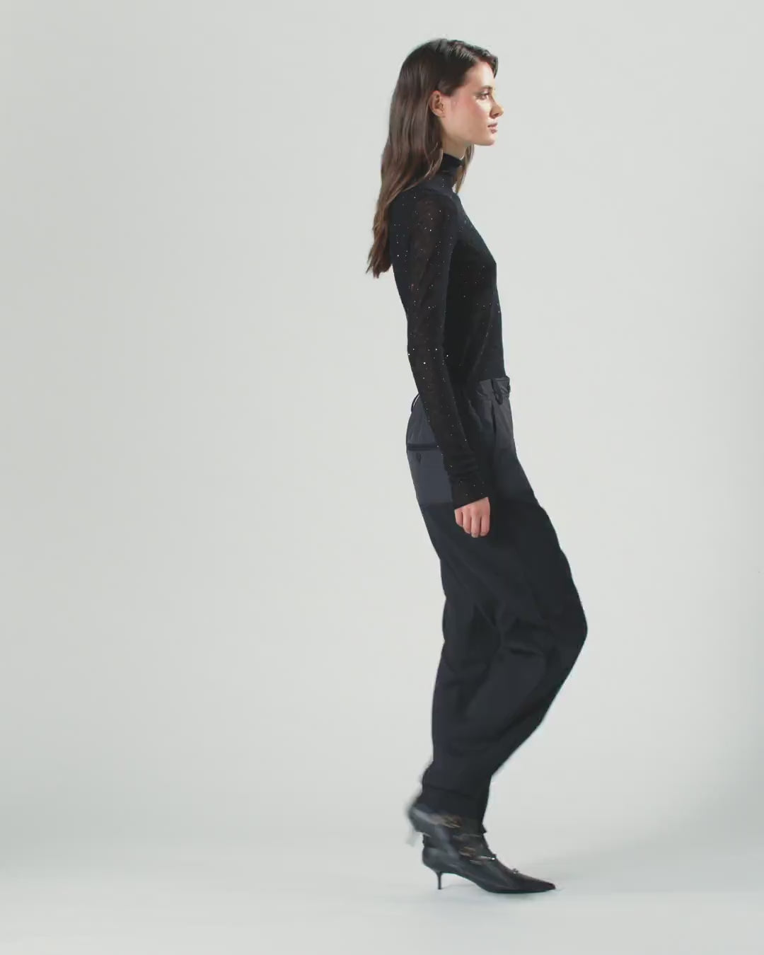 Maglia a maniche lunghe realizzata in misto lana semitrasparente: un filato leggero e morbido, quasi impalpabile, che contribuisce a creare un look sensuale e originale. Il design è impreziosito da micro paillettes inserite nel filo e riesce nell'impresa di risultare luminoso e al tempo stesso essenziale e molto comodo all'indosso. La linea aderente della maglia a collo alto è completata dall'etichetta logata nel centro dietro. Il capo è stato sottoposto a prove di finissaggio per ridurre al minimo la possibile formazione di pilling, garantendo una maggiore morbidezza e durabilità del tessuto.