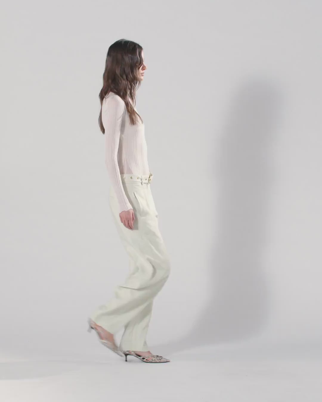 Maglia body a maniche lunghe lavorata a costine e realizzata in morbida e leggera maglia di misto lana, seta e cashmere, con maniche e inserti superiori intarsiati in misto cotone dall'elegante effetto trasparente. Il tocco finale è dato dall'etichetta con logo lettering PINKO in jacquard sul retro. Essenziale e contemporaneo, questo modello diventerà un vero e proprio passe-partout del tuo guardaroba.
