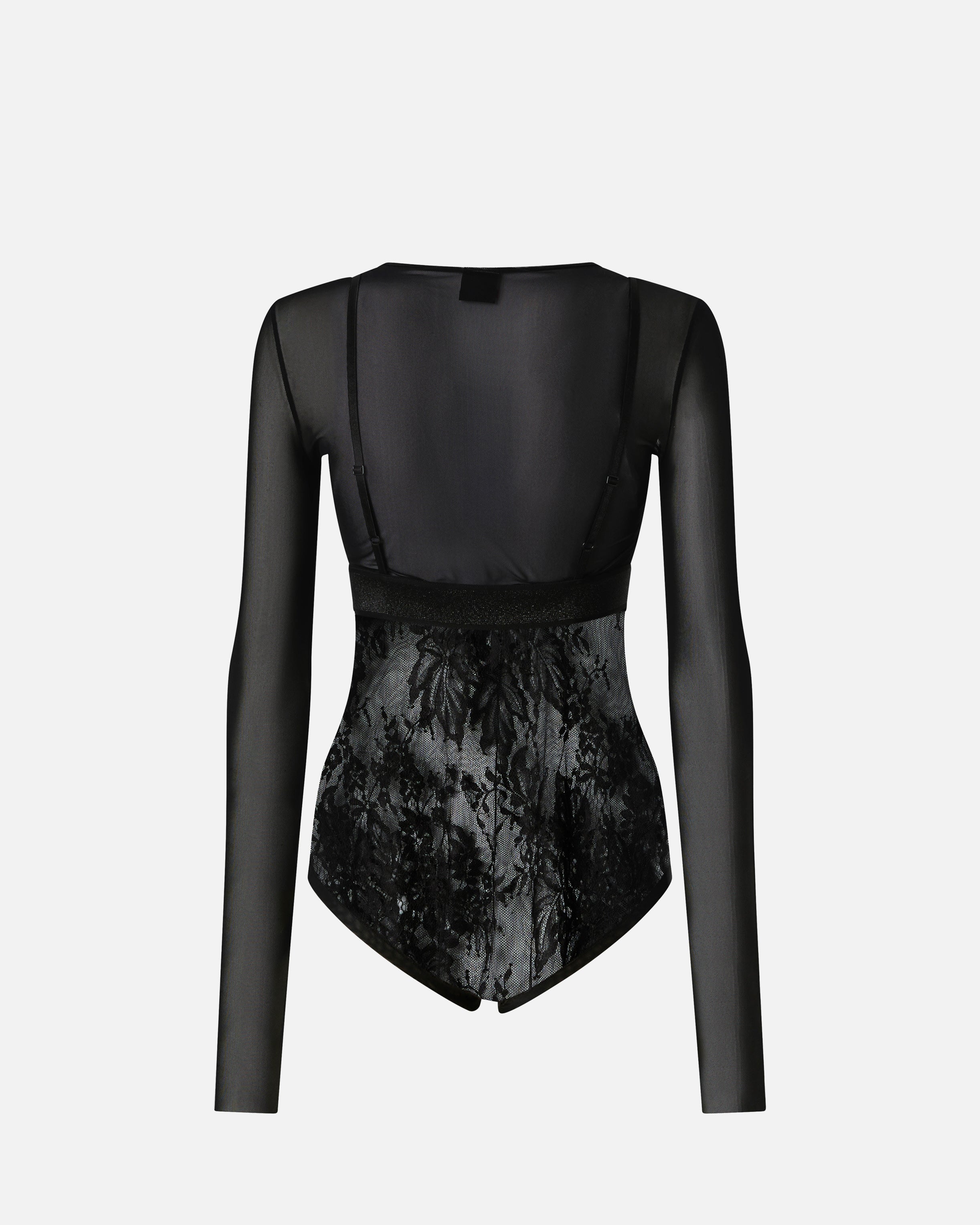 Maglia body a maniche lunghe in tulle caratterizzata da un inserto a reggiseno con spalline sottili regolabili e fascia sotto il seno elastica impreziosita da dettagli luminosi. Il reggiseno e la parte inferiore del capo sono arricchiti da una delicata lavorazione in pizzo floreale Valencienne semitrasparente, che abbraccia il corpo simulando una lingerie femminile. L'eleganza senza tempo del pizzo e la sensualità del vedo non vedo si uniscono al comfort della componente stretch, per un design audace e femminile dalla vestibilità impeccabile. Chiusura con tre bottoni a pressione a fondo capo.