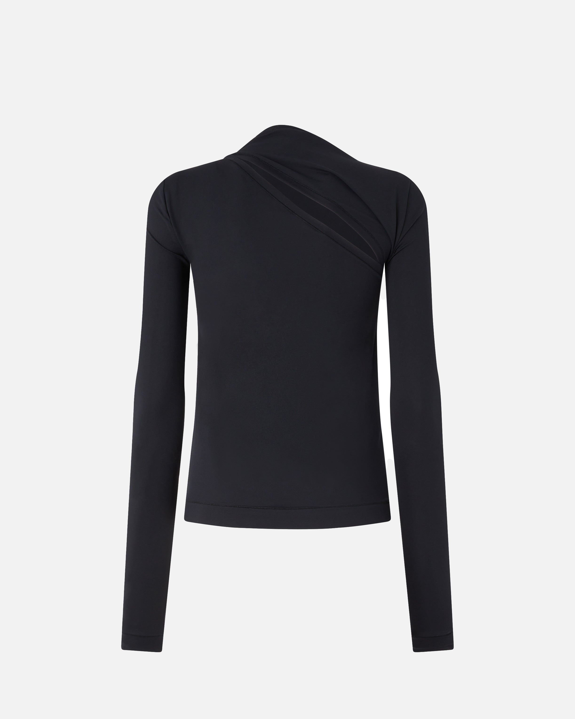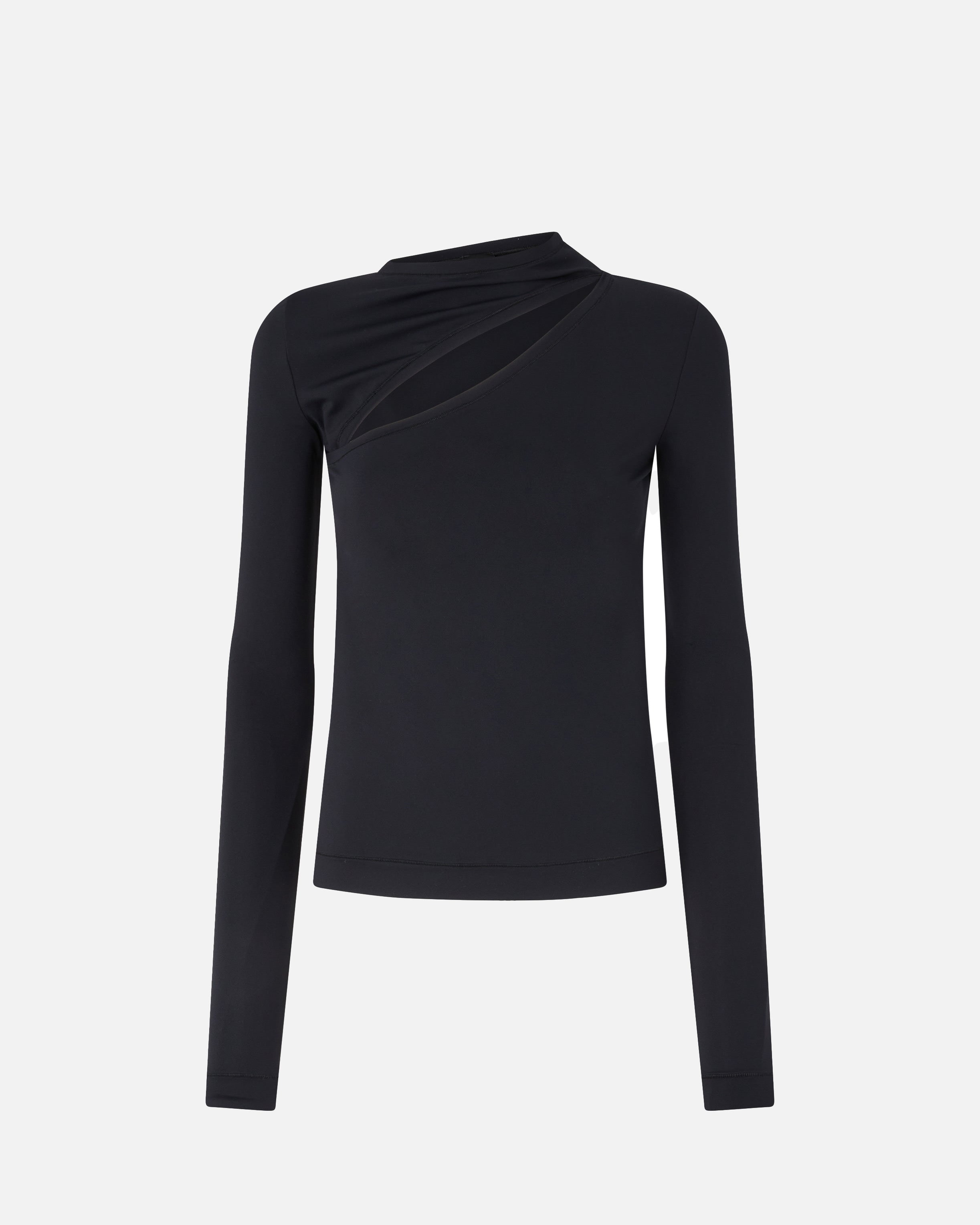 Maglia a maniche lunghe realizzata in tessuto stretch indemagliabile e accoppiato, che dona un effetto seconda pelle a chi lo indossa. La vestibilità aderente del capo lo rende estremamente femminile e sensuale... ma il dettaglio che catalizza l'attenzione è il cut-out obliquo sul petto, tanto semplice quanto d'effetto. Essenziale, versatile e raffinato, indossalo con un paio di jeans per un appuntamento o un aperitivo post-ufficio.