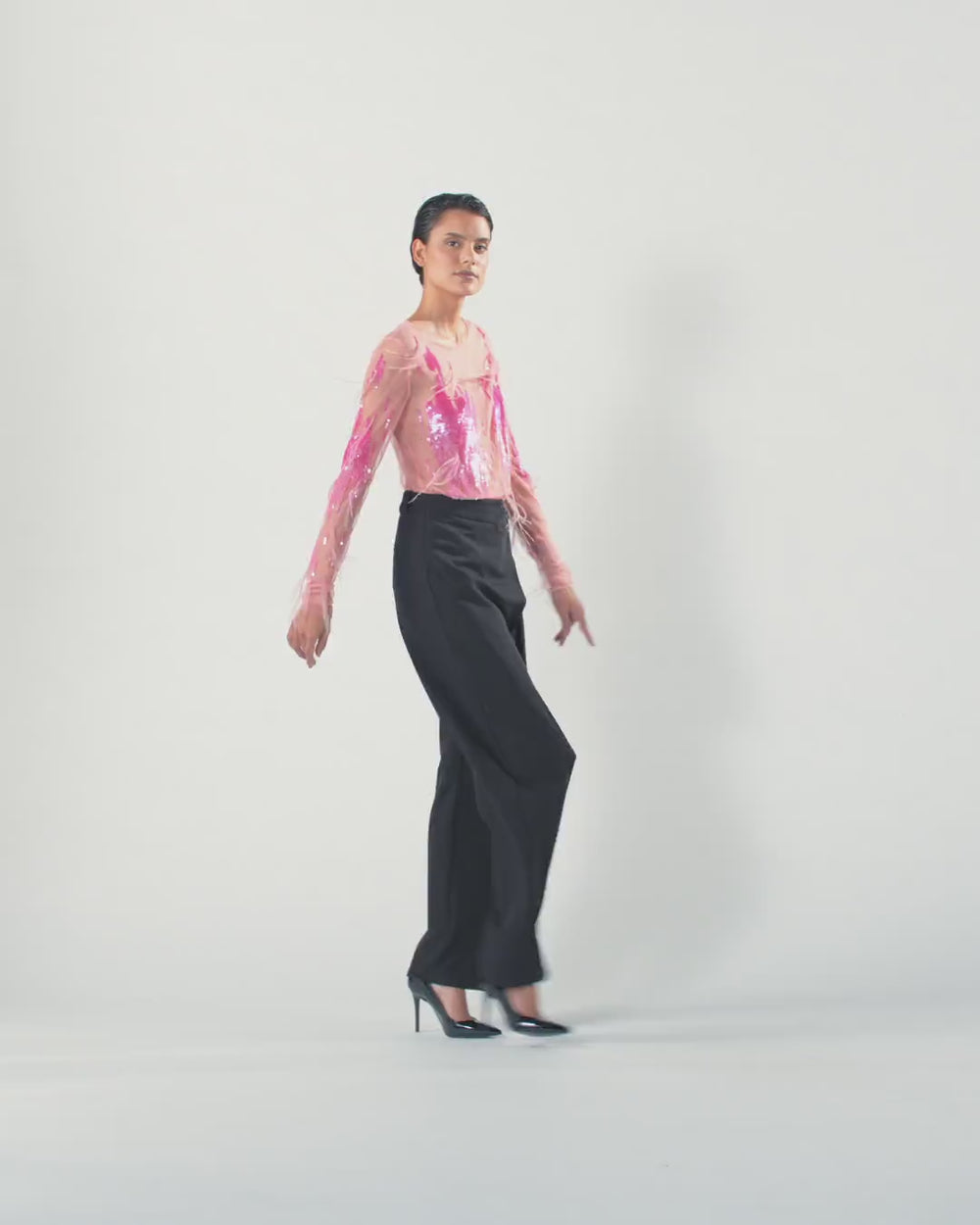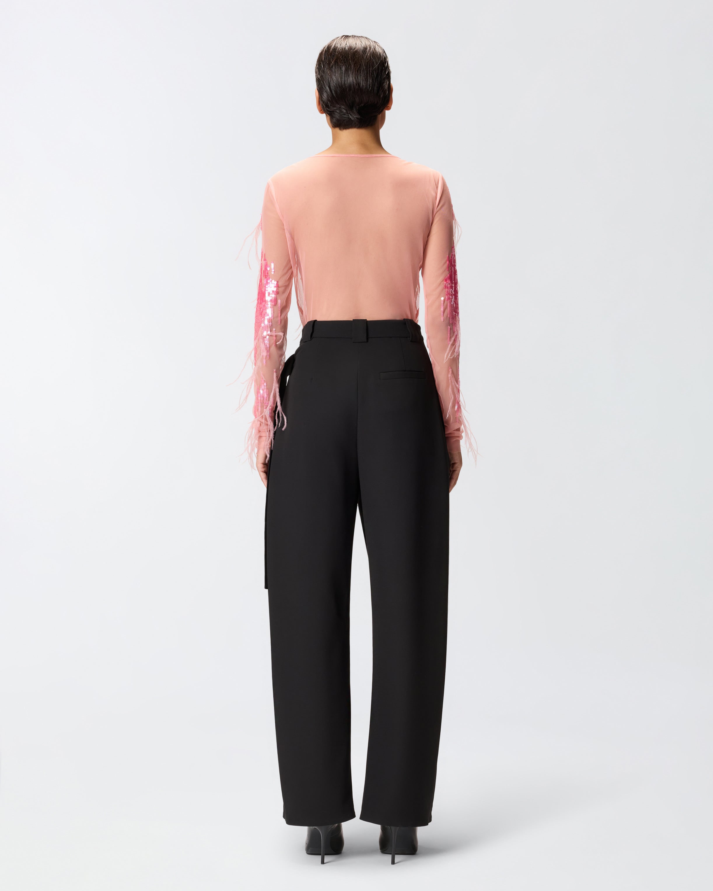 Maglia aderente a maniche lunghe e scollo tondo realizzata in tulle trasparente. Il design è impreziosito da paillettes ricamate a mano e inserti in piume per un look da vera star. Il ricamo di paillettes, di diverse sfumature e disposte in un raffinato effetto dégradé, adorna la superficie creando un gioco di colori e riflessi cangianti. La lavorazione artigianale esalta la silhouette, avvolgendo il corpo con eleganza, e il gioco di texture tra paillettes e piume aggiunge un tocco di lusso e femminilità.